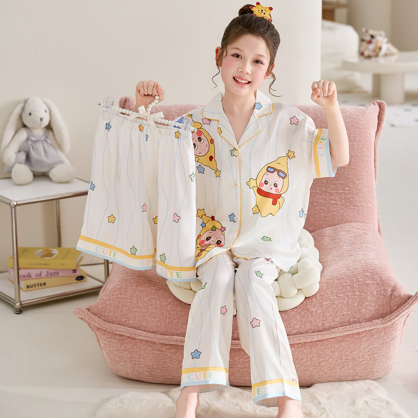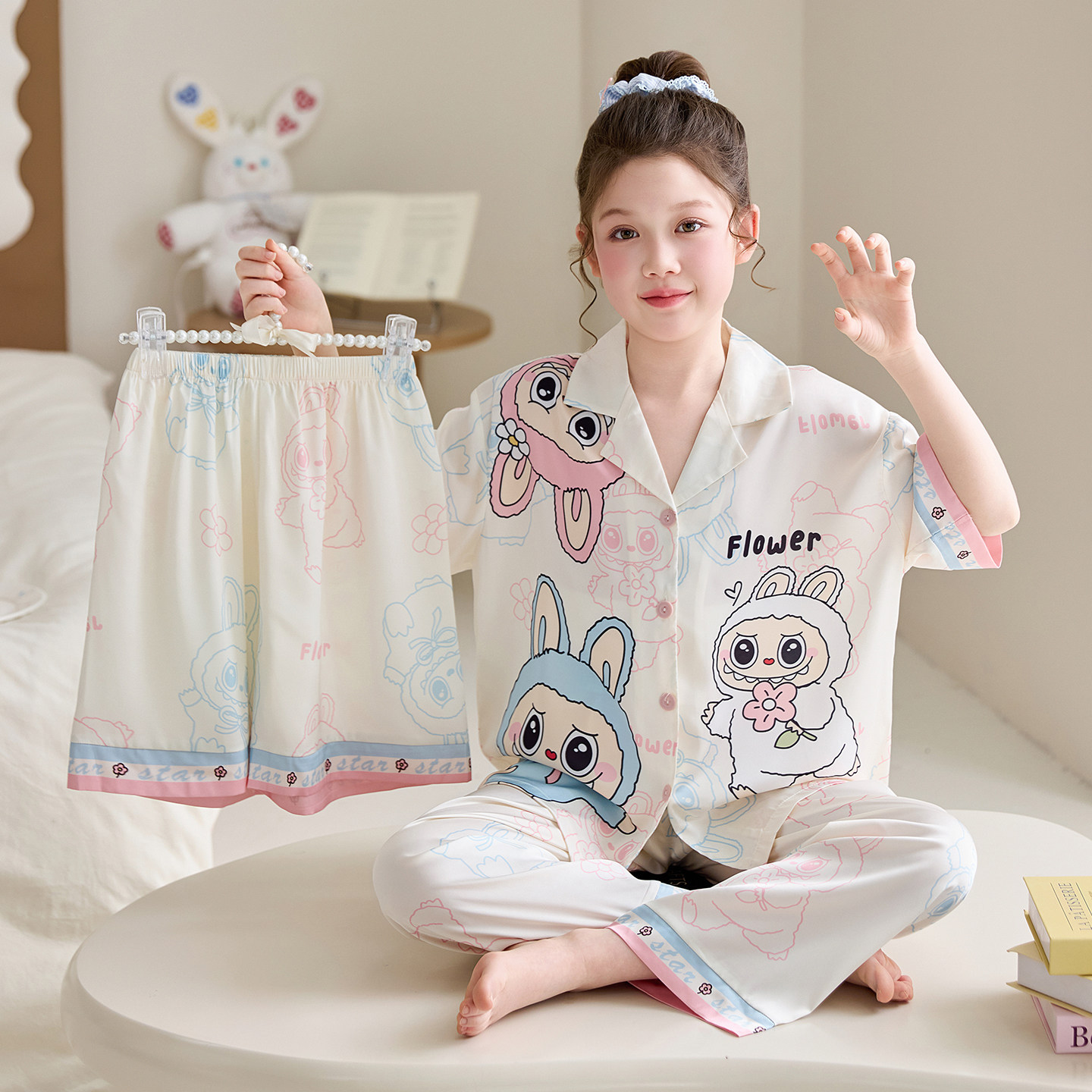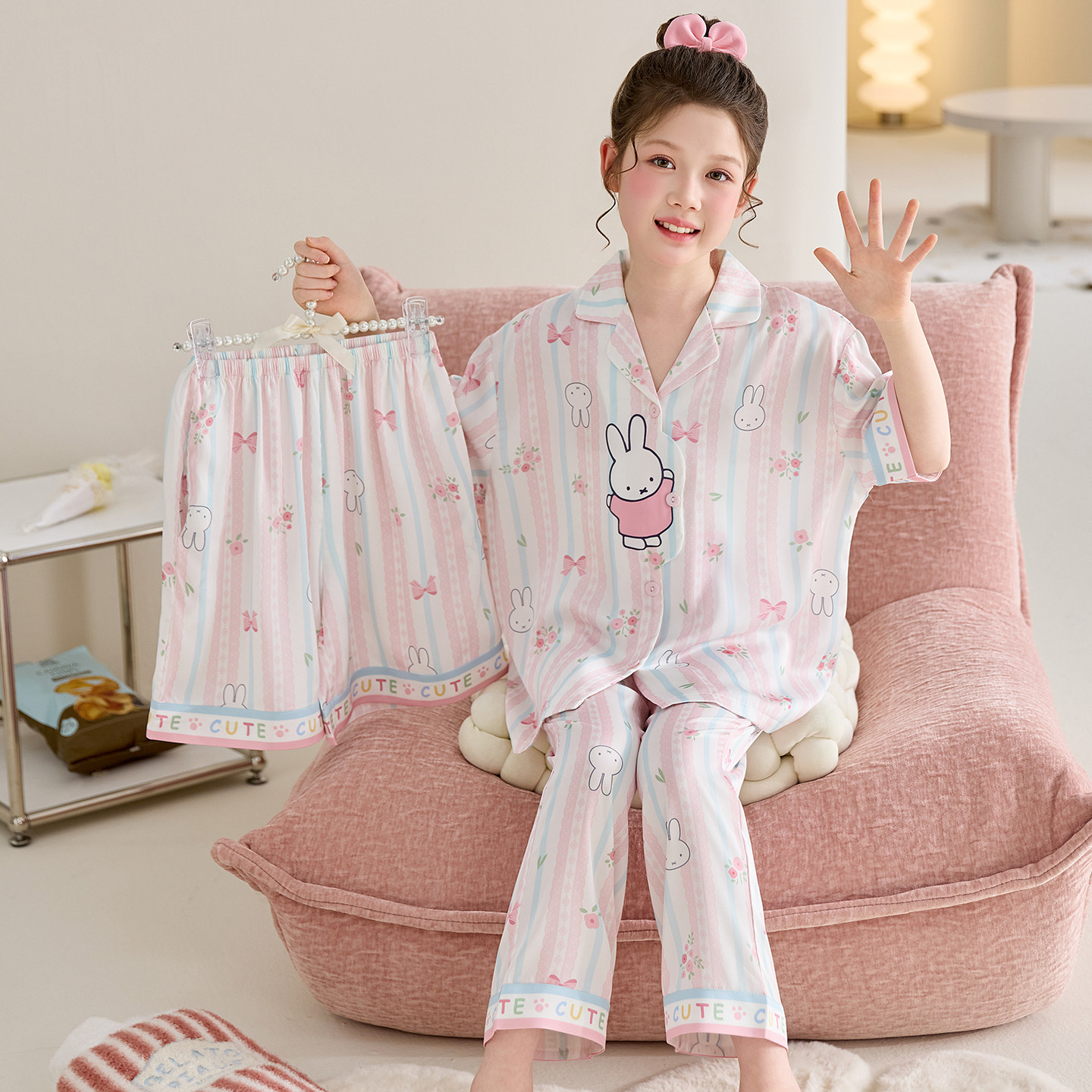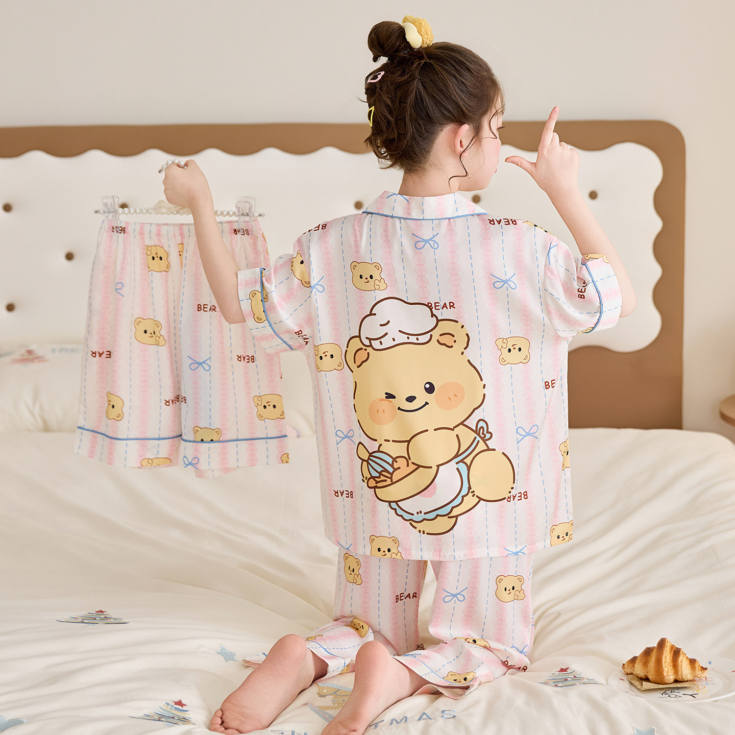 어린이 잠옷 아이스 실크 여름 얇은 3종 세트 여아 반팔 긴바지 큰아이 여아 홈웨어 2026 여름 스타일스토어 가기
