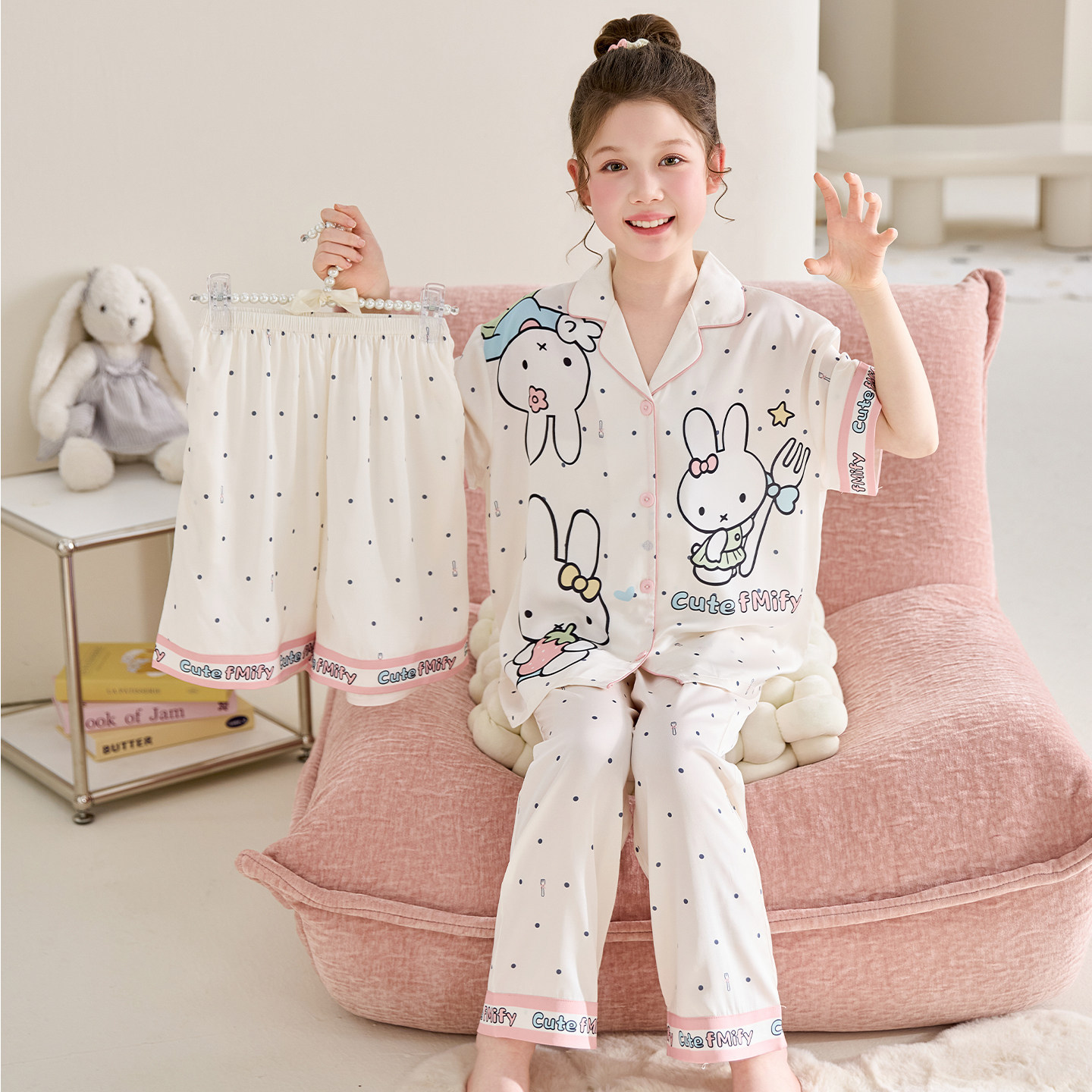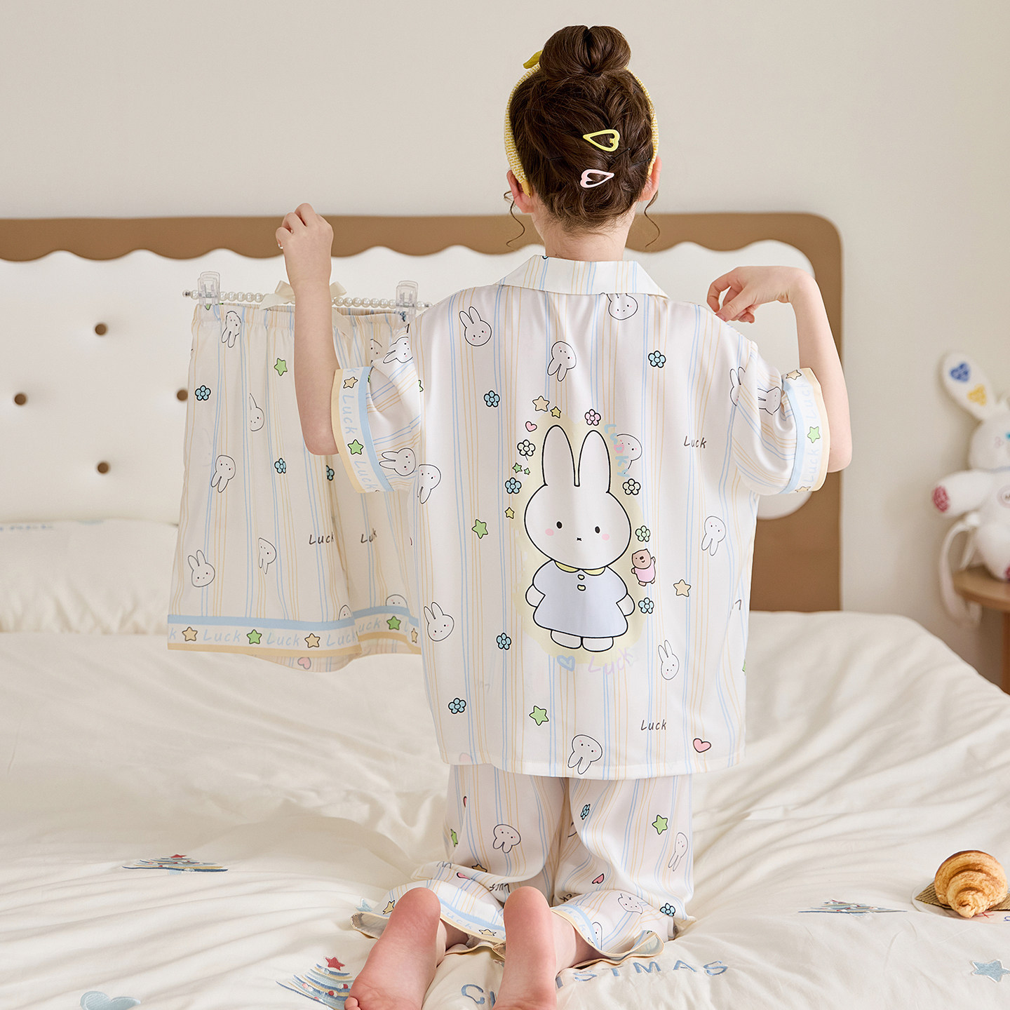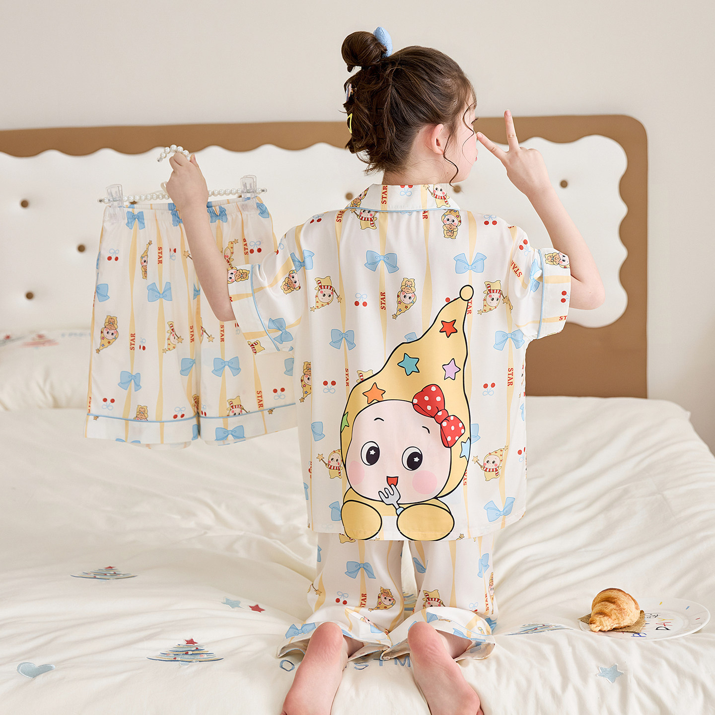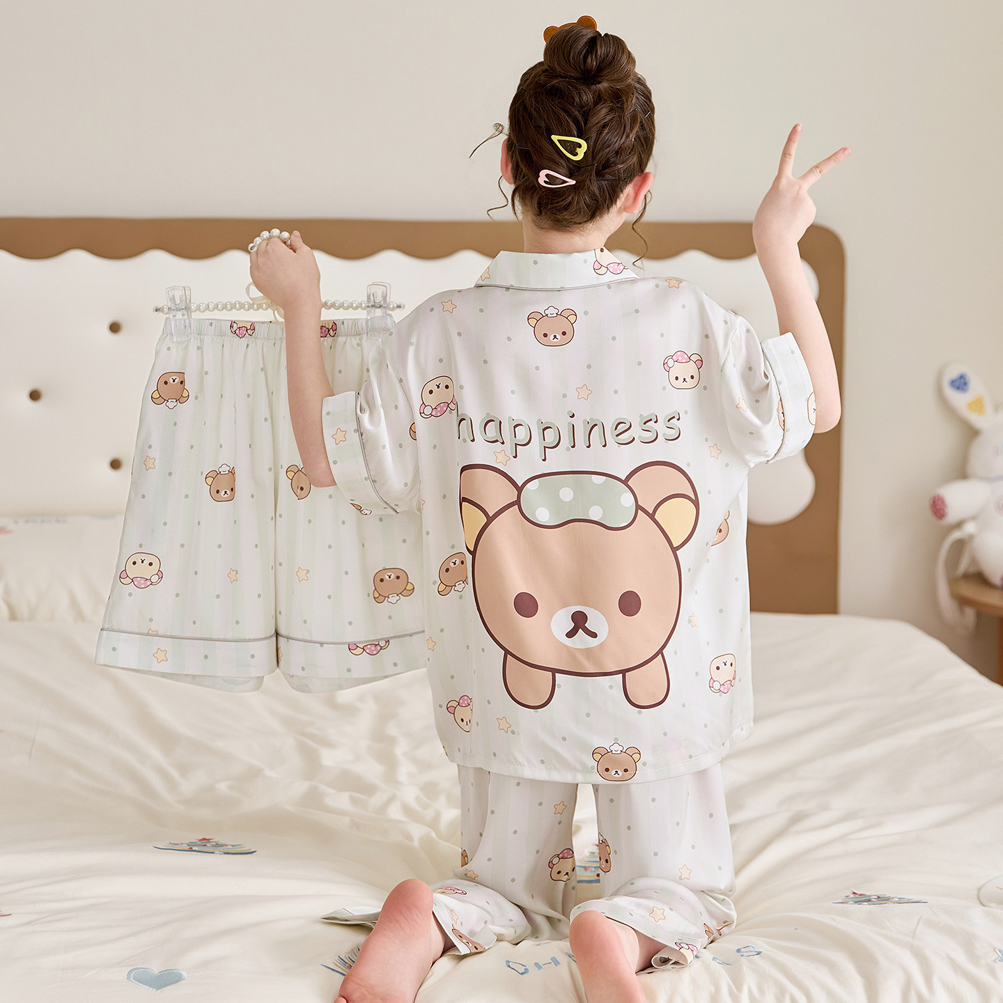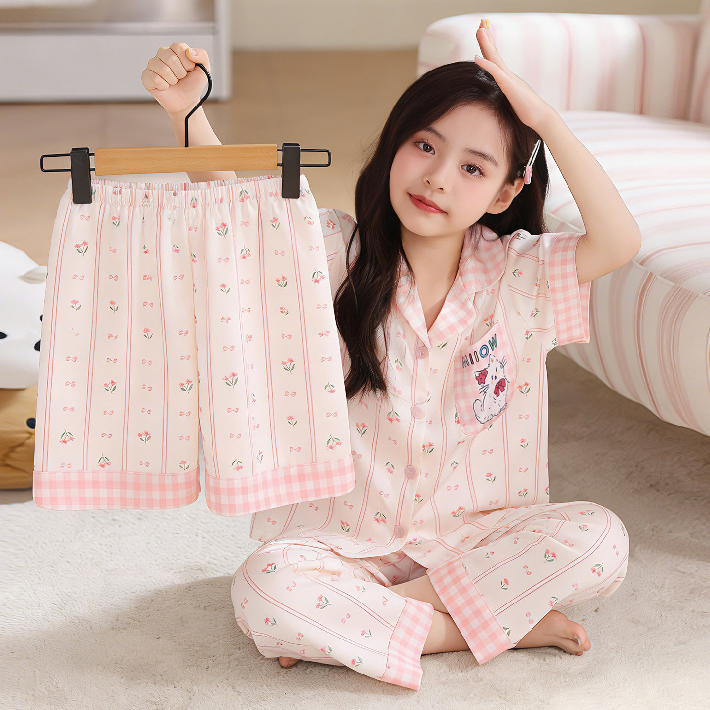 어린이 잠옷 아이스 실크 여름 얇은 3종 세트 여아 반팔 긴바지 큰아이 여아 홈웨어 2026 여름 스타일스토어 가기