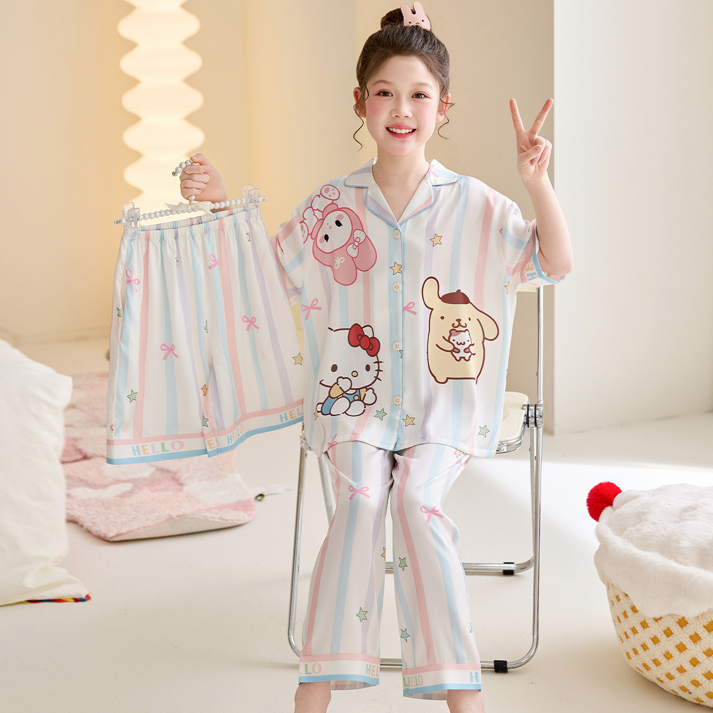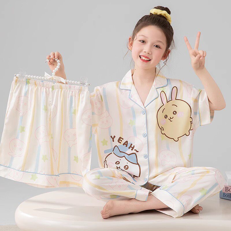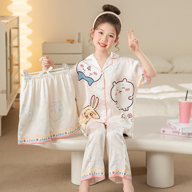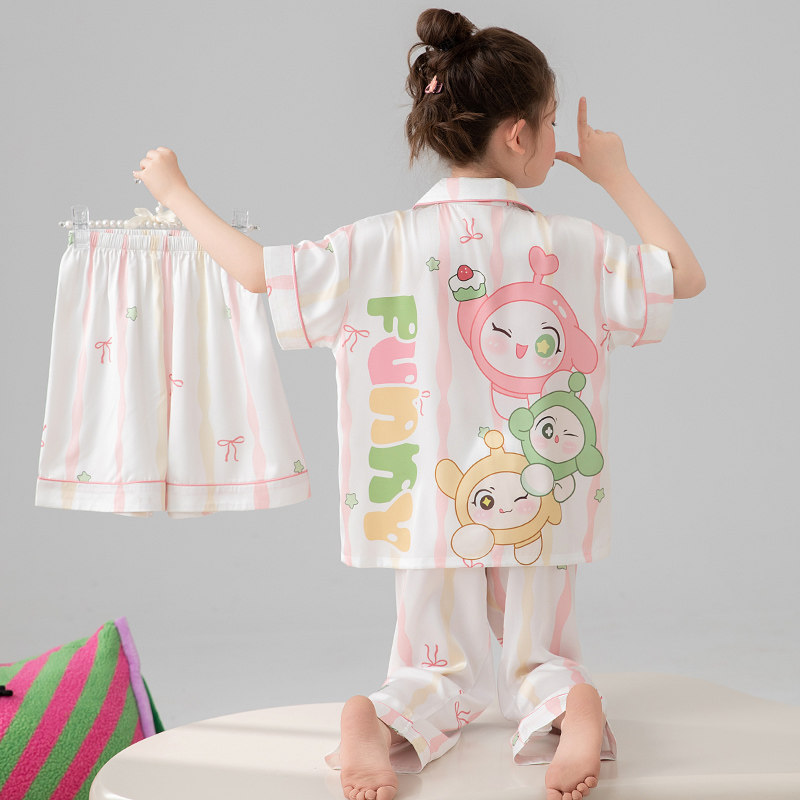어린이 잠옷 아이스 실크 여름 얇은 3종 세트 여아 반팔 긴바지 큰아이 여아 홈웨어 2026 여름 스타일