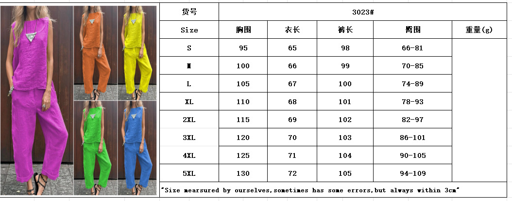 2025 봄과 여름 새로운 면화와 린넨 패션 캐주얼 느슨한 투피스 민소매 탑 느슨한 바지 여성 정장