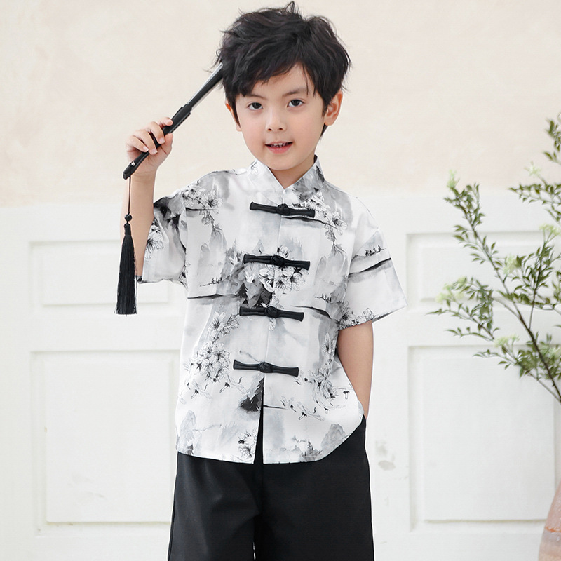 소년 Hanfu 정장 2025 새로운 어린이 당나라 정장 새로운 중국 스타일 국가 스타일 반팔 셔츠 캐주얼 얇은 탑 반바지