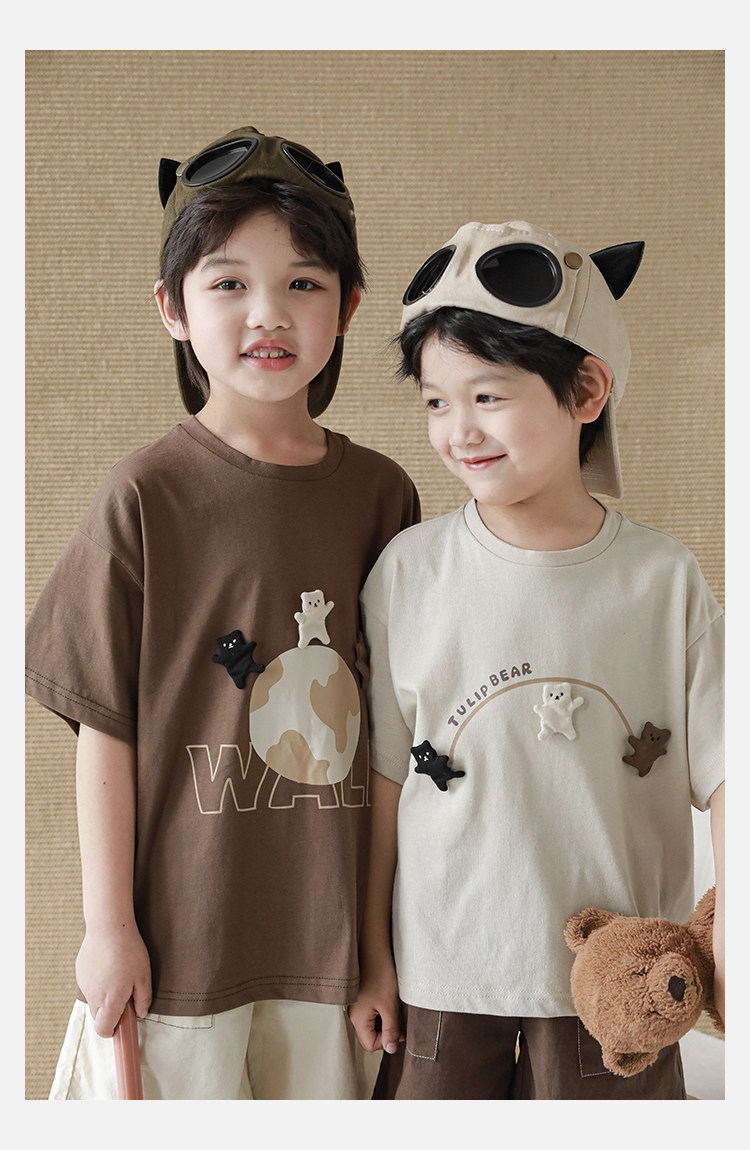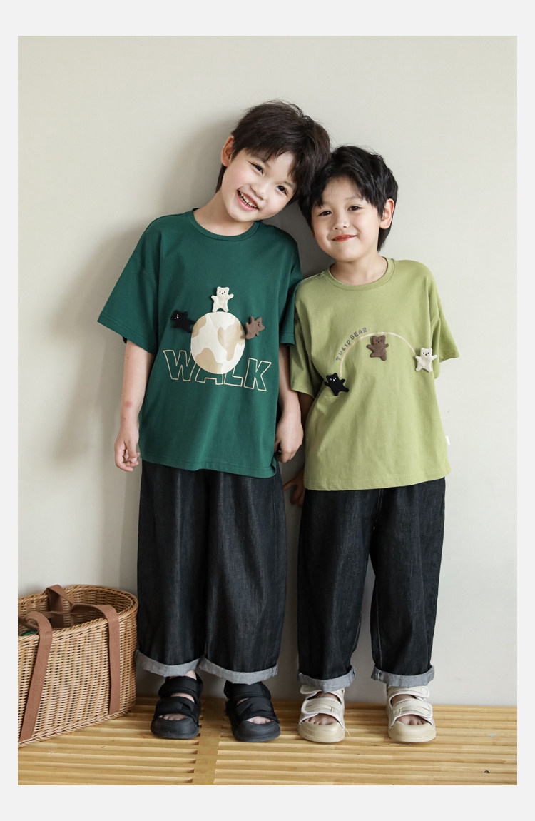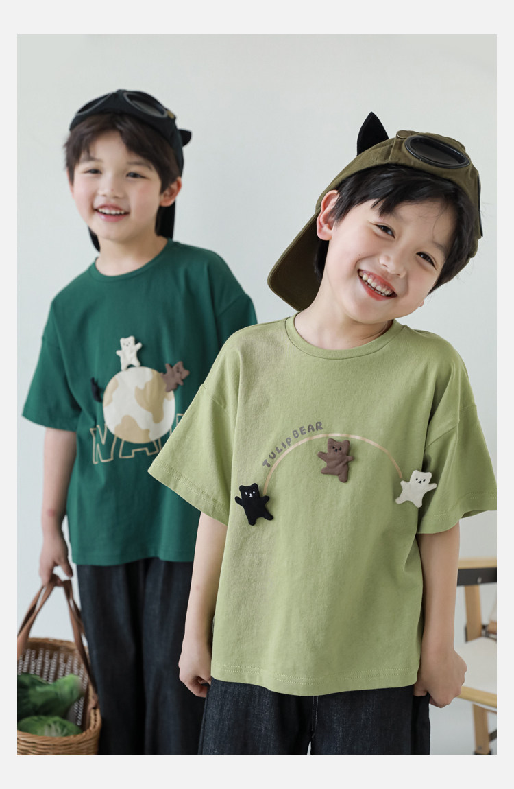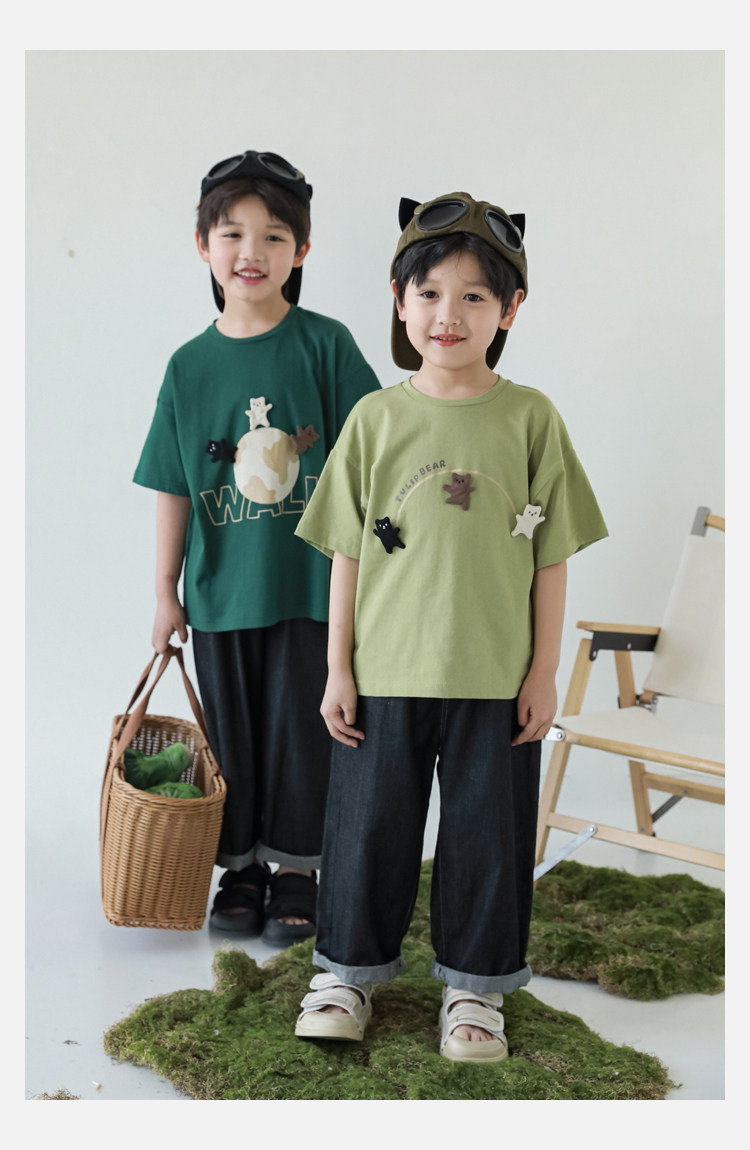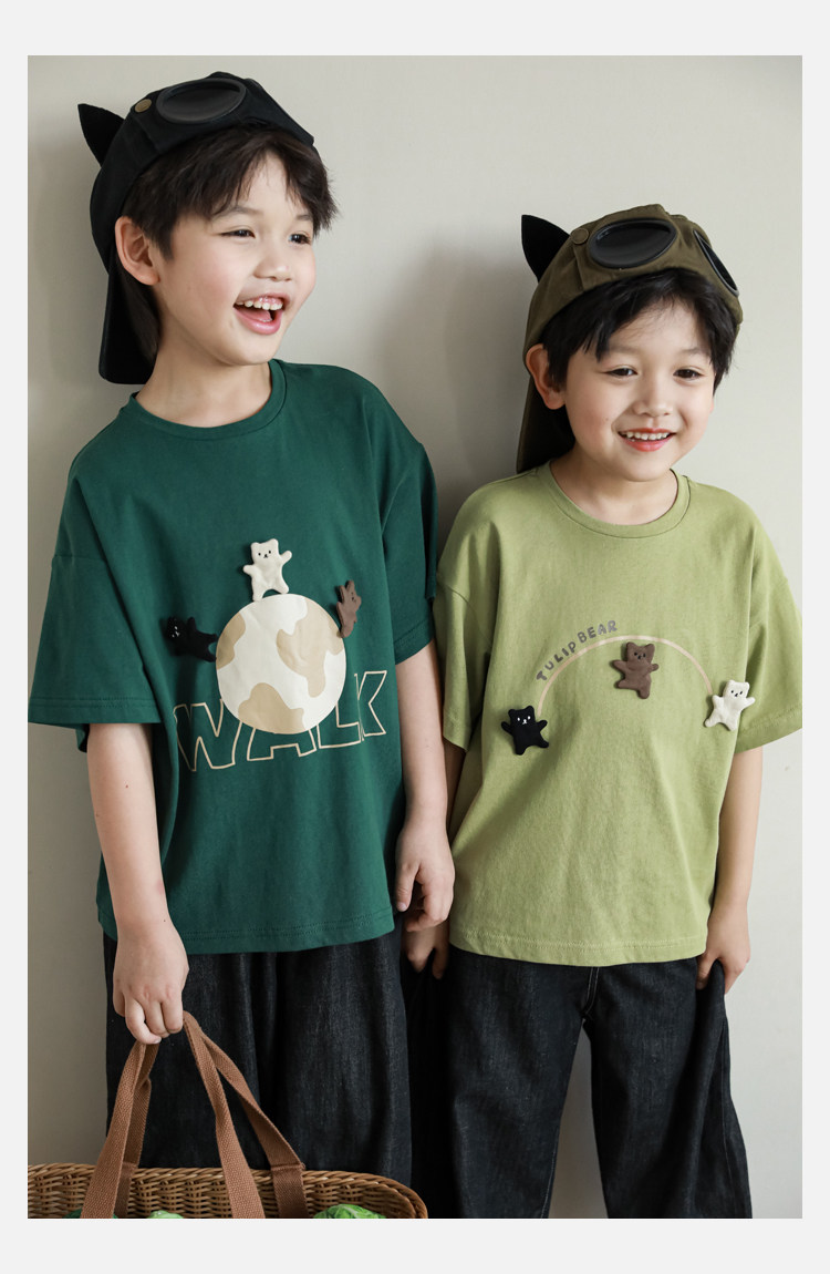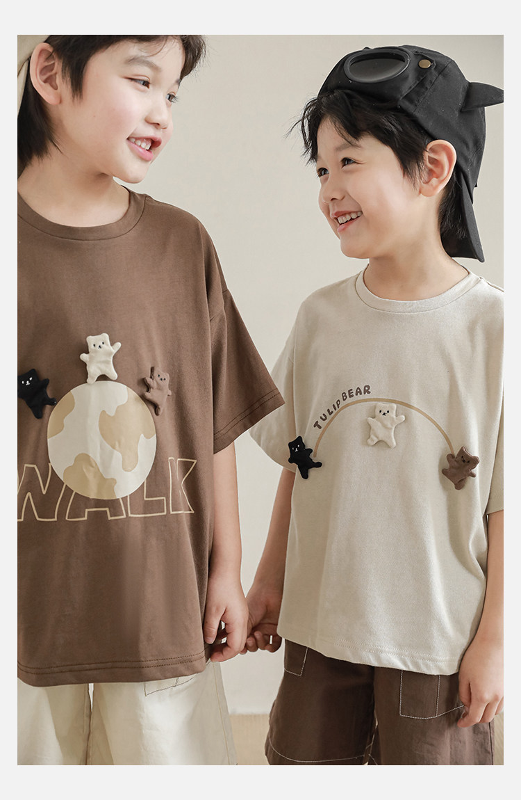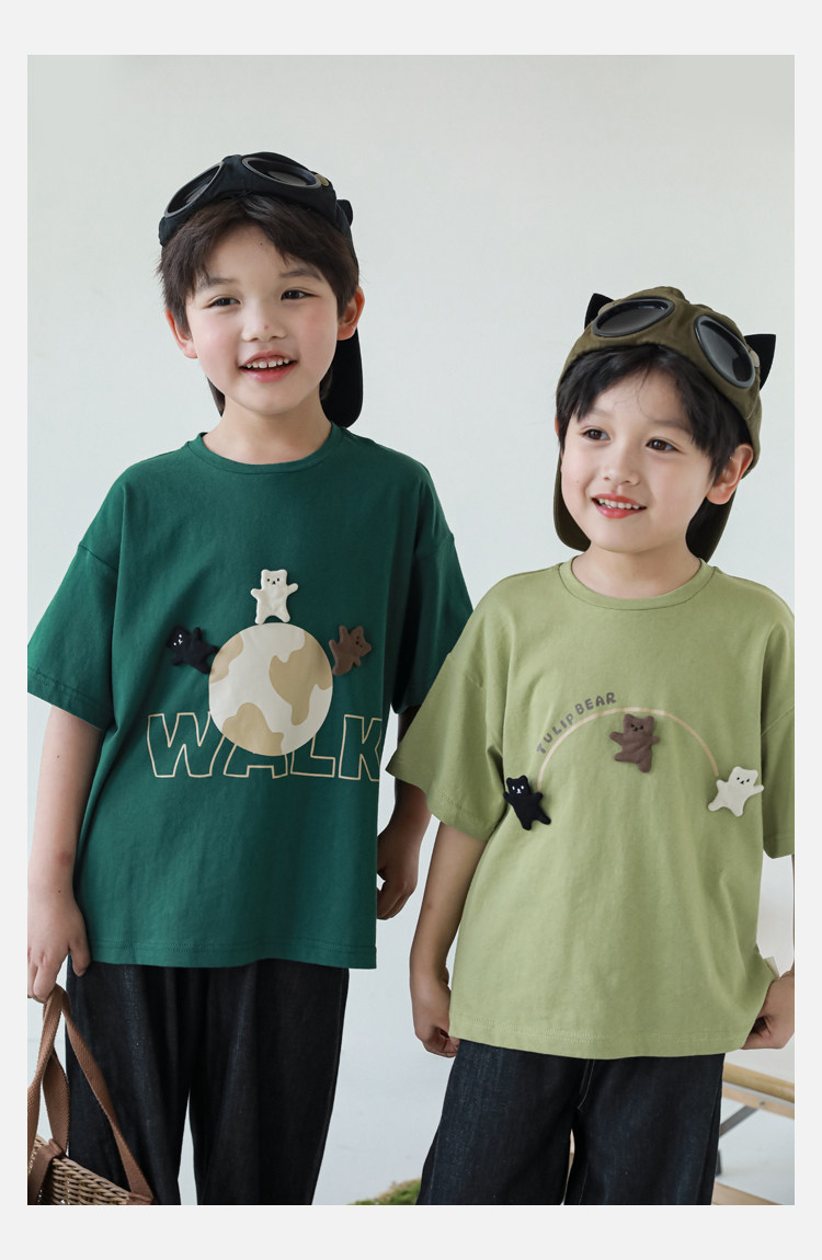 우립 해피 플래닛 베어 프린트 보이즈 루즈 캐주얼 티셔츠 여름 새로운 어린이 반팔 티셔츠스토어 가기