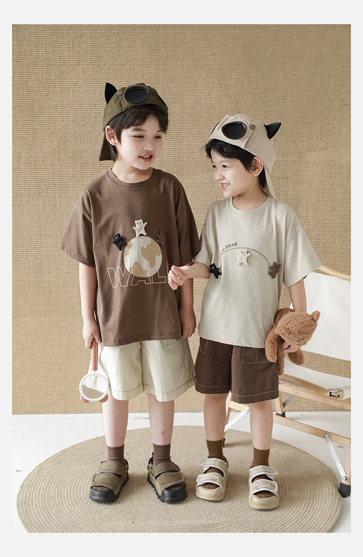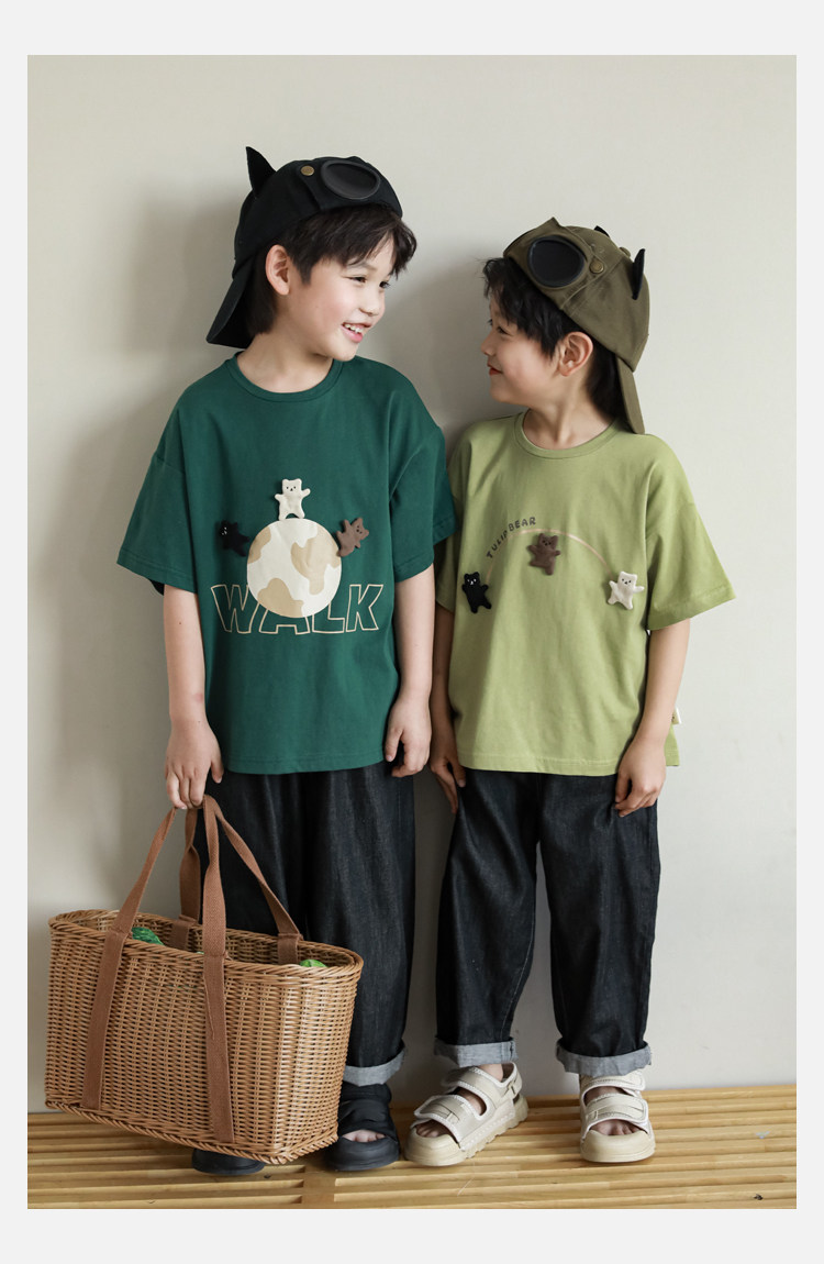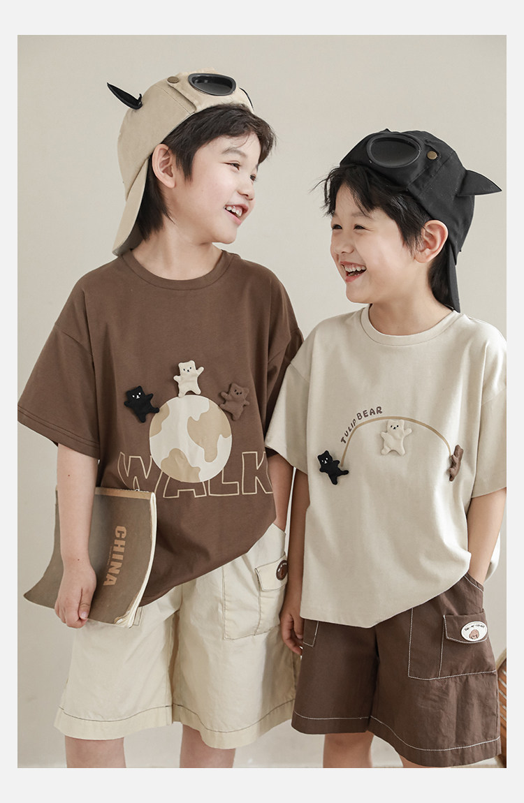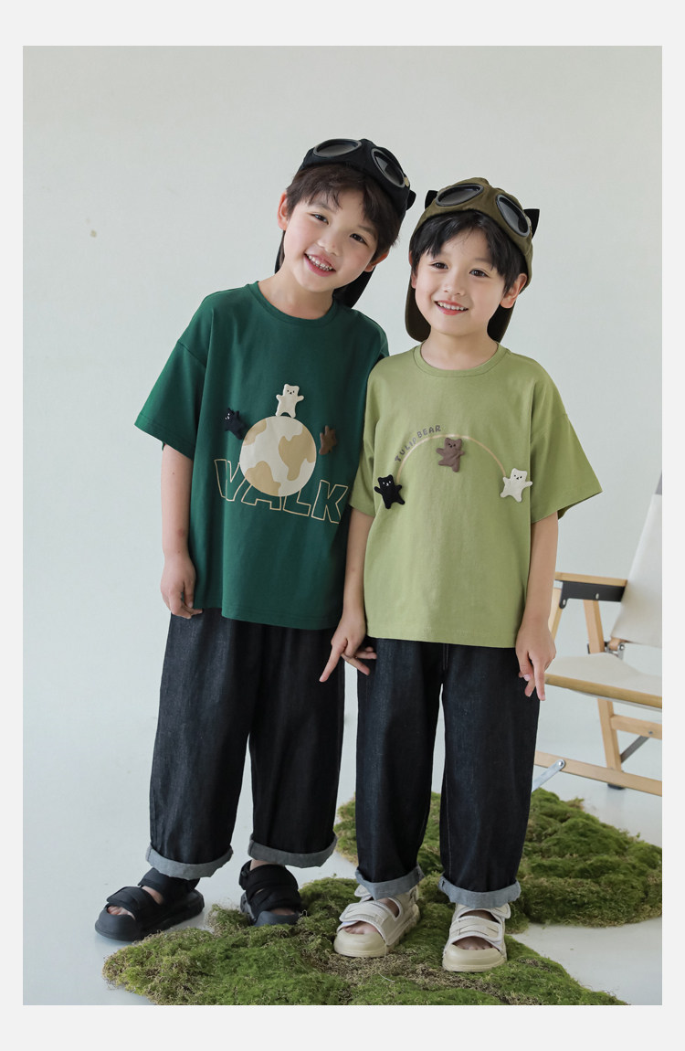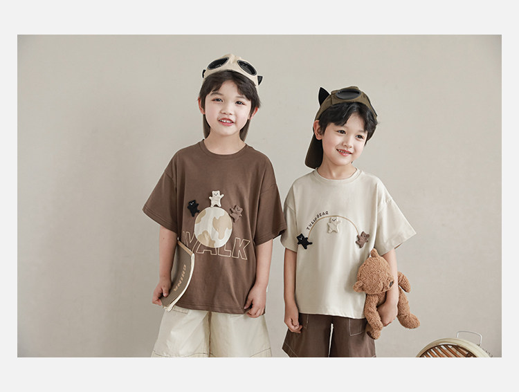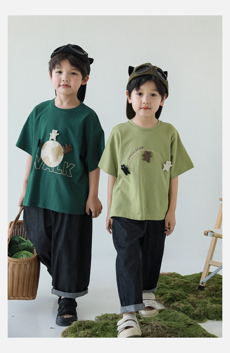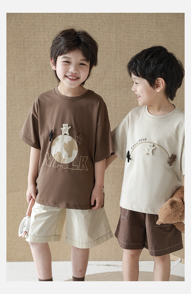 우립 해피 플래닛 베어 프린트 보이즈 루즈 캐주얼 티셔츠 여름 새로운 어린이 반팔 티셔츠스토어 가기