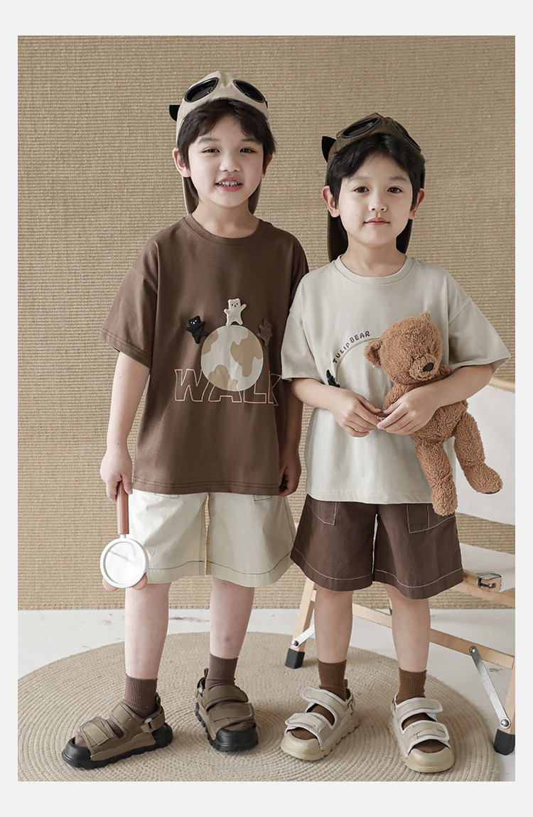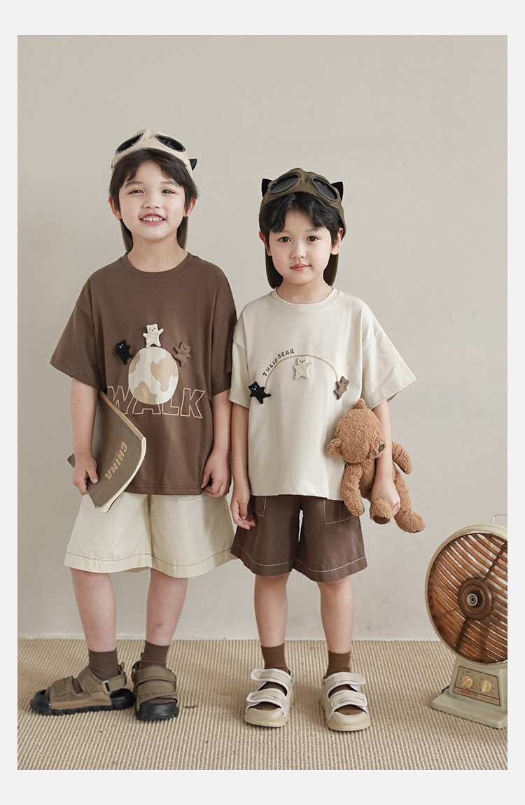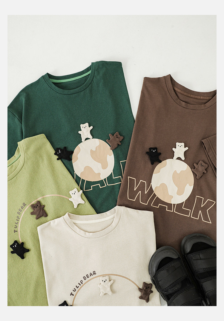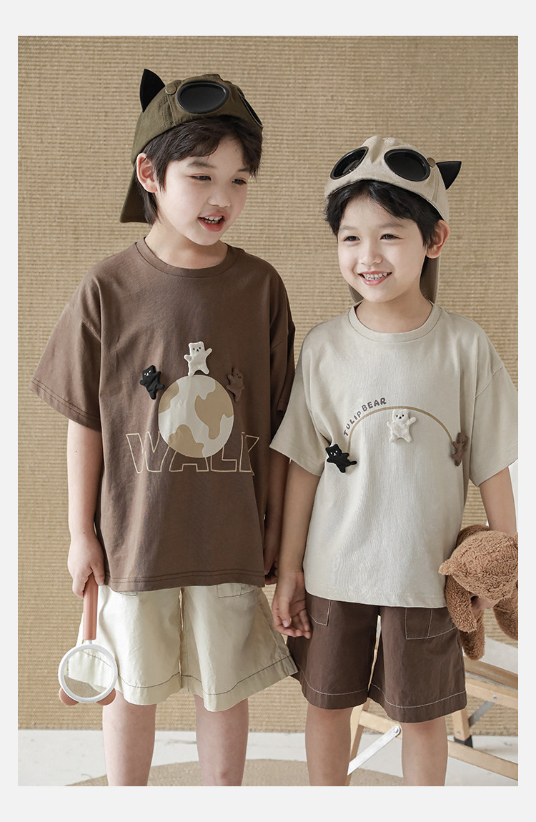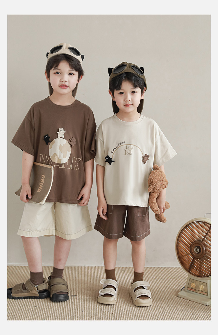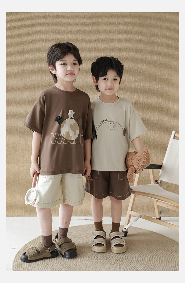 우립 해피 플래닛 베어 프린트 보이즈 루즈 캐주얼 티셔츠 여름 새로운 어린이 반팔 티셔츠스토어 가기