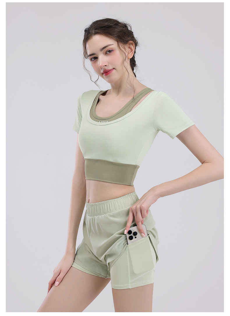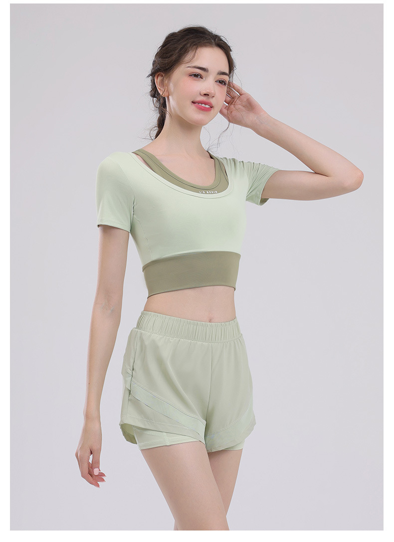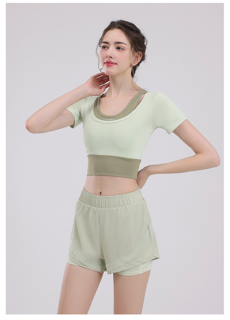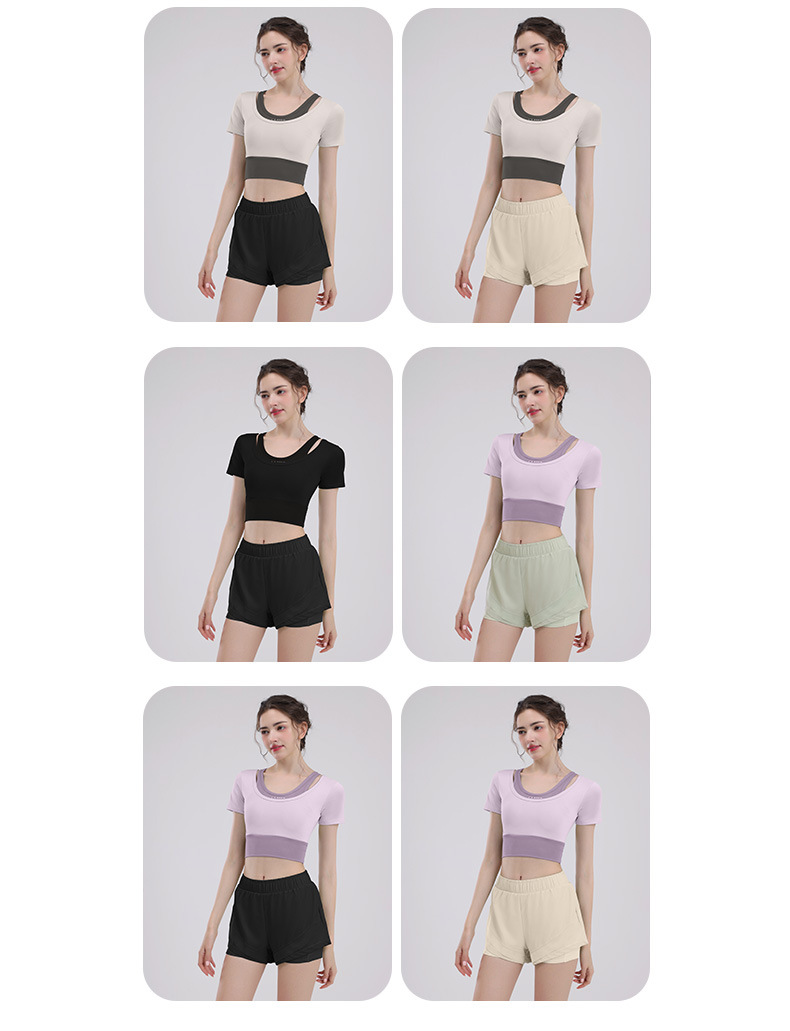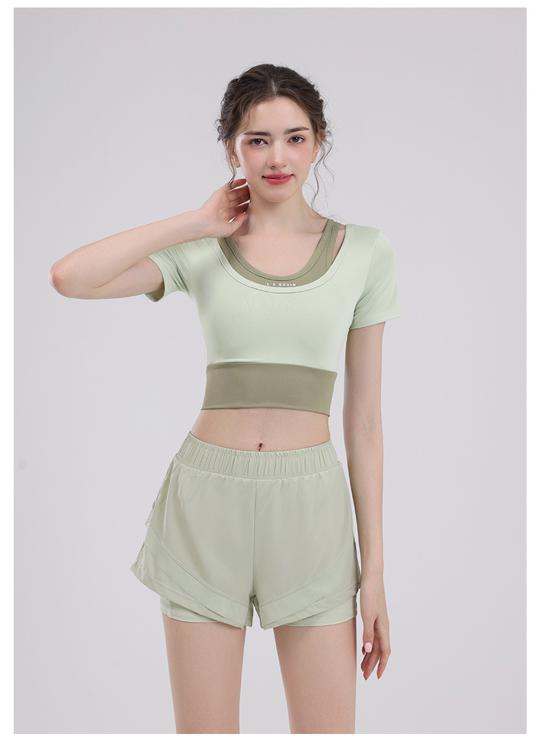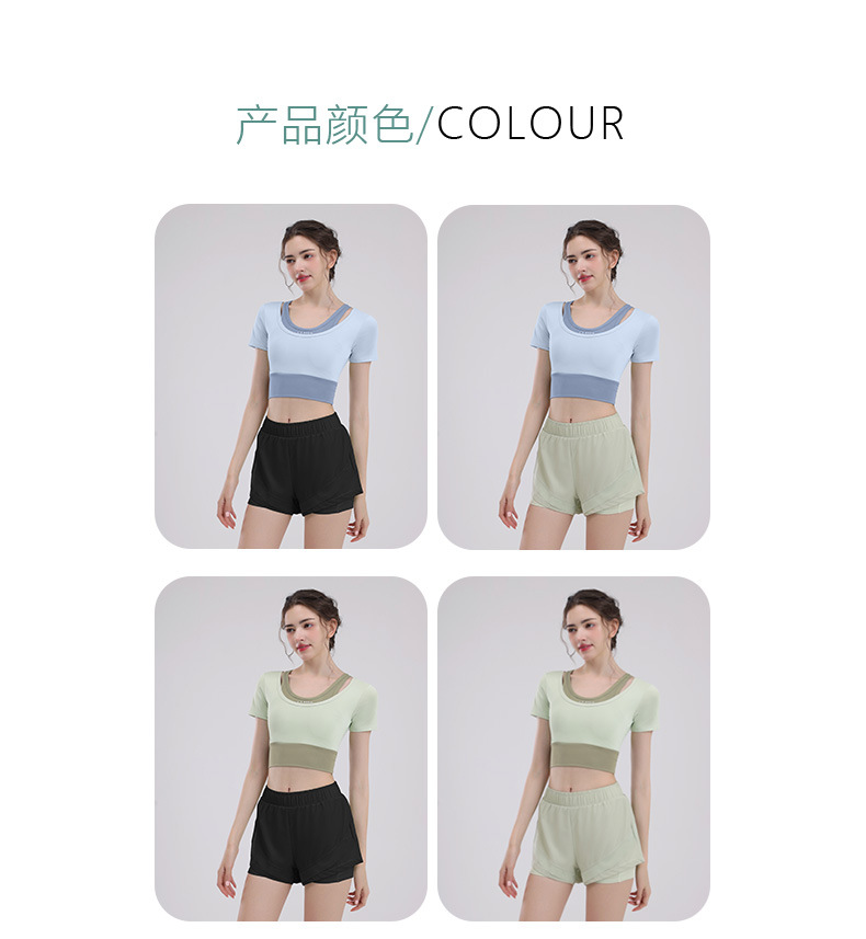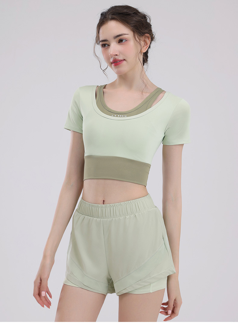 요가 의류 여성의 반팔 새로운 하이 엔드 피트니스 탑 가슴 패드 필라트와 훈련 스포츠 세트 여름스토어 가기