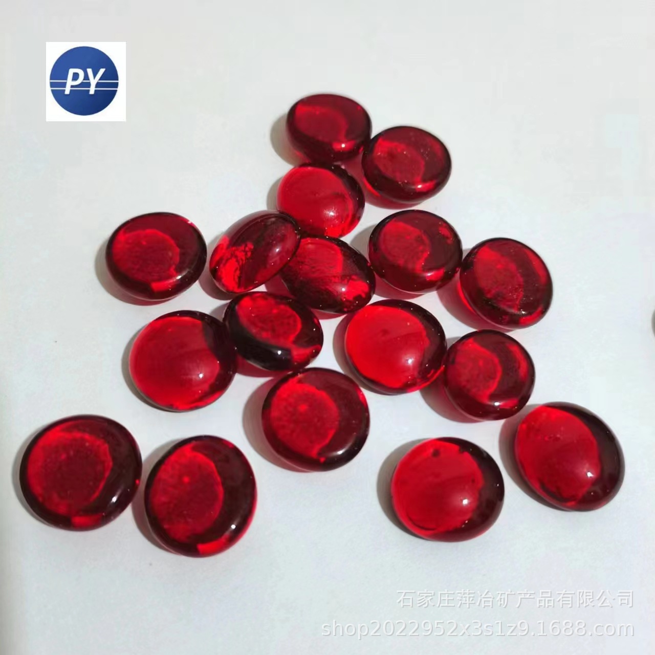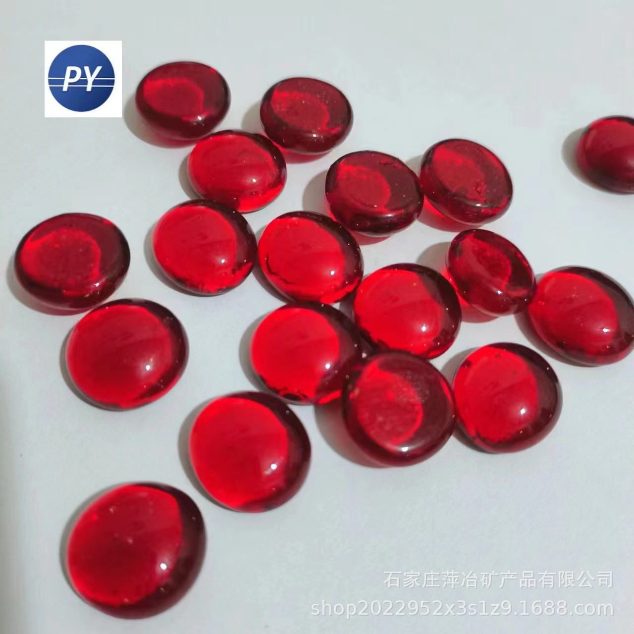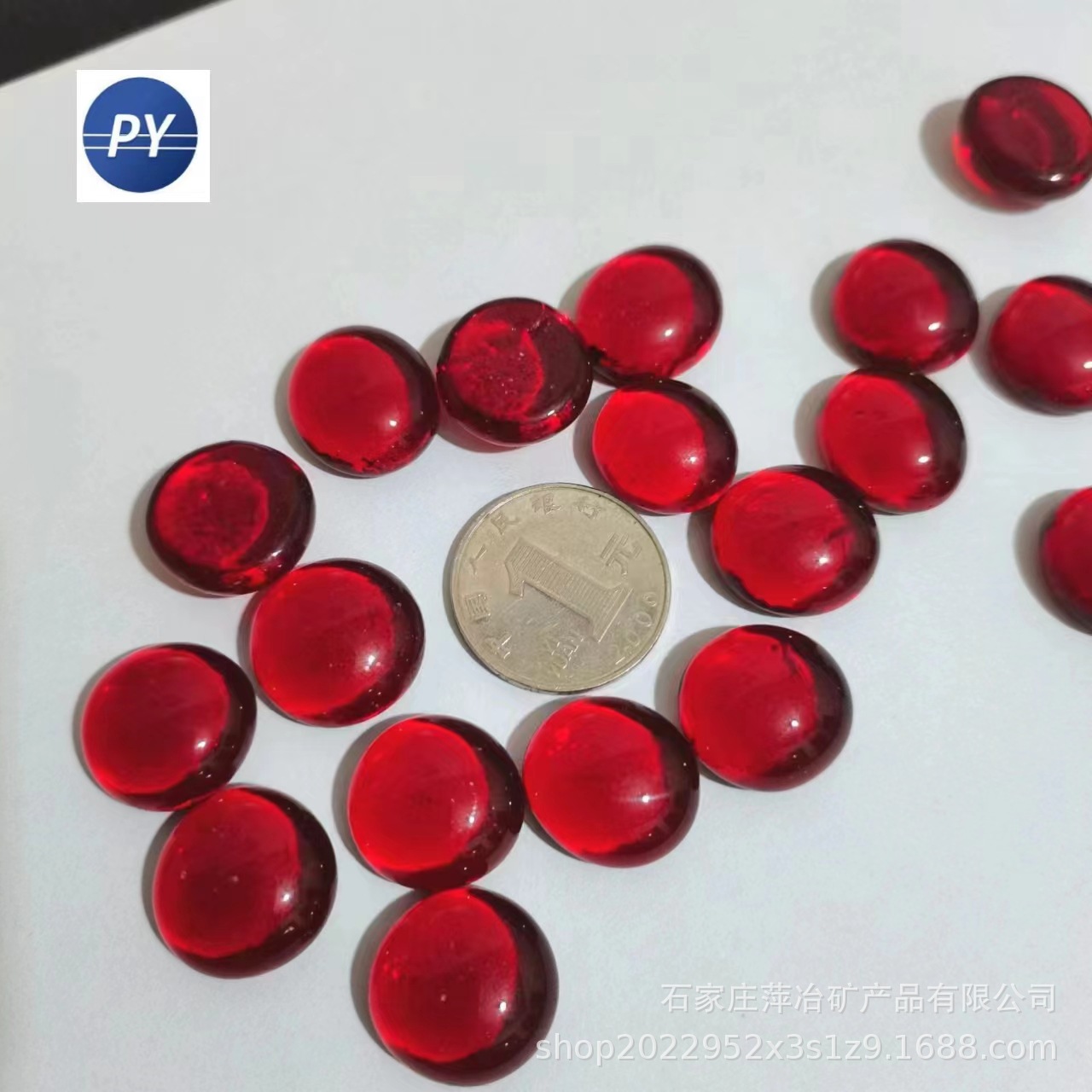 常年供应彩色玻璃石系列产品,本款为大红色玻璃扁珠,尺寸17-19mm, 本色,透亮,非染色。