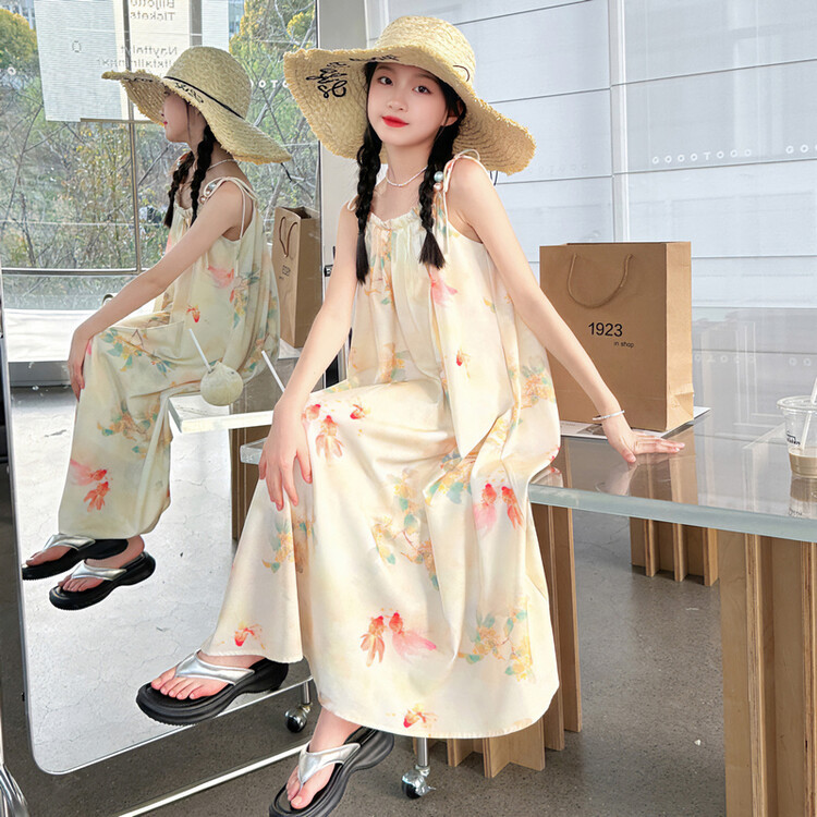 여아용 얇은 홀터넥 휴가풍 비치 원피스 여름옷 2025 신상 스타일리쉬 중대형 아동 루즈핏 공주 드레스스토어 가기