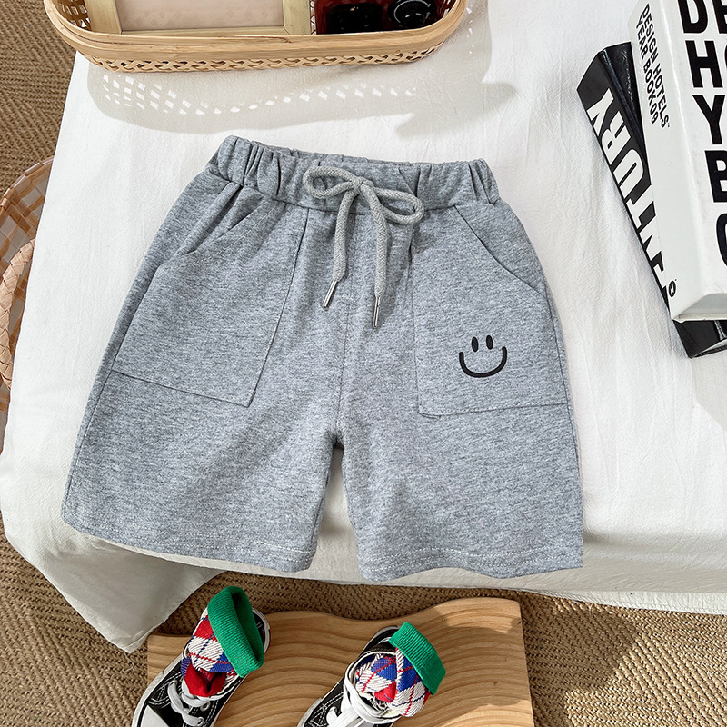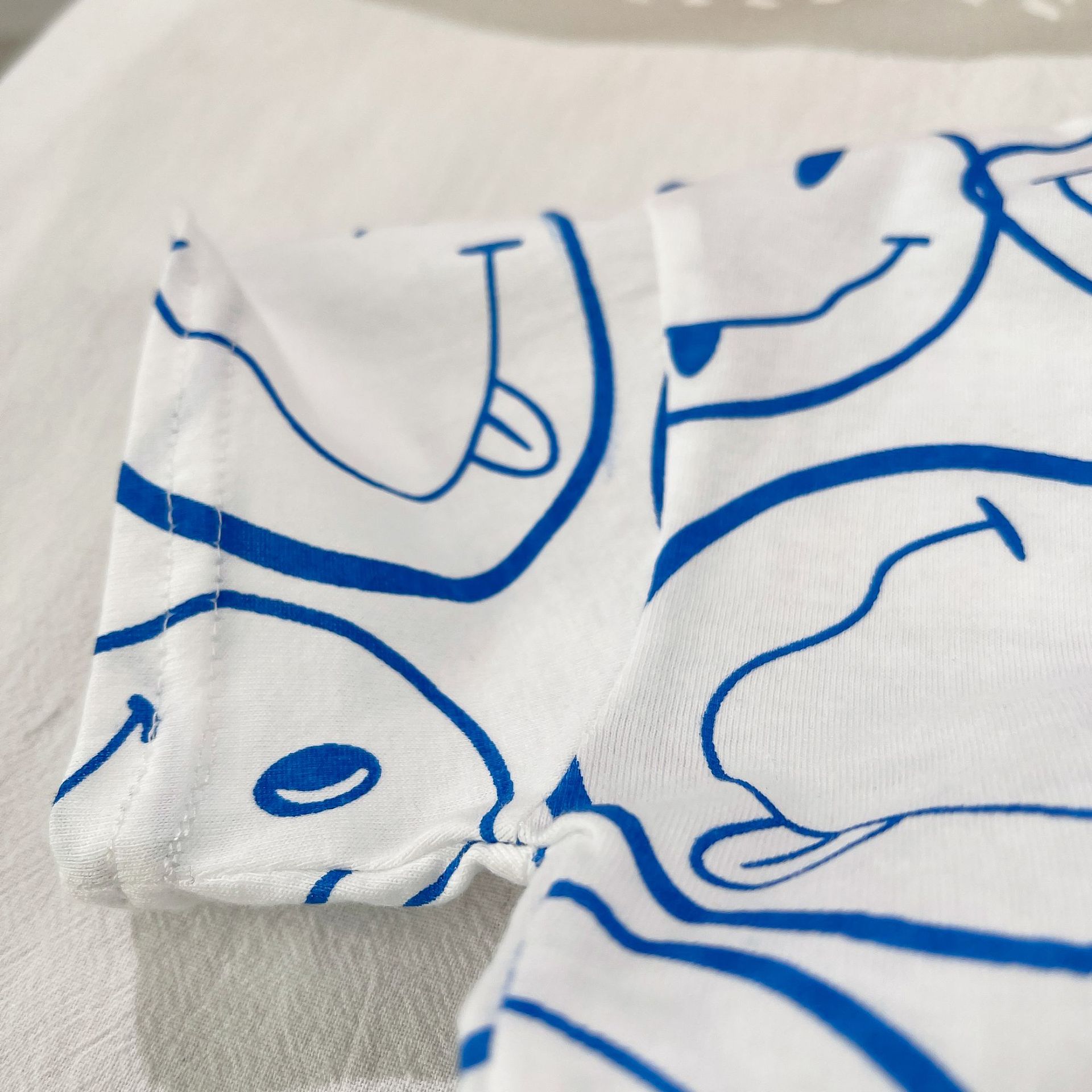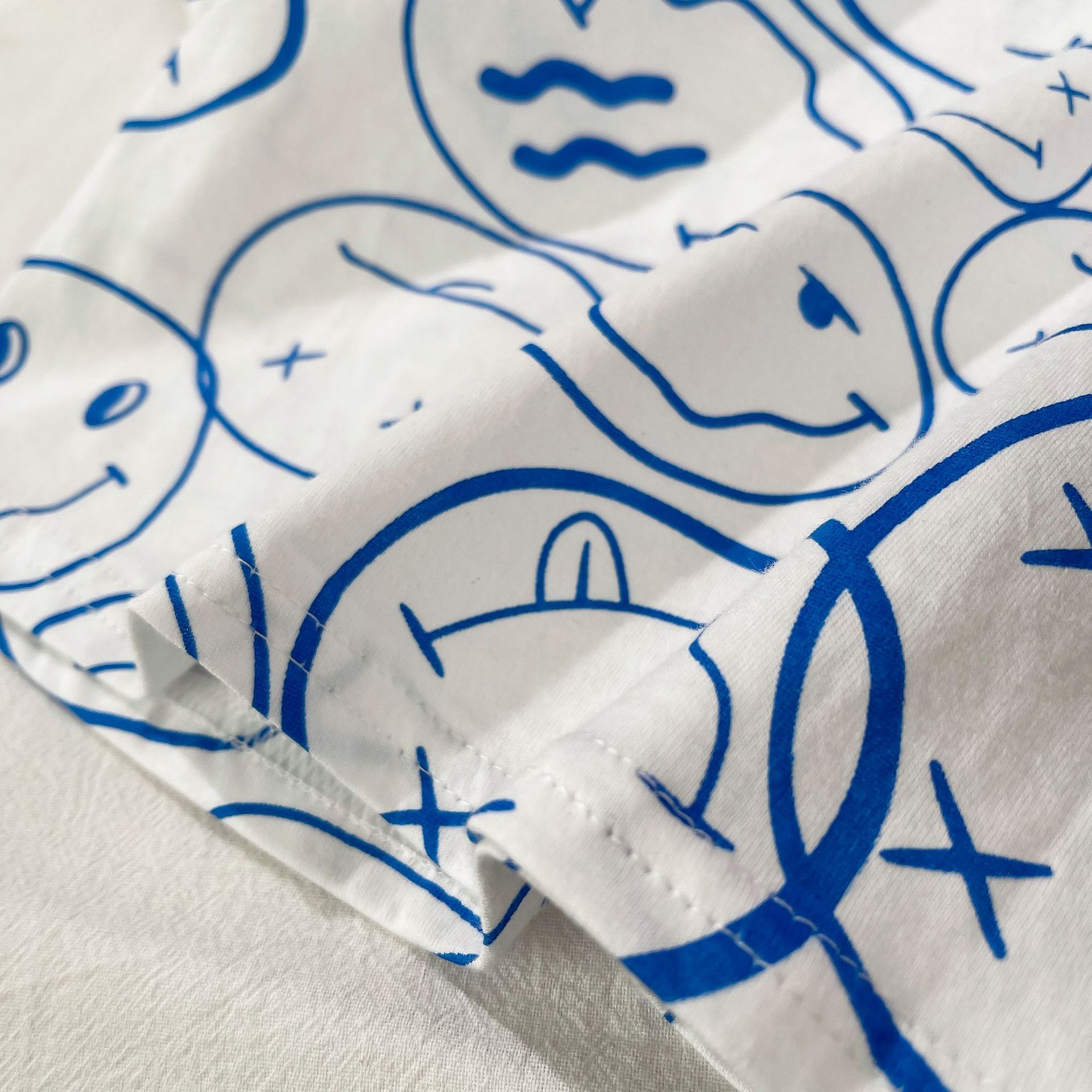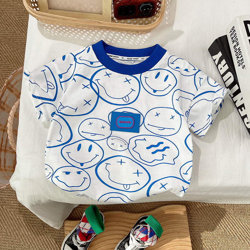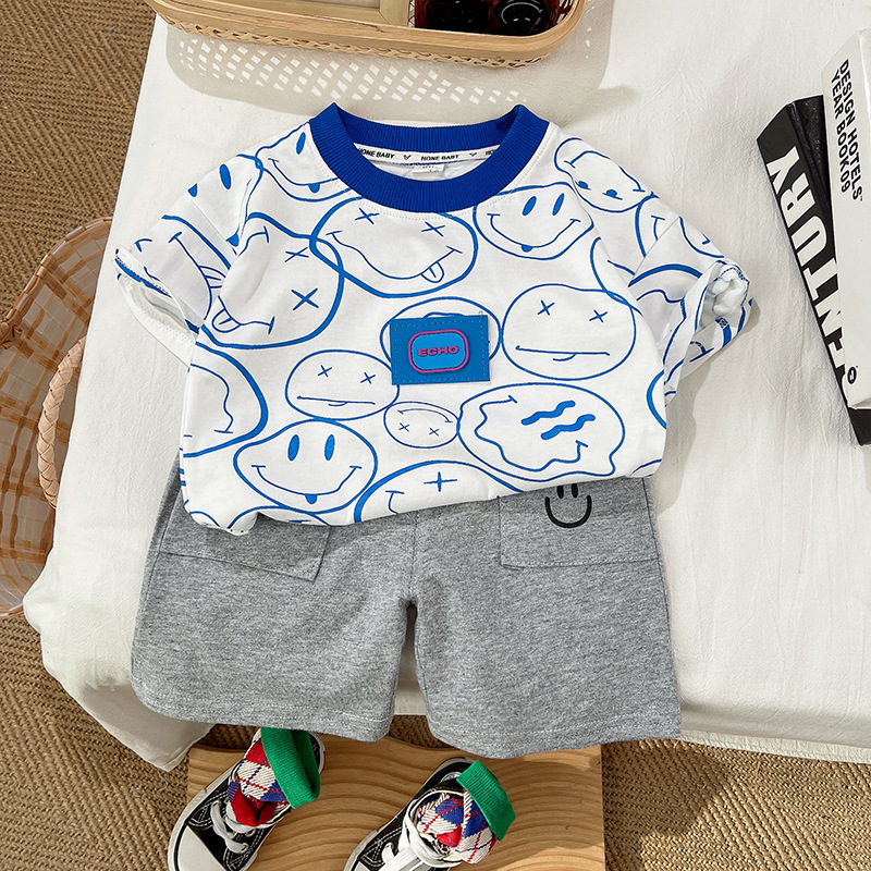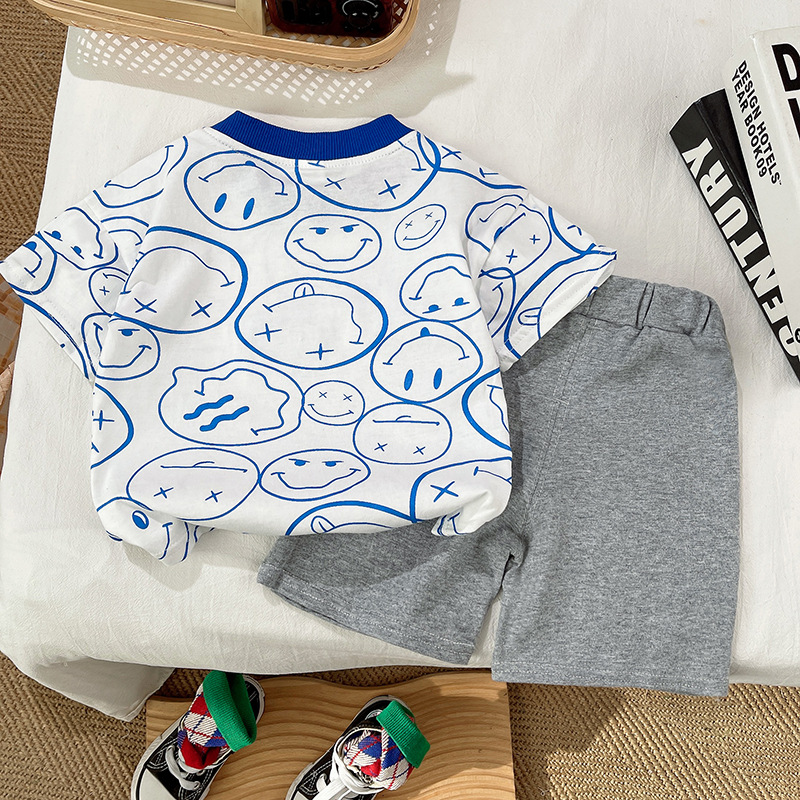 새로운 어린이 반팔 세트 여름 소년 만화 웃는 옷 소년 캐주얼 루즈 바지 투피스 세트