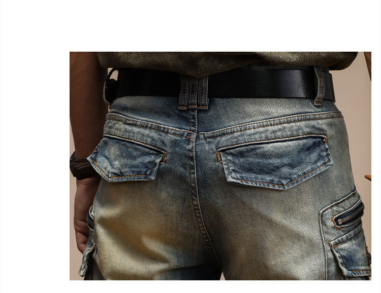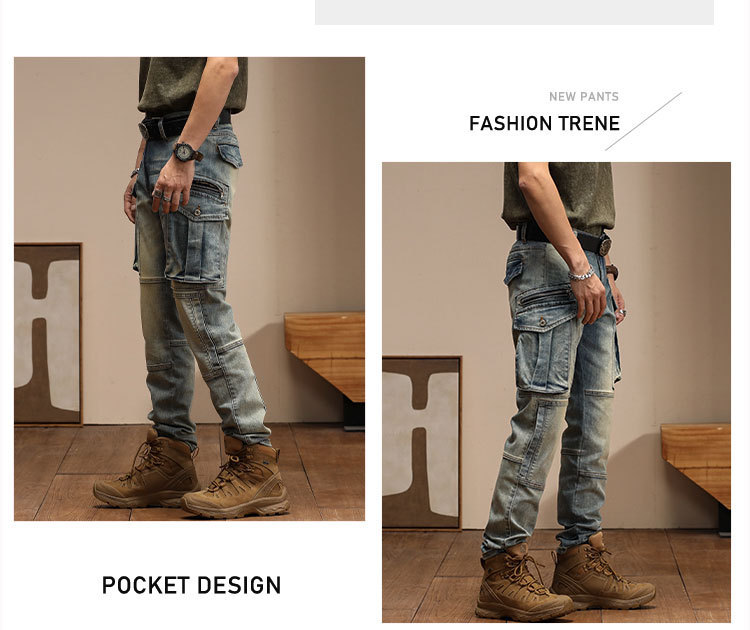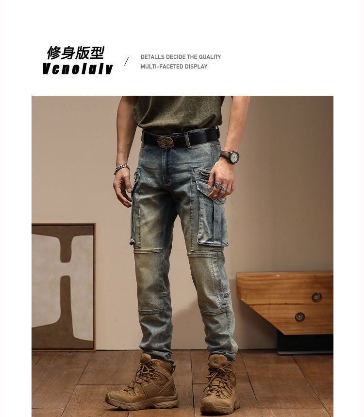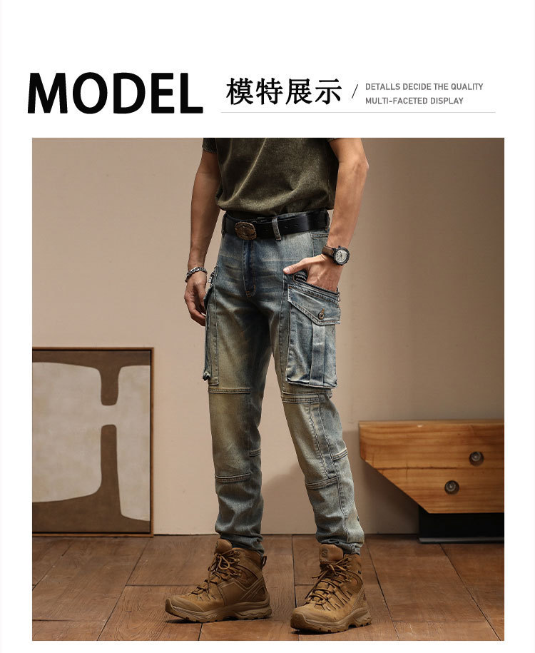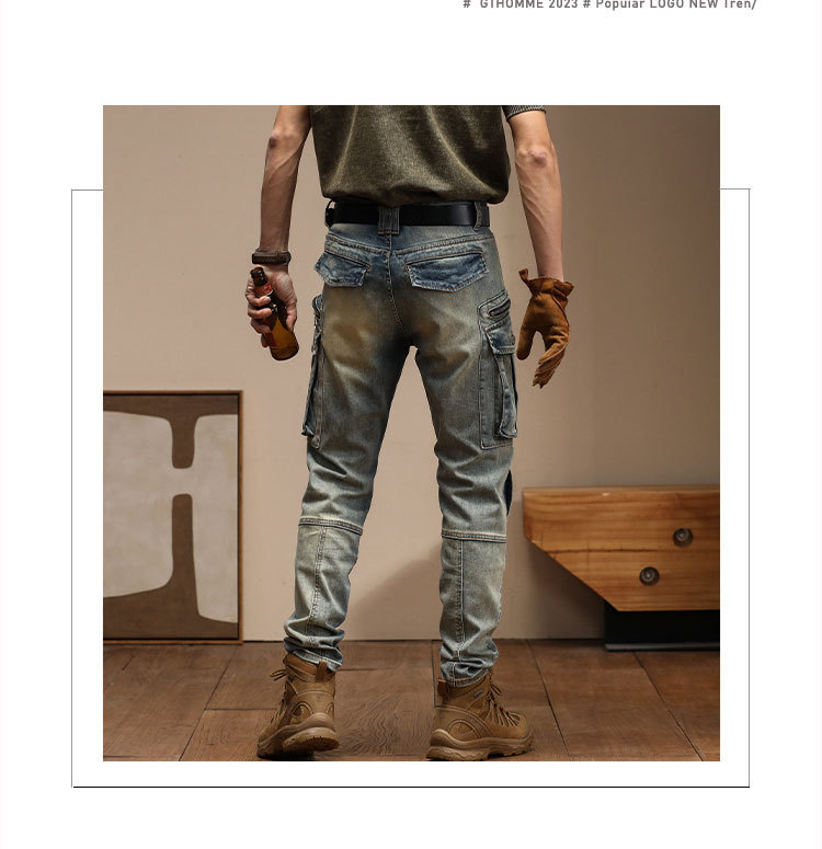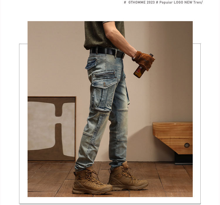 남자의 새로운 미국 스타일 하이 엔드 레트로 청바지 유행 슬림 핏 개성 대형 포켓 스티칭 오토바이 다리 바지