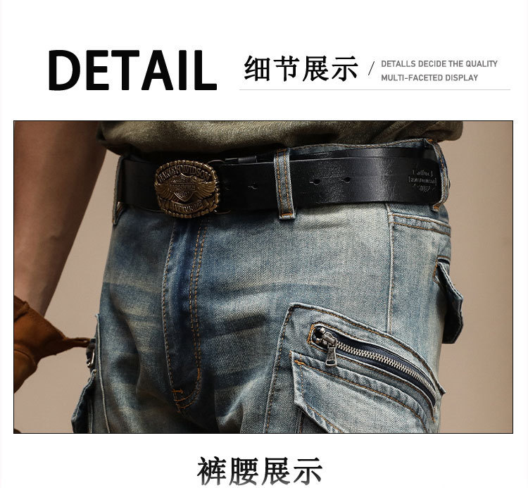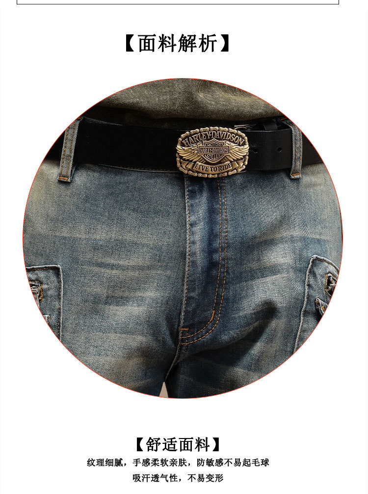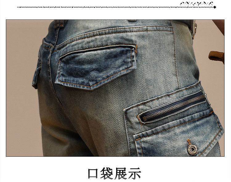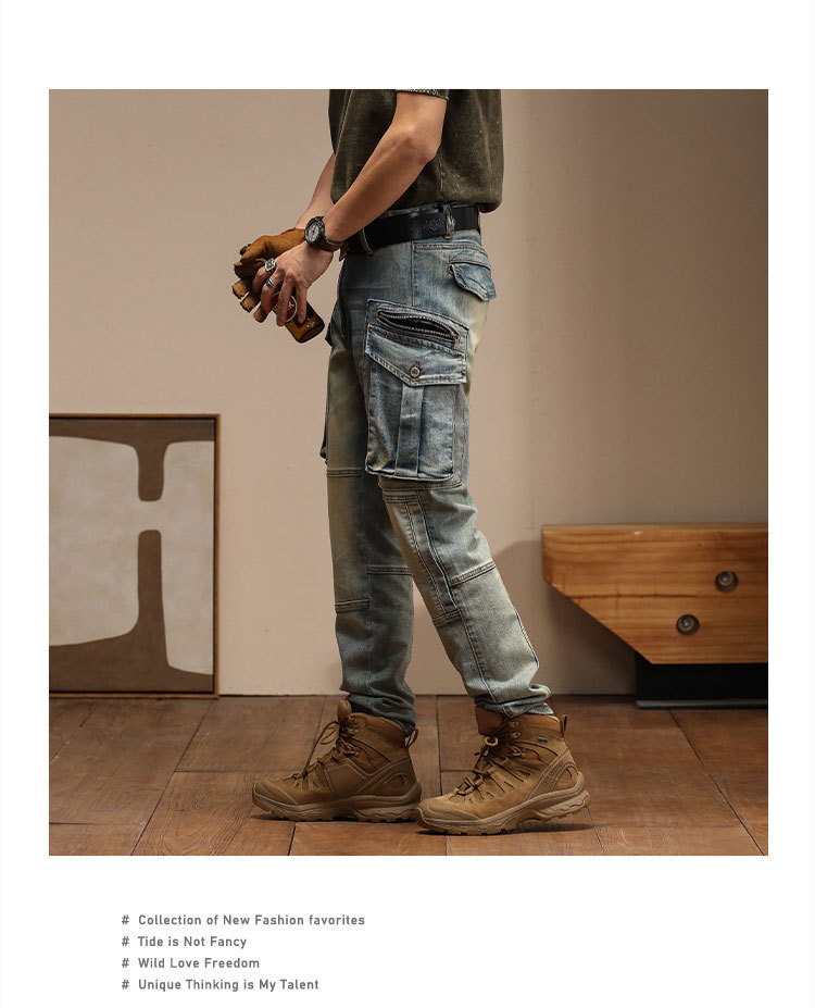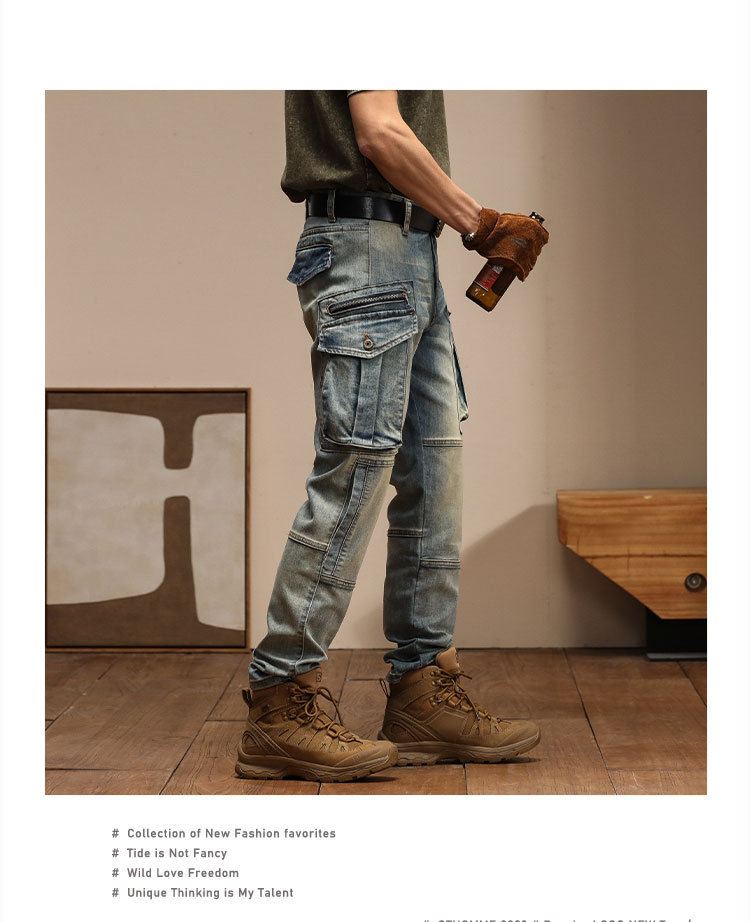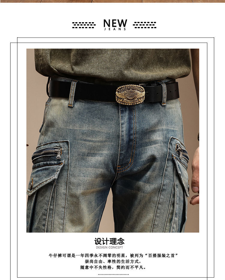남자의 새로운 미국 스타일 하이 엔드 레트로 청바지 유행 슬림 핏 개성 대형 포켓 스티칭 오토바이 다리 바지