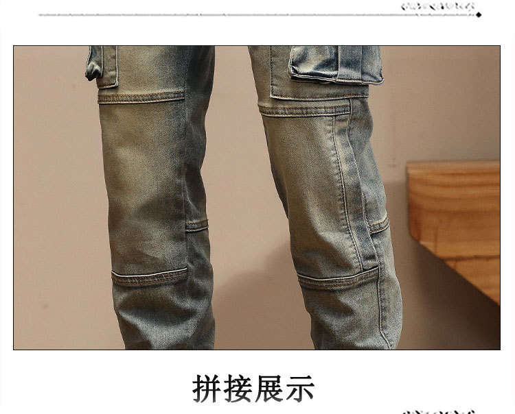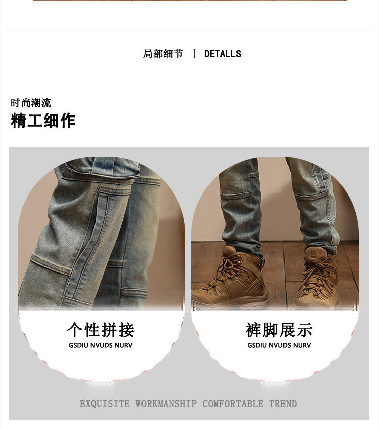 남자의 새로운 미국 스타일 하이 엔드 레트로 청바지 유행 슬림 핏 개성 대형 포켓 스티칭 오토바이 다리 바지스토어 가기