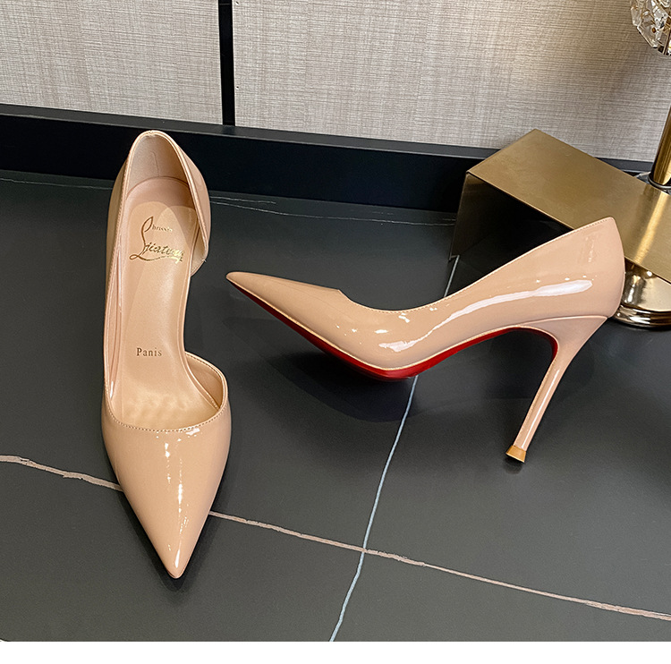 누드 사이드 에어 하이힐 여성용 레드 씬 2024 새로운 포인팅 얕은 입 특허 가죽 섹시한 우아한 아름다운 싱글 레이어 신발스토어 가기