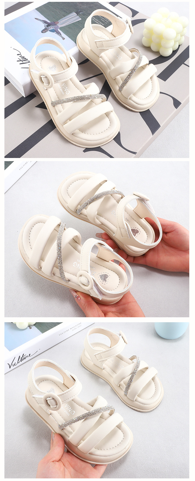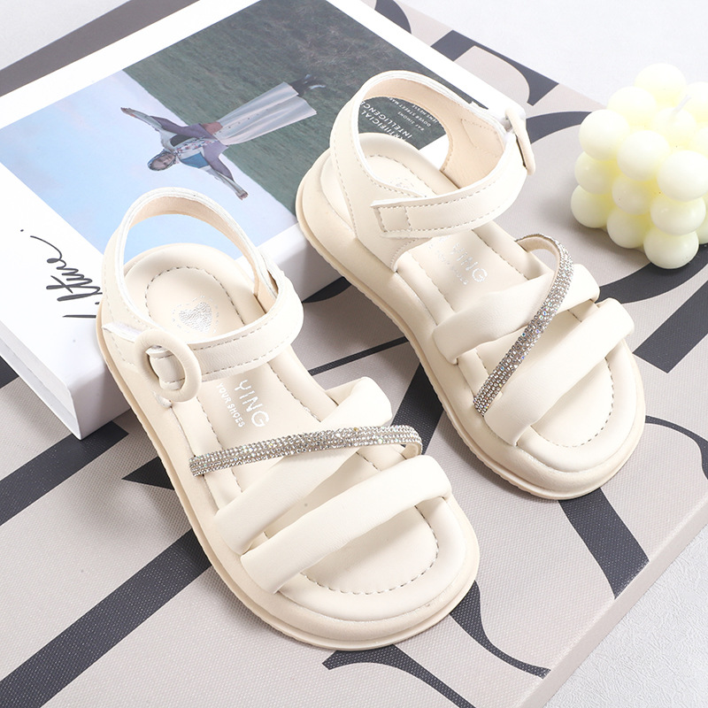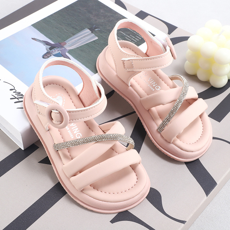 여자 패션 오픈 발가락 샌들 2024 여름 새로운 작은 소녀 라인스톤 크로스 공주 신발 미끄럼 방지 비치 샌들스토어 가기