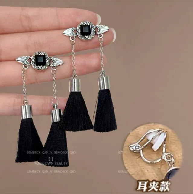 • 120#블랙 지르코늄 더블 태슬 삼각형 이어 클립