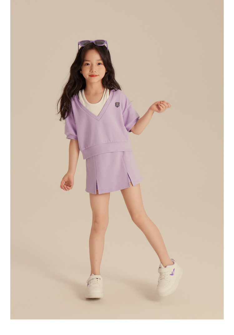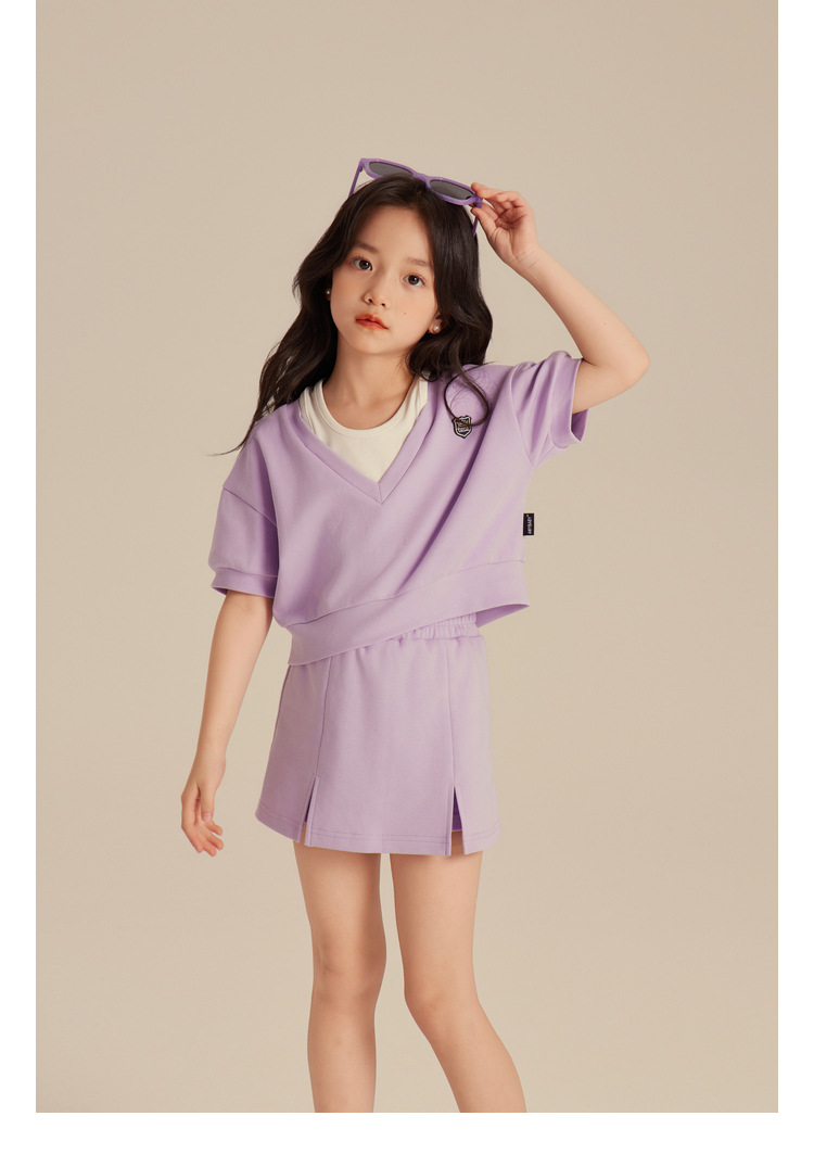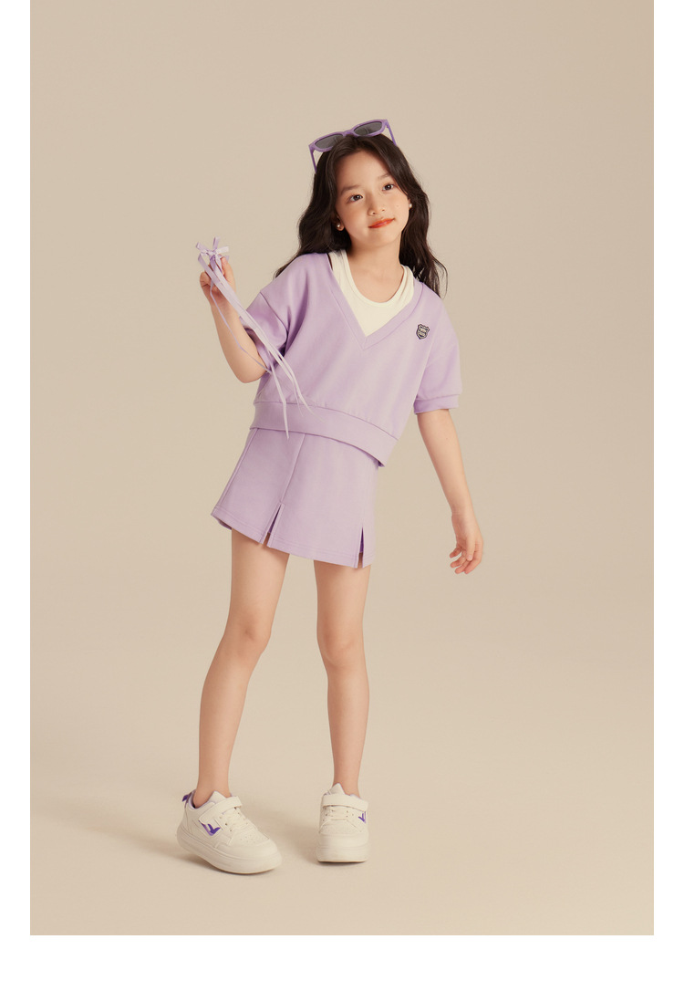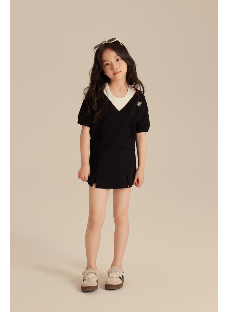 Amybaby Girls 세트 2024 새로운 어린이 대학 스타일 가짜 투피스 티셔츠 캐주얼 반바지 투피스 세트스토어 가기