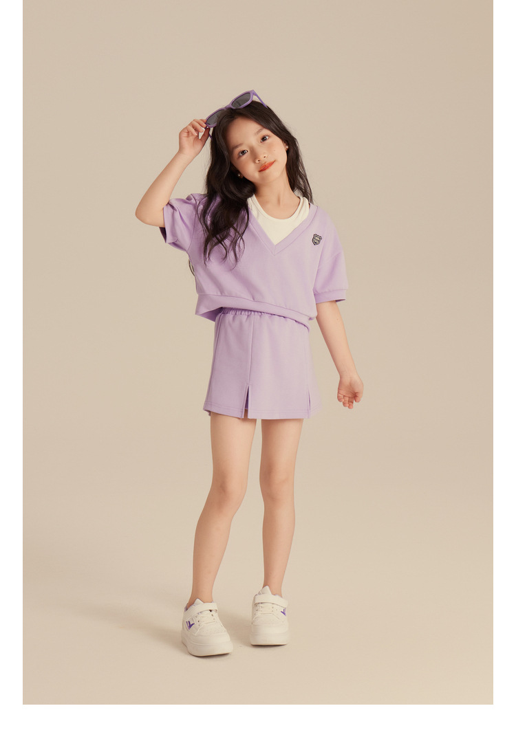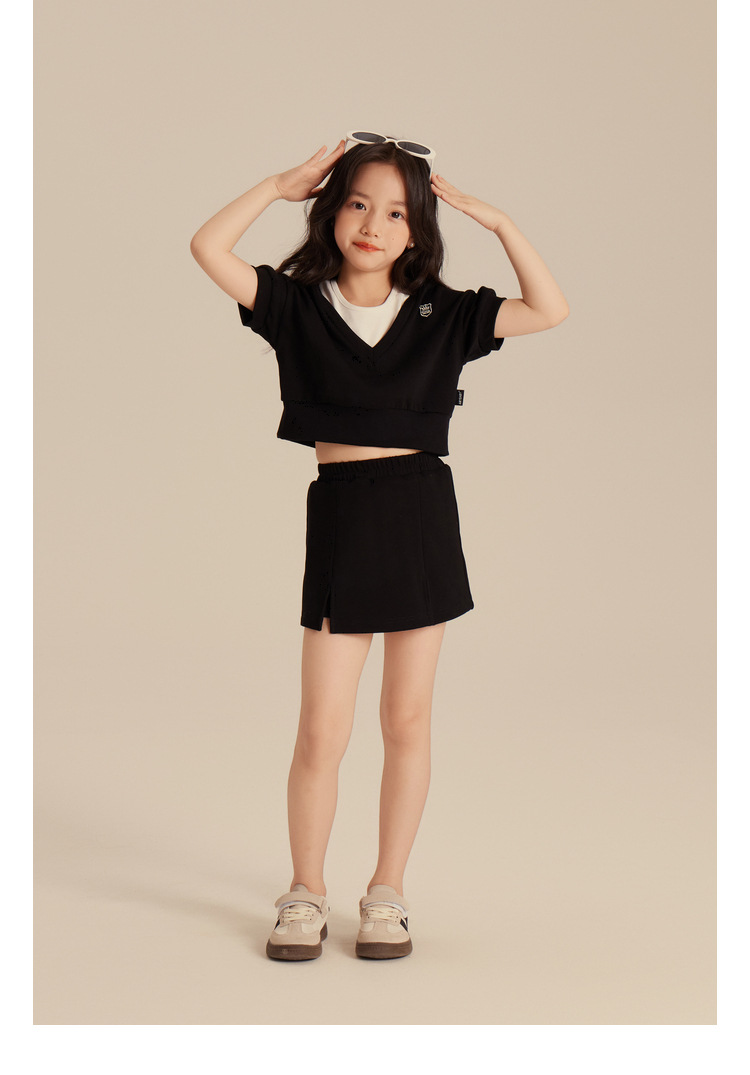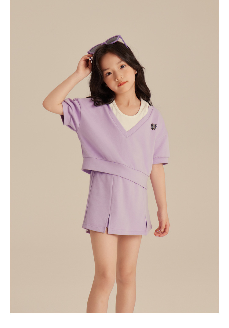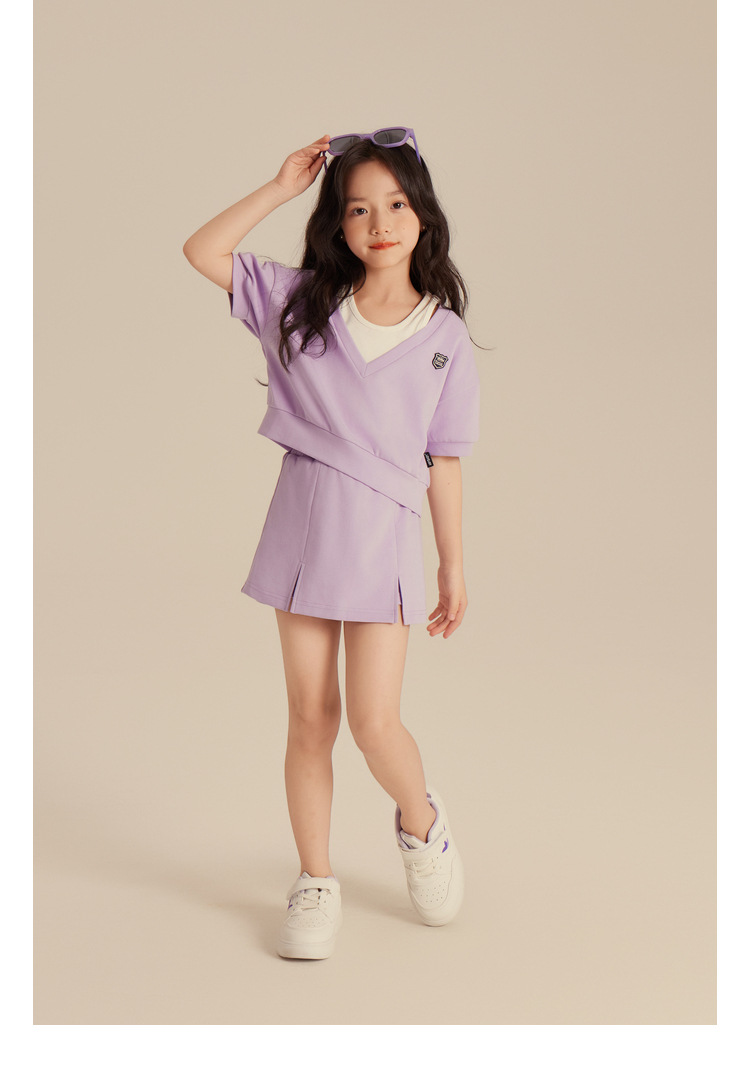 Amybaby Girls 세트 2024 새로운 어린이 대학 스타일 가짜 투피스 티셔츠 캐주얼 반바지 투피스 세트스토어 가기