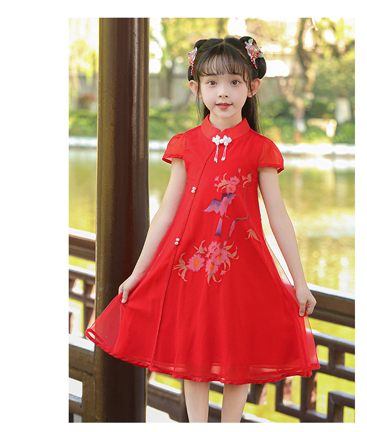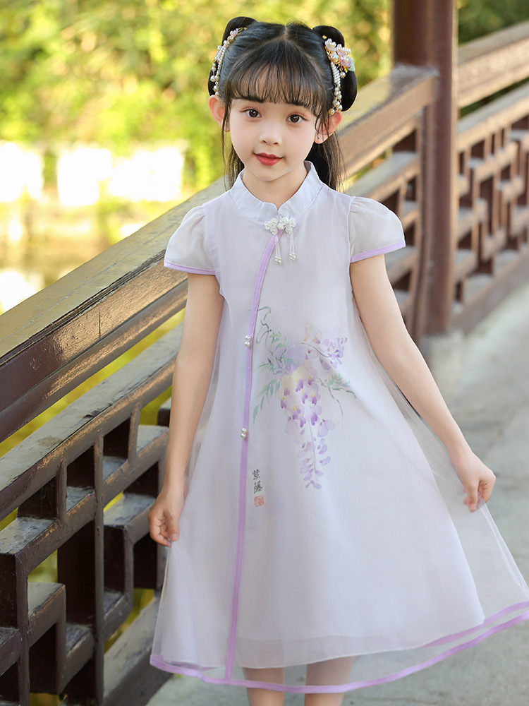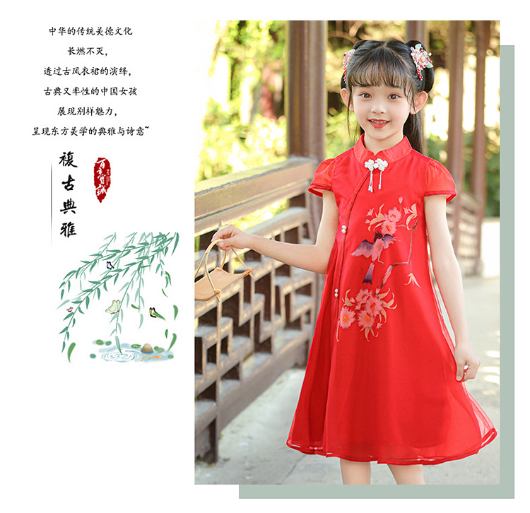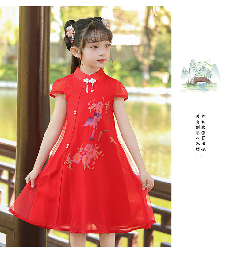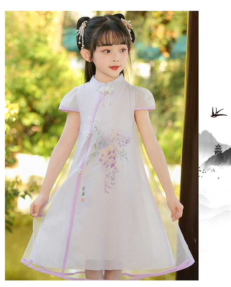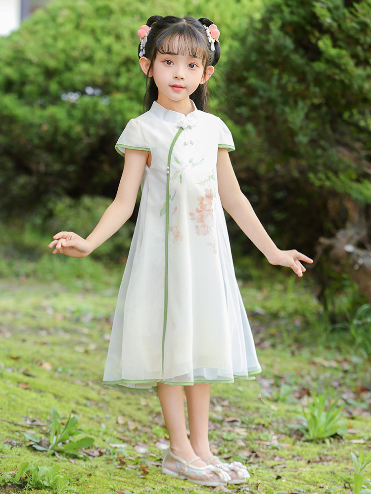 소녀 청삼 원피스 여름 2024 새로운 어린이 한푸 중국 스타일 소녀 치마 여름 서양식 얇은
