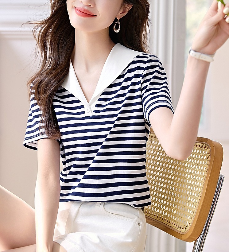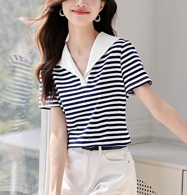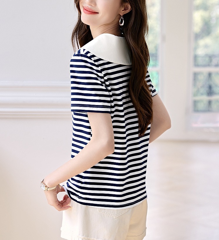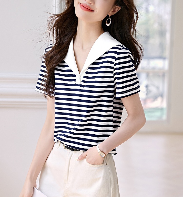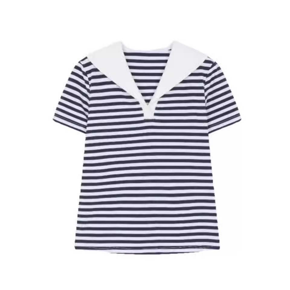 휴일 해군 스타일 신선한 줄무늬 대형 Lel 티셔츠 2024 여름 뉴 에이지 감소 대비 색상 스티칭 짧은 소매 탑