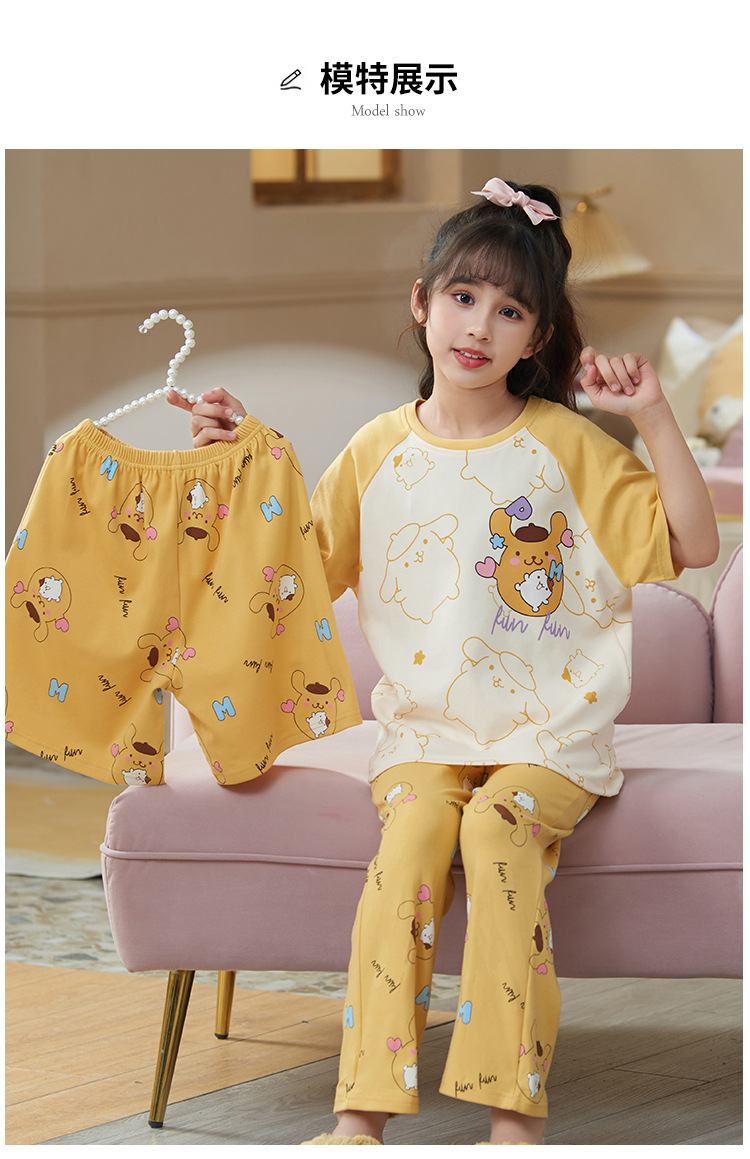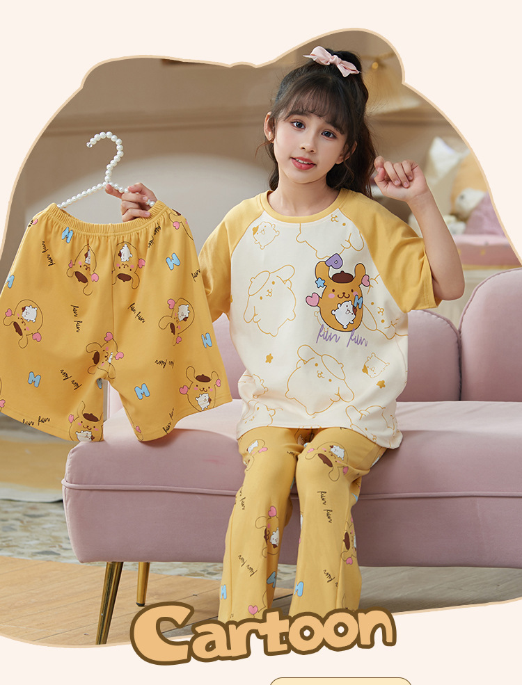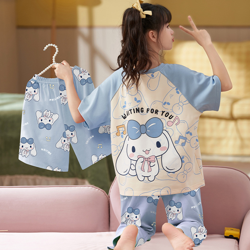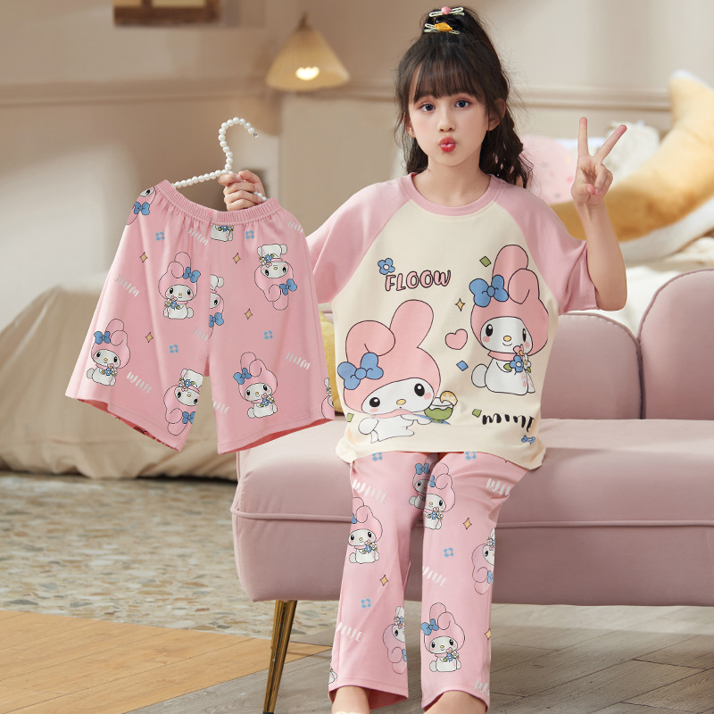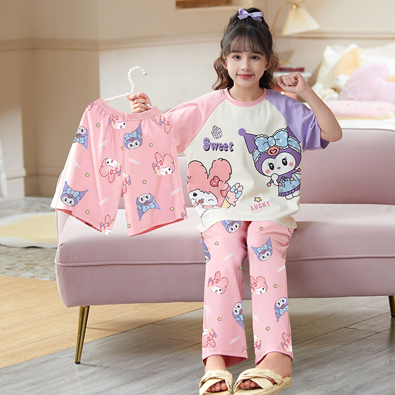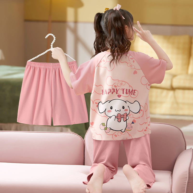 어린이 소녀 여름 잠옷 3 종 세트 만화 소녀 얇은 반팔 바지 반바지 큰 어린이 봄과 가을 가정 옷