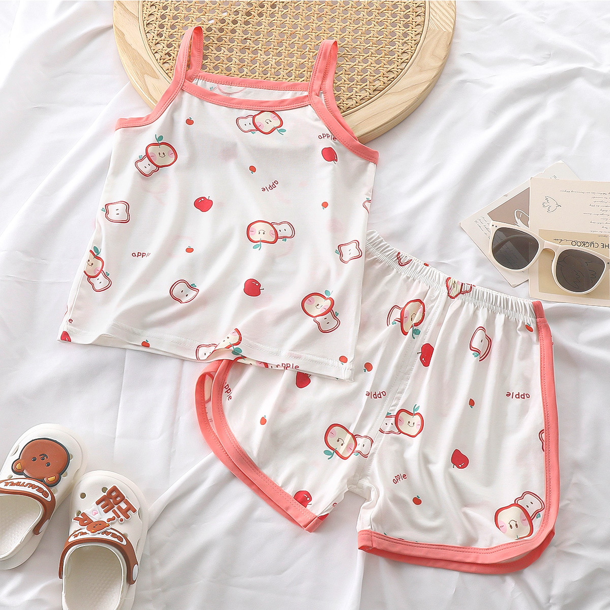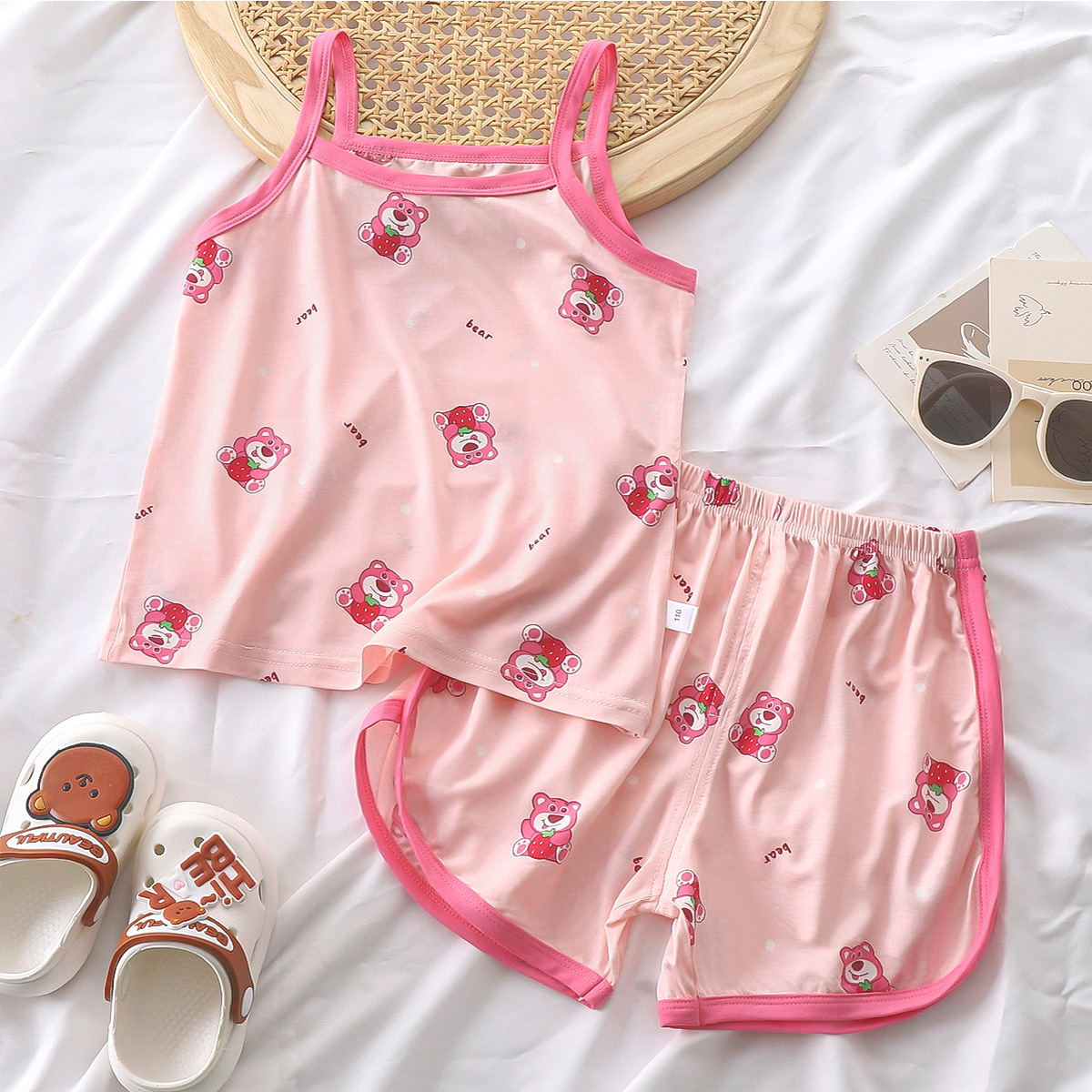 여름 소녀 서스펜더 슈트 2025 새로운 텐셀 어린이 얇은 잠옷 아기 가정 의류 중소 어린이 반바지스토어 가기