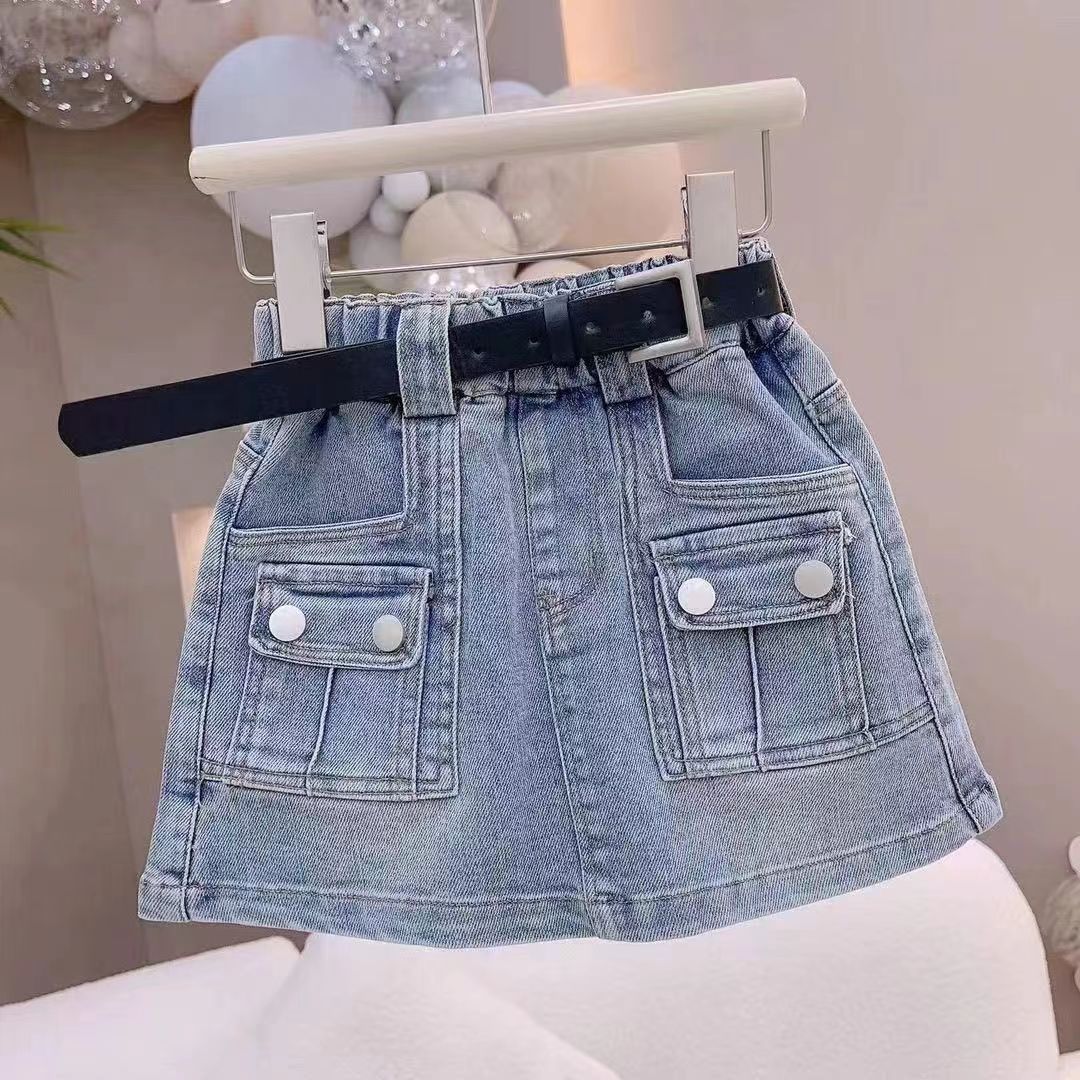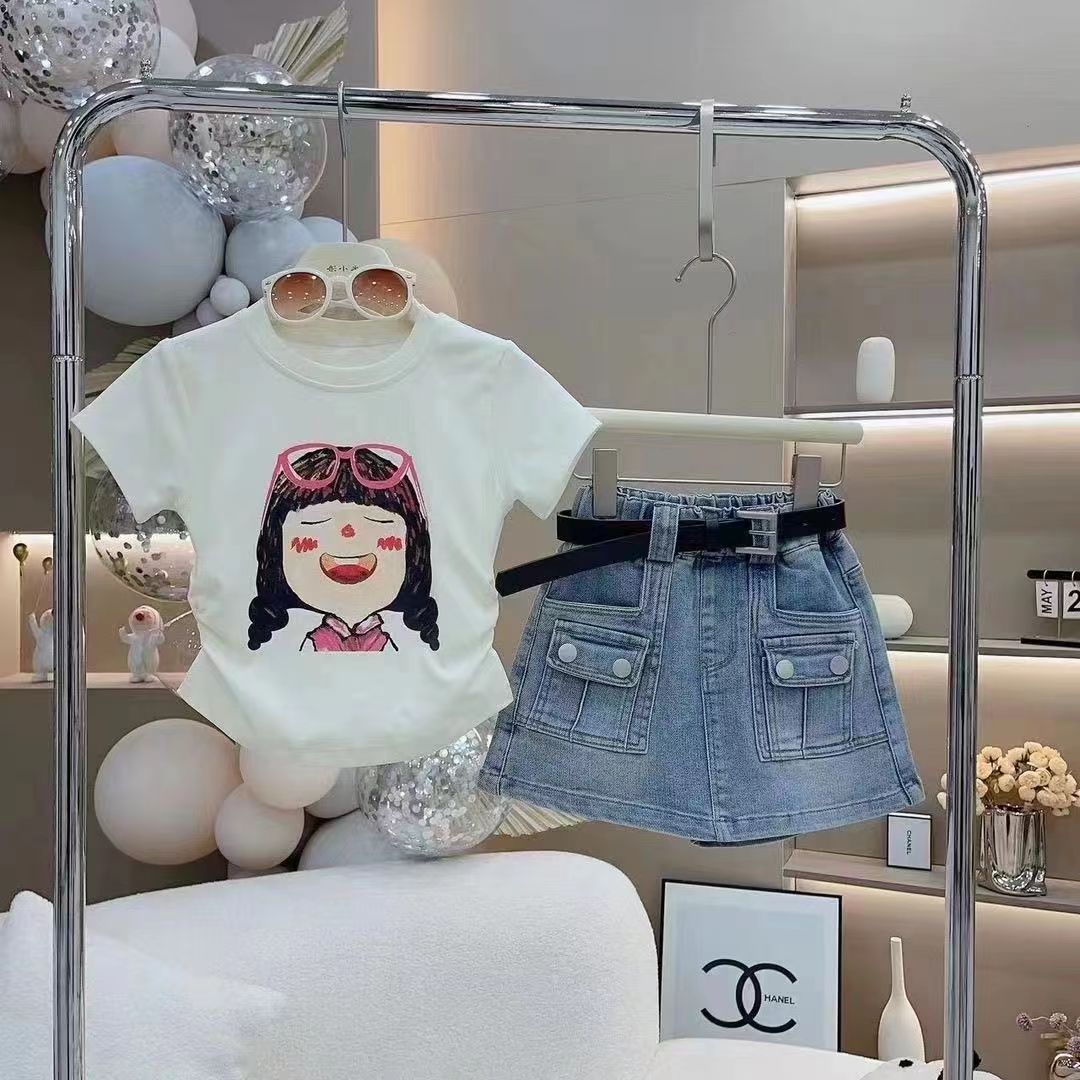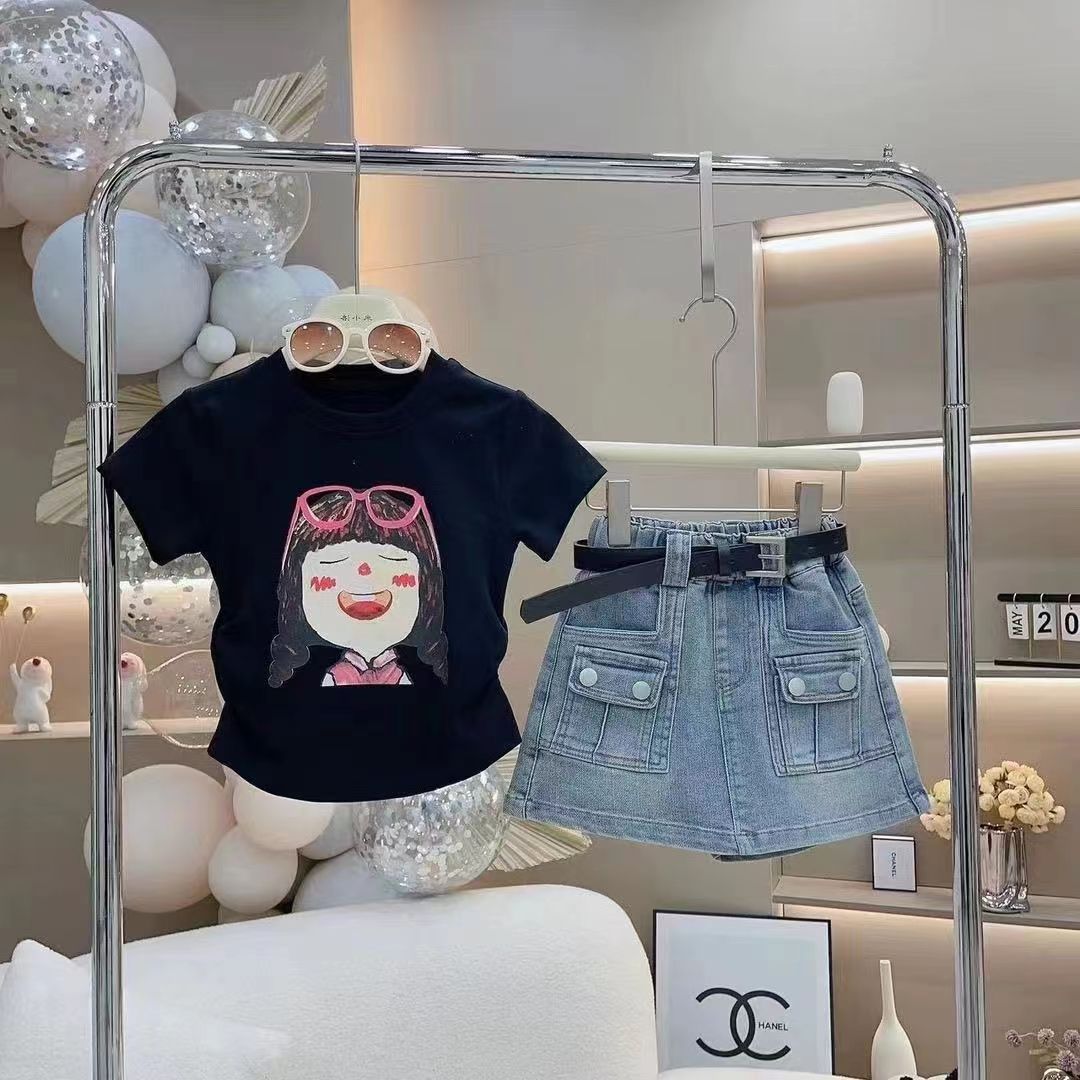 소녀 여름 세트 2024 여름 새로운 어린이 세련된 반팔 티셔츠 데님 스커트 여름 투피스 유행 세트스토어 가기