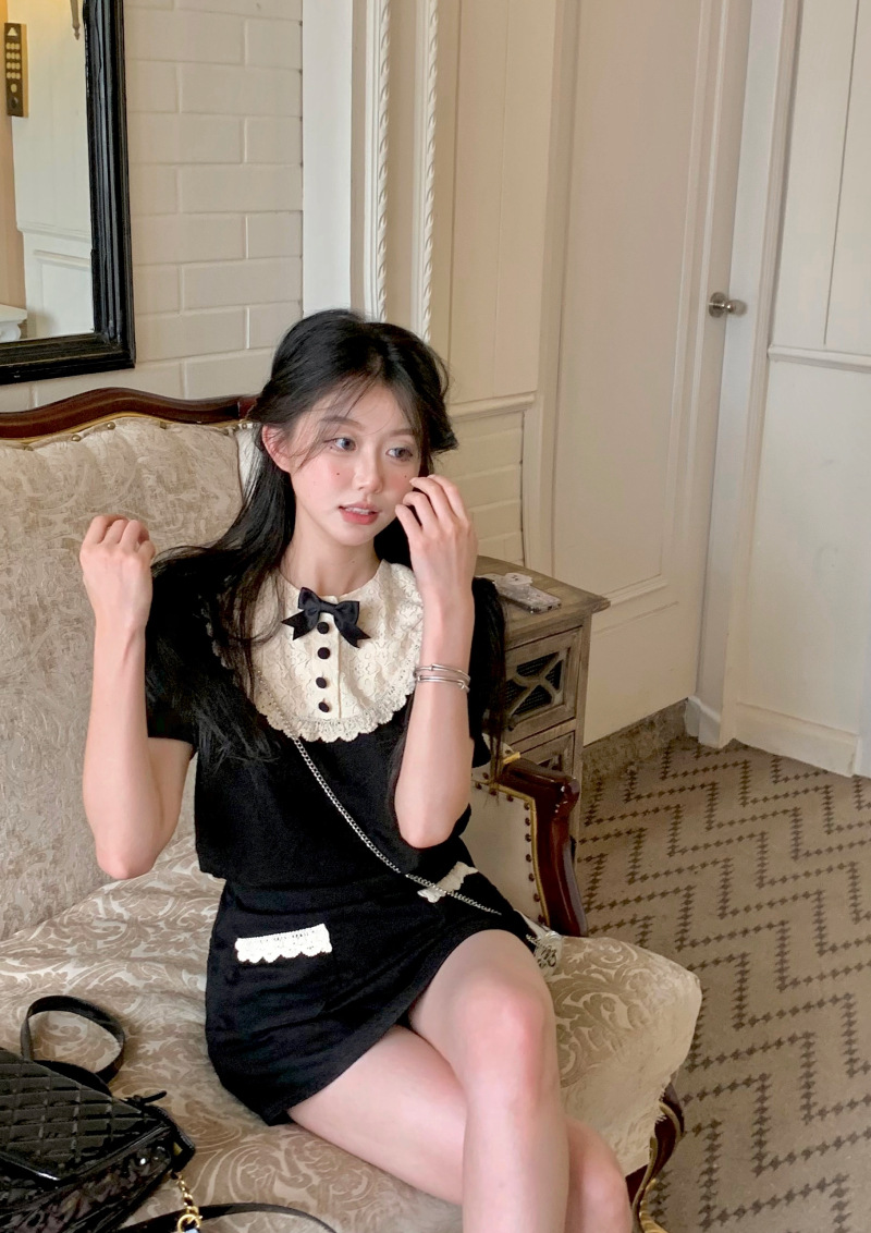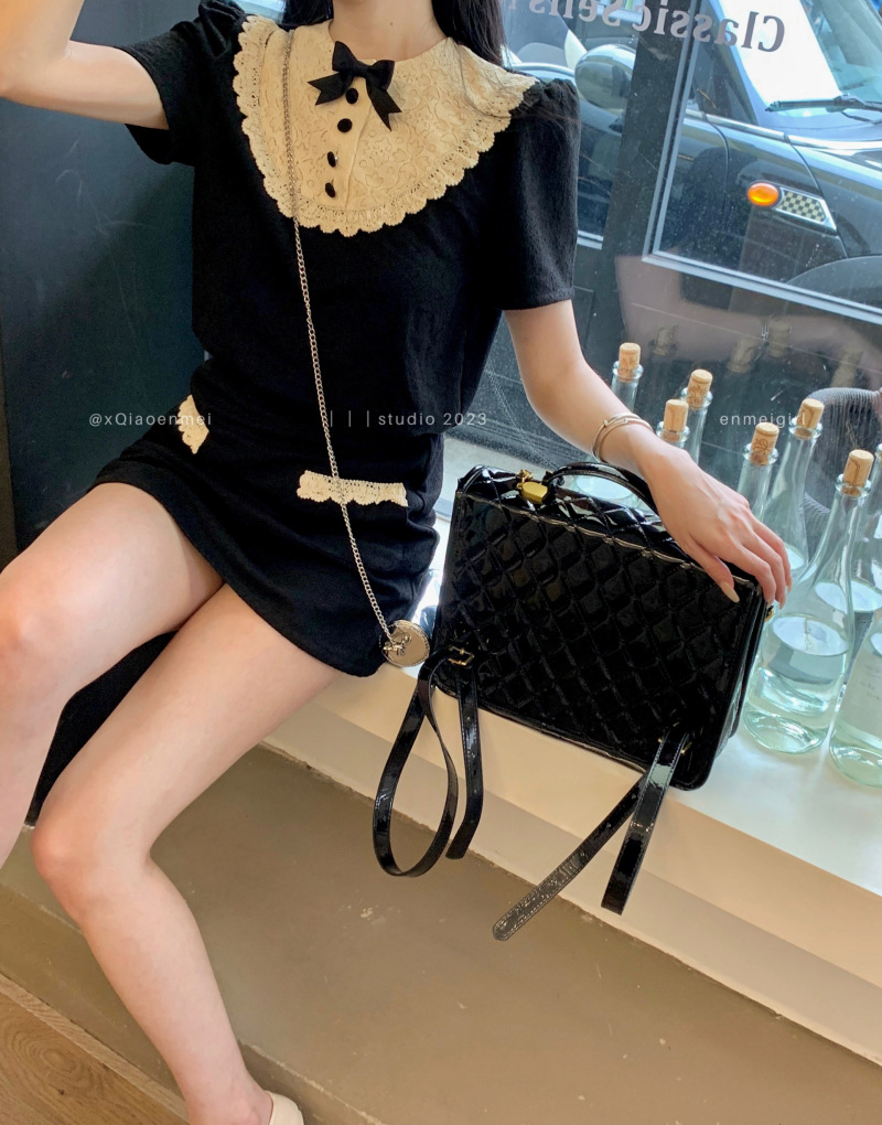 여름 새로운 스타일 샤넬 스타일 레이스 바느질 활 치마 여성의 여름 슬림 핏 슬리밍 유행 세트