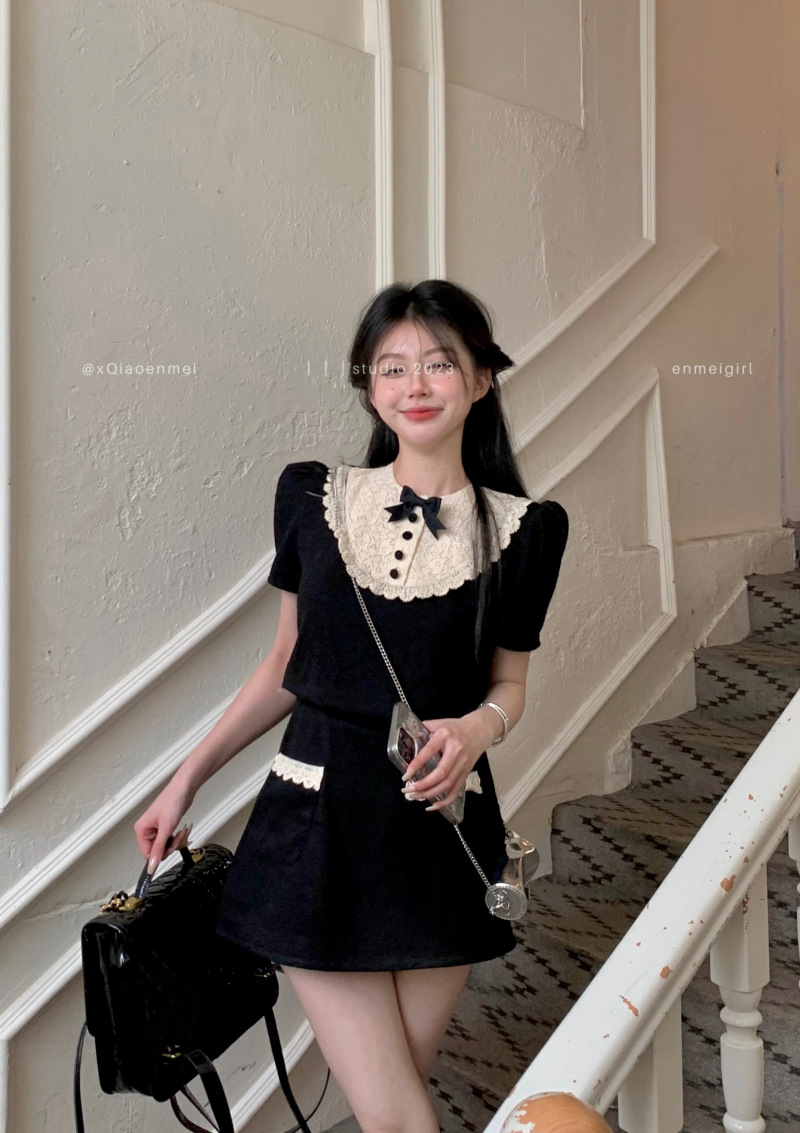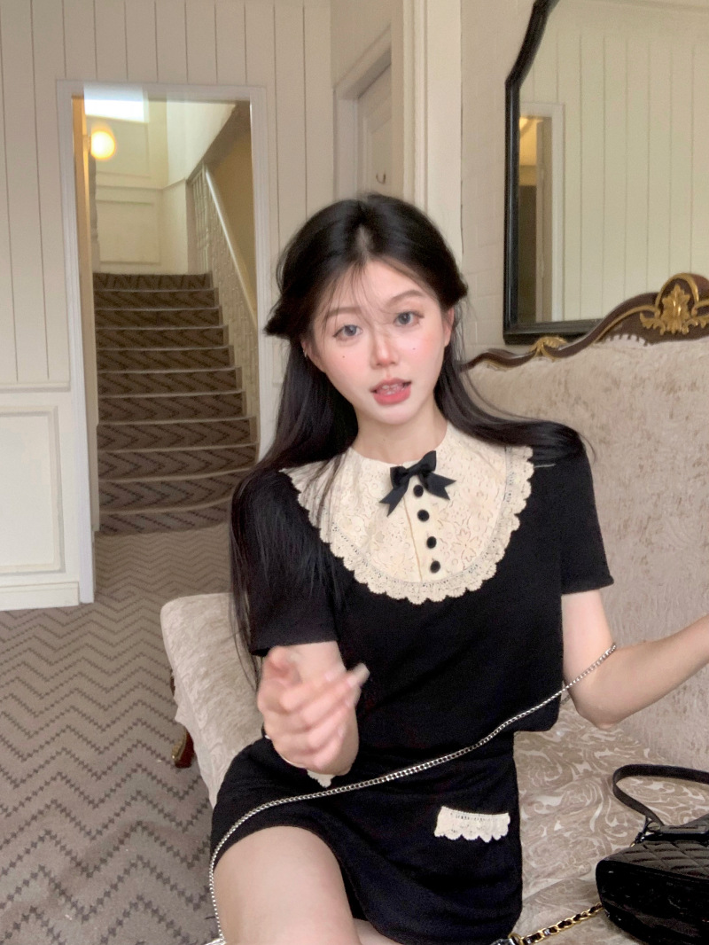 여름 새로운 스타일 샤넬 스타일 레이스 바느질 활 치마 여성의 여름 슬림 핏 슬리밍 유행 세트스토어 가기