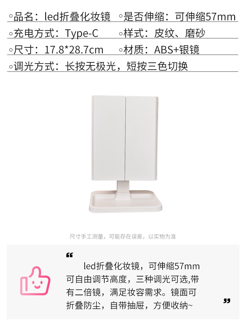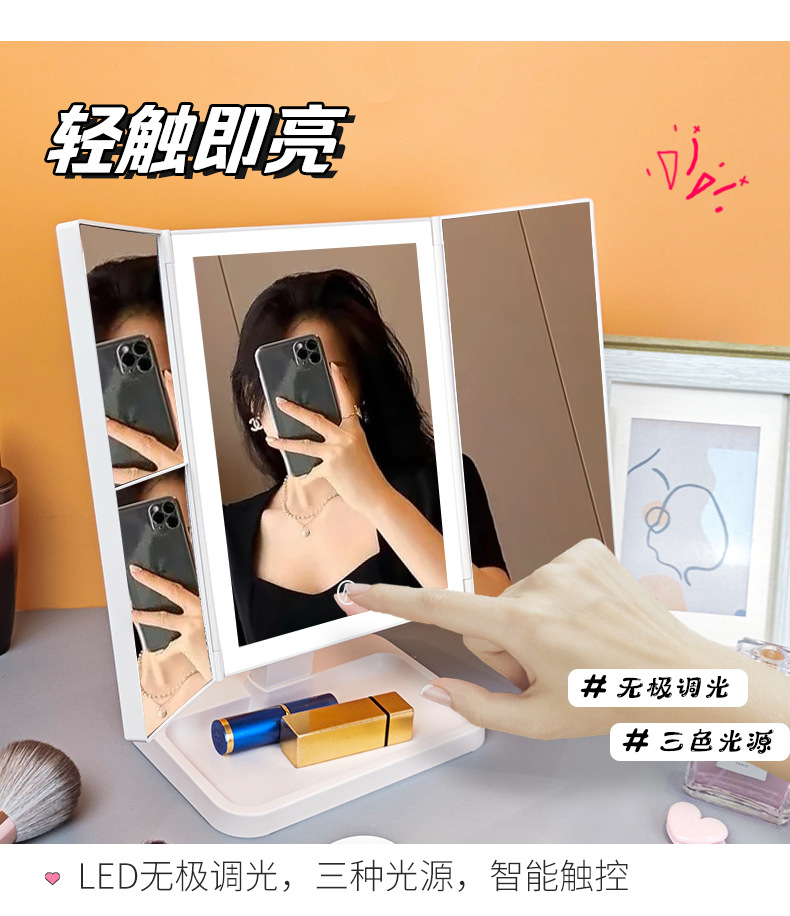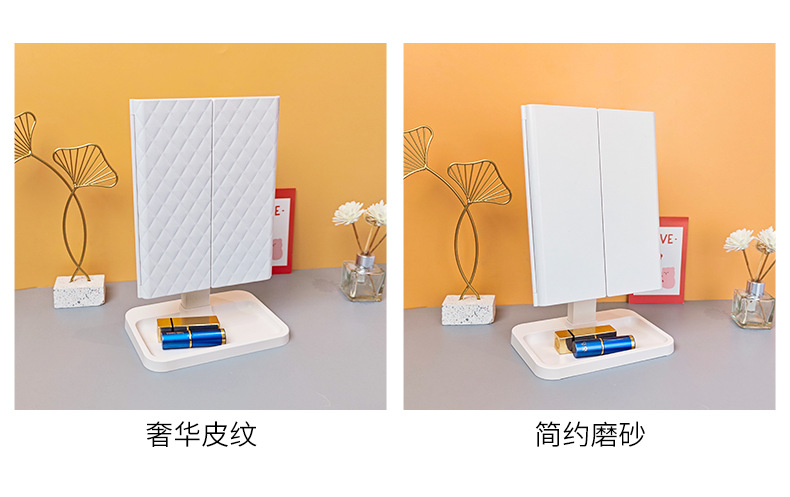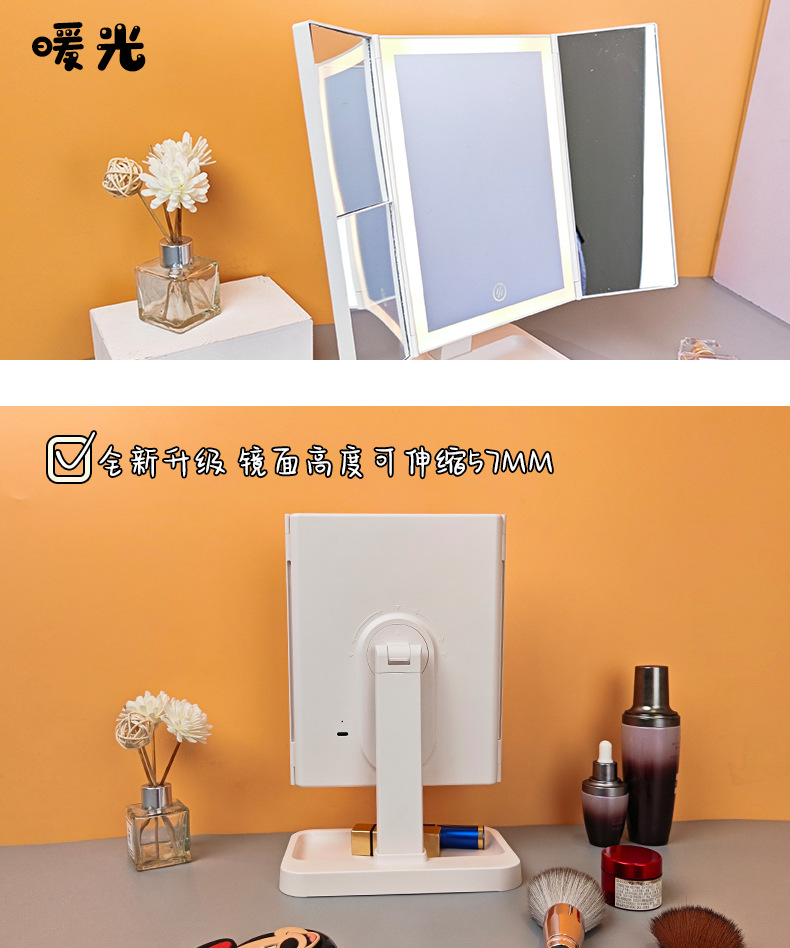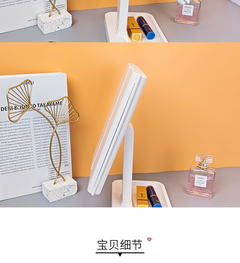 • 피부 질감 - 3색 조명 조절 가능 - 충전식 모델 + 하단 수납함 - 모서리가 둥글게 처리됨