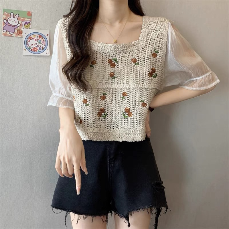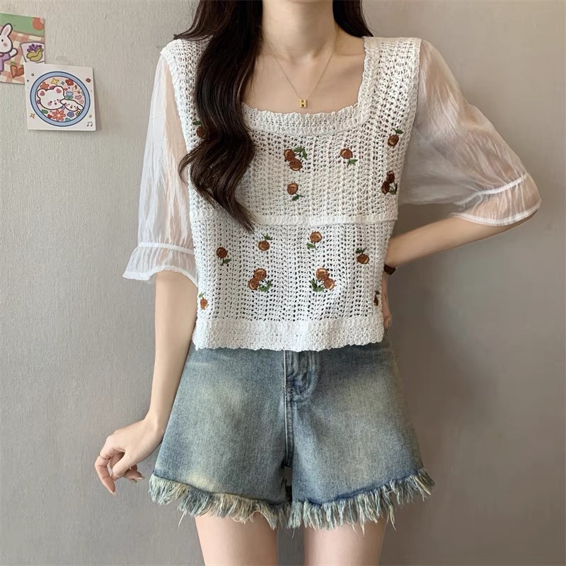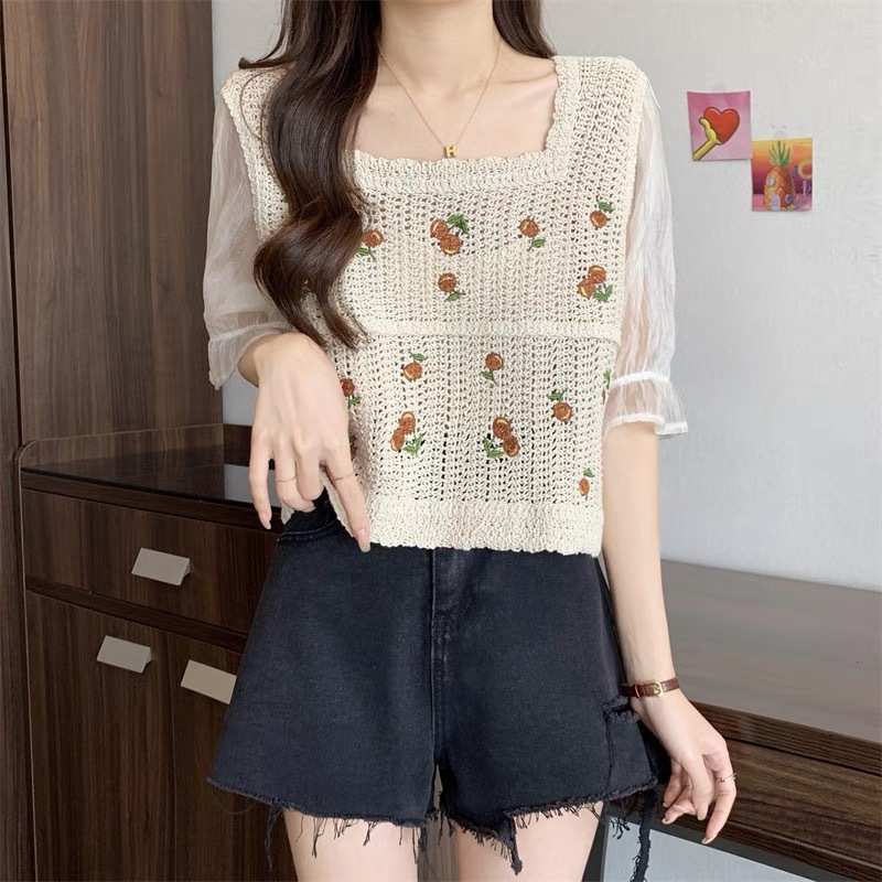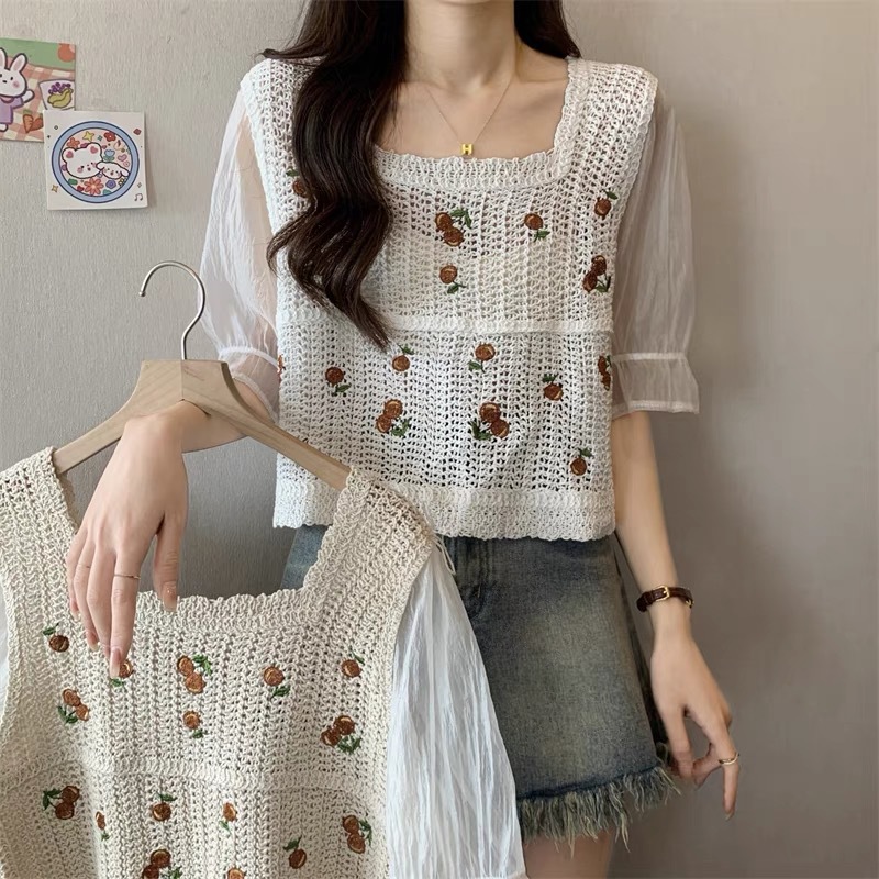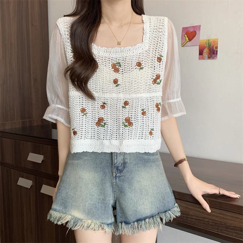 여름 새로운 할로우 쉬폰 셔츠 크로 셰 뜨개질 인쇄 느슨한 슬리밍 달콤한 신선한 귀여운 여성 의류스토어 가기