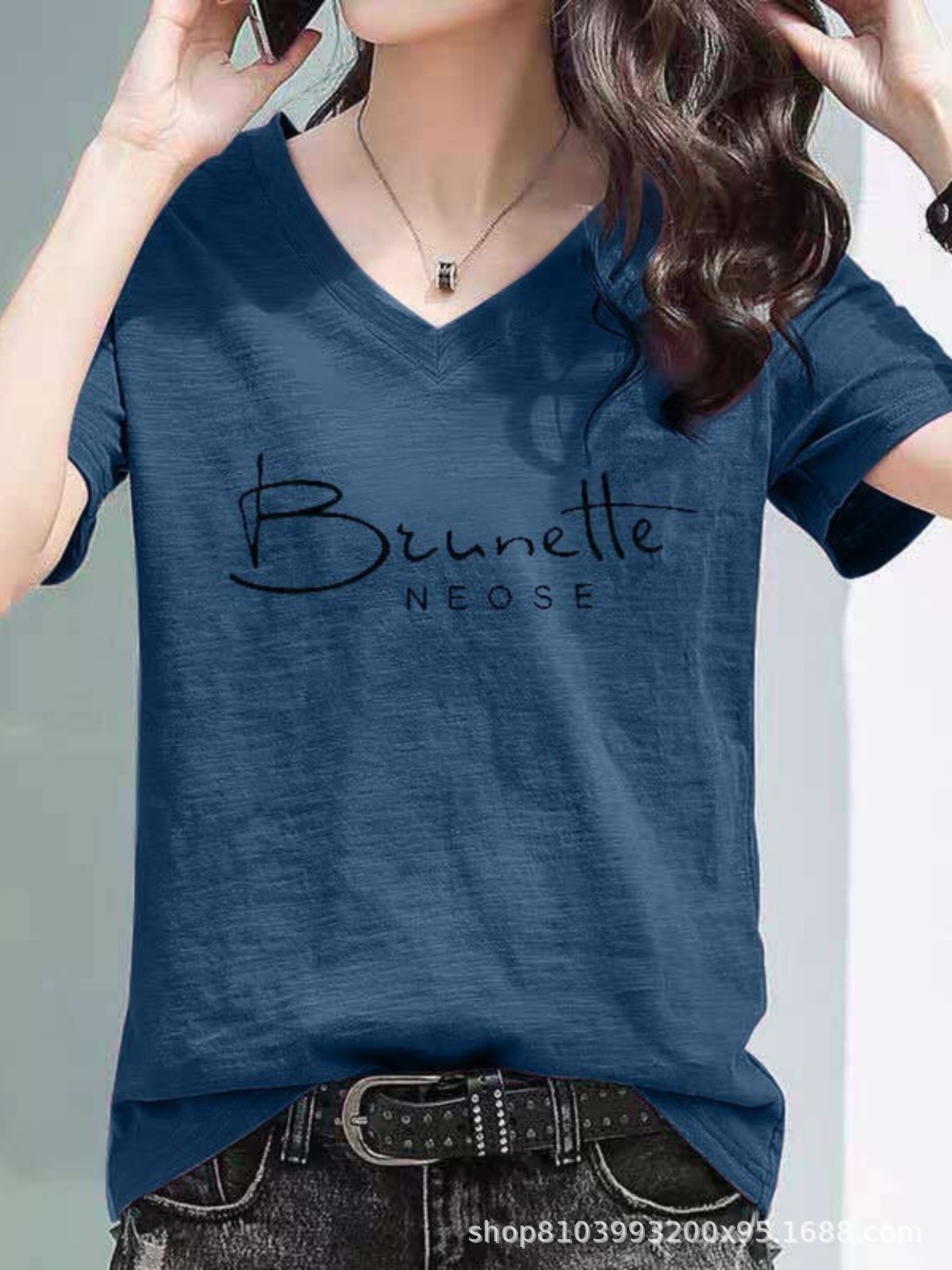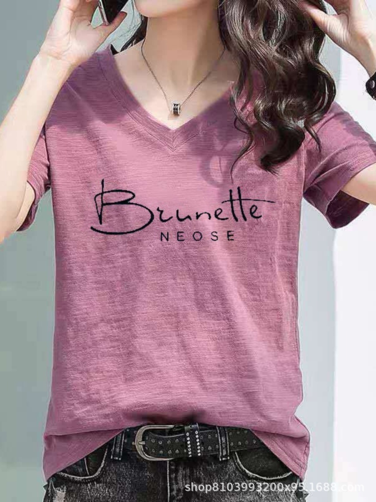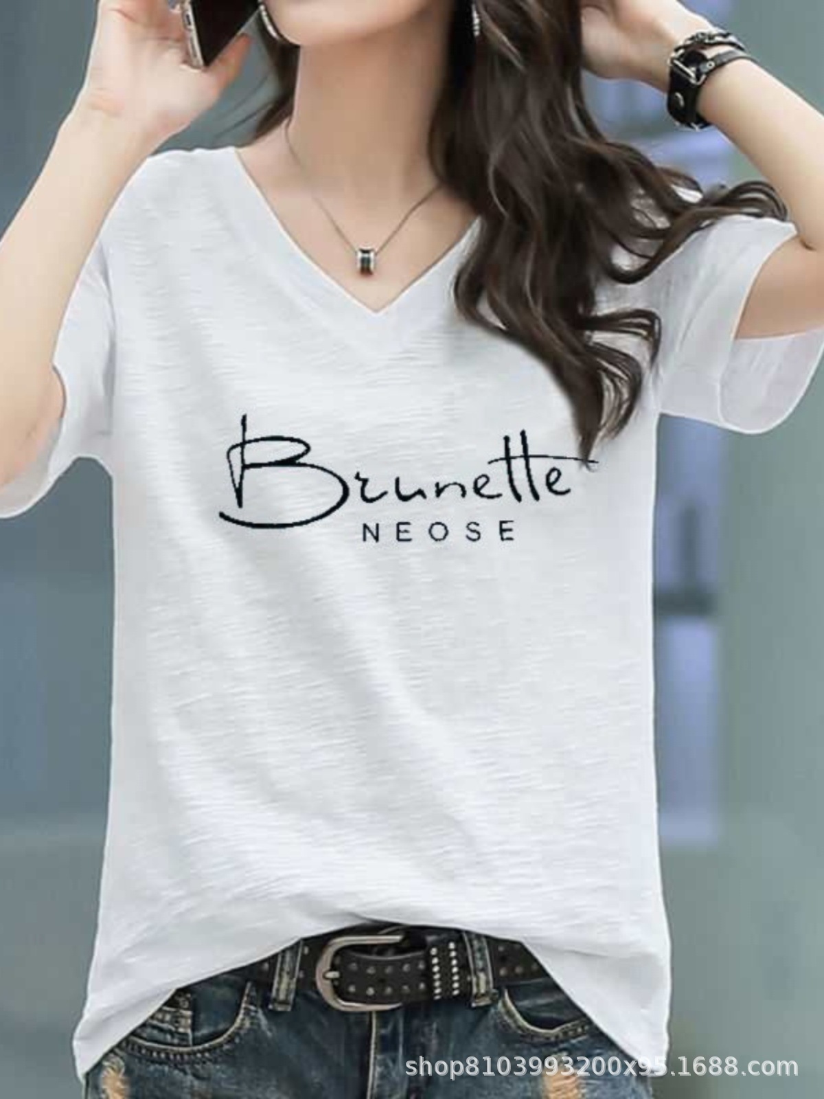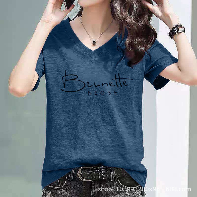 2024 년 여름 슬럽 코튼 티셔츠 여자 중공업 V 넥 라인스톤 반팔 한국 루스 플러스 사이즈 슬림 핏 올매치 탑스토어 가기