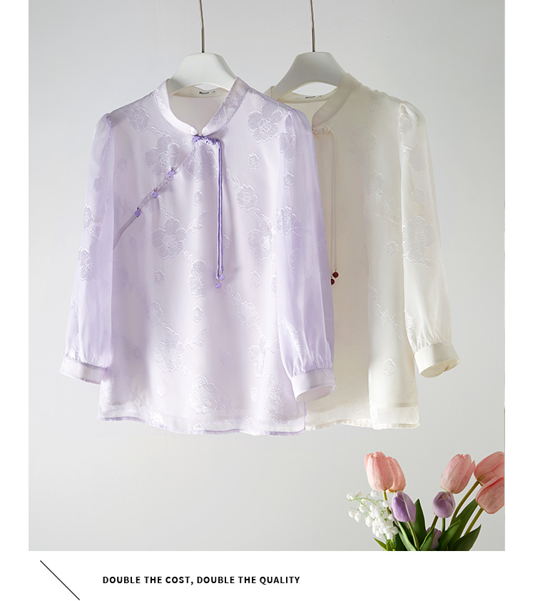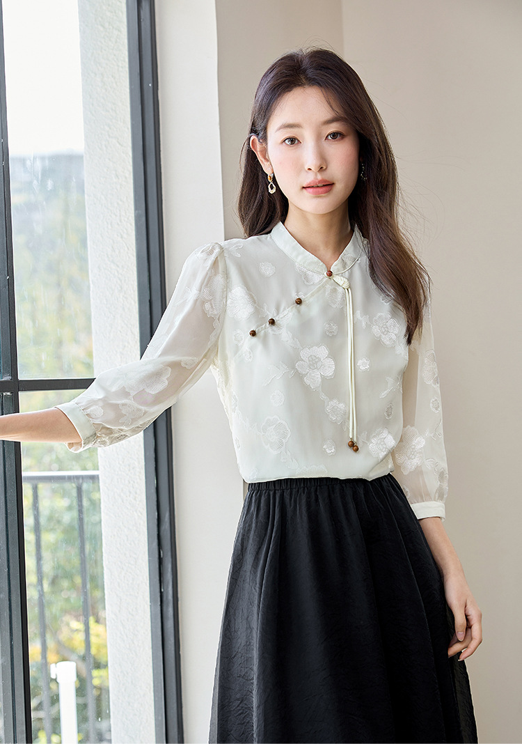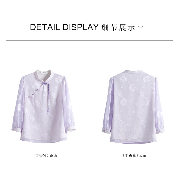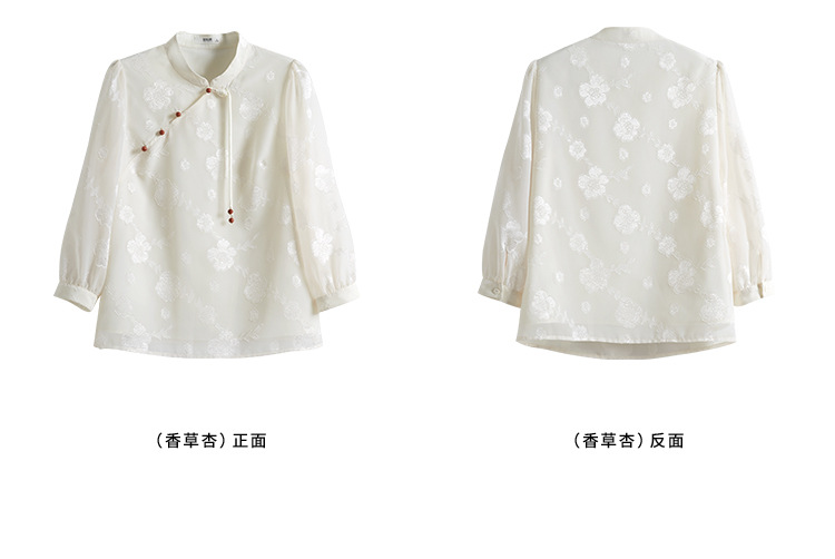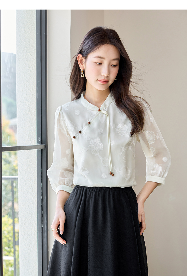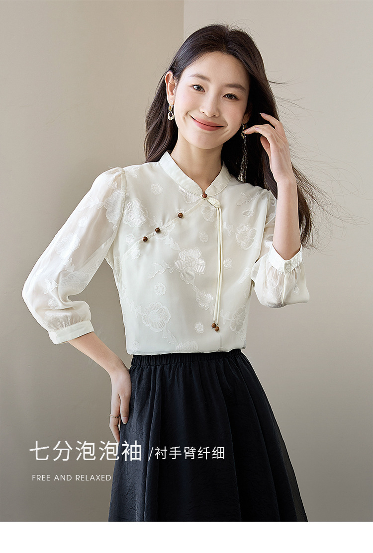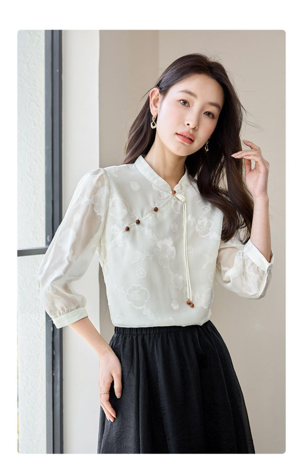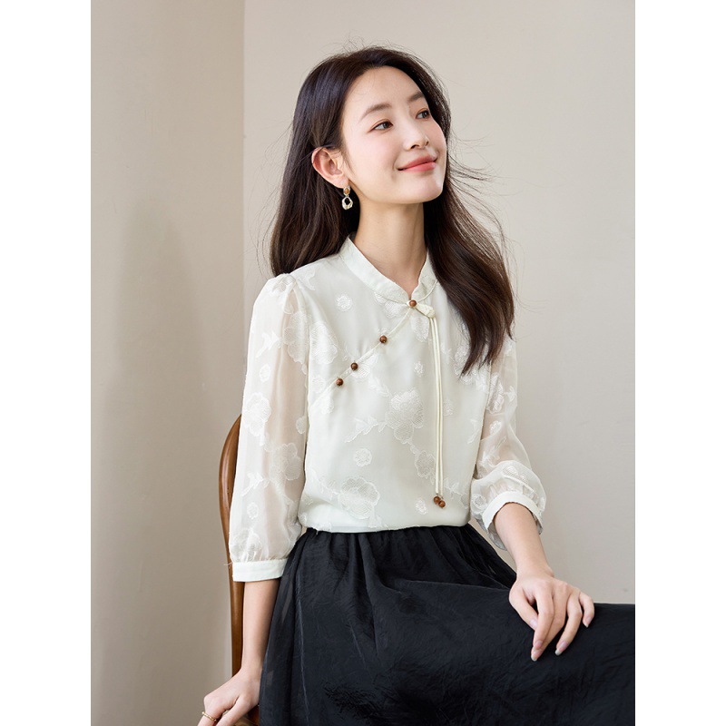 국가 스타일 개선 된 청삼 쉬폰 셔츠 봄과 여름 새로운 중국 스타일 수직 칼라 세븐 포인트 슬리브 셔츠 탑 153LS005