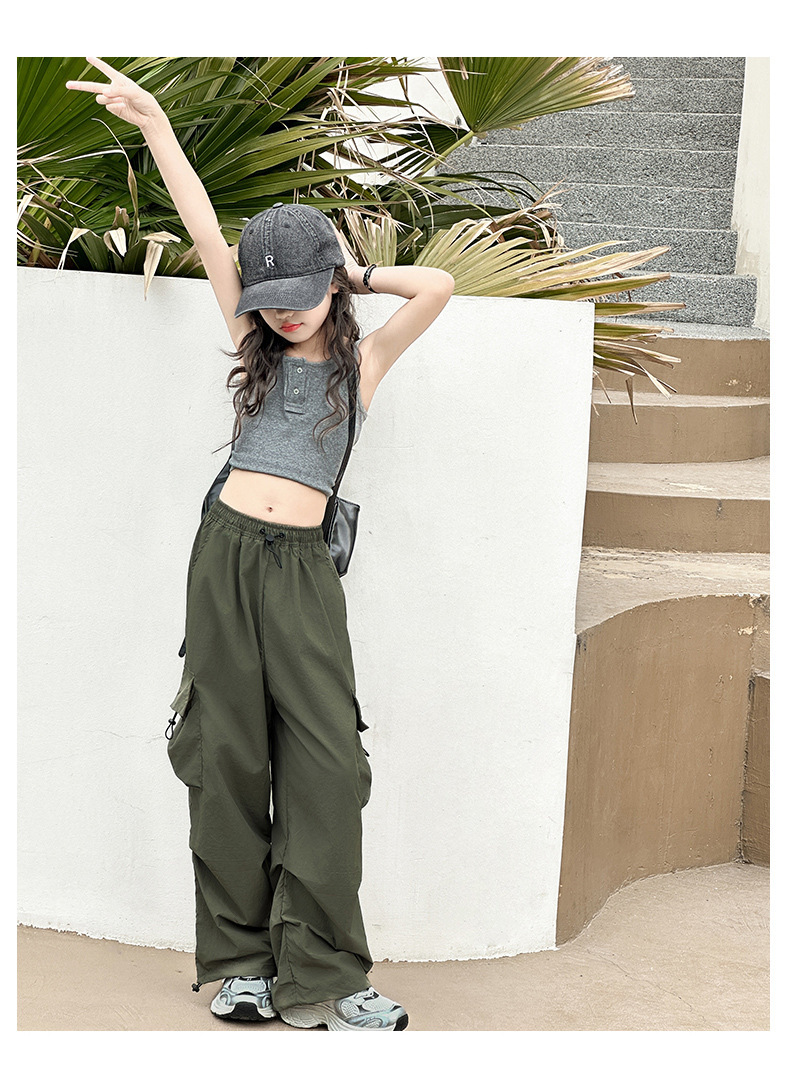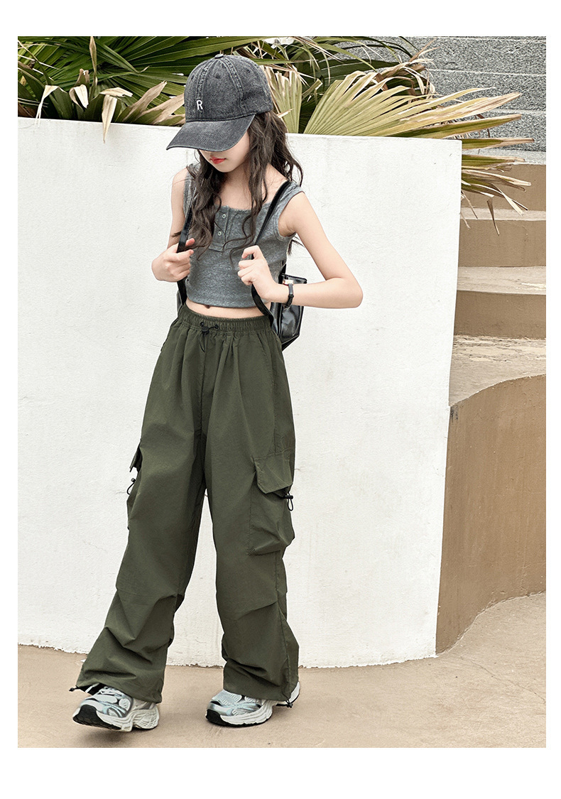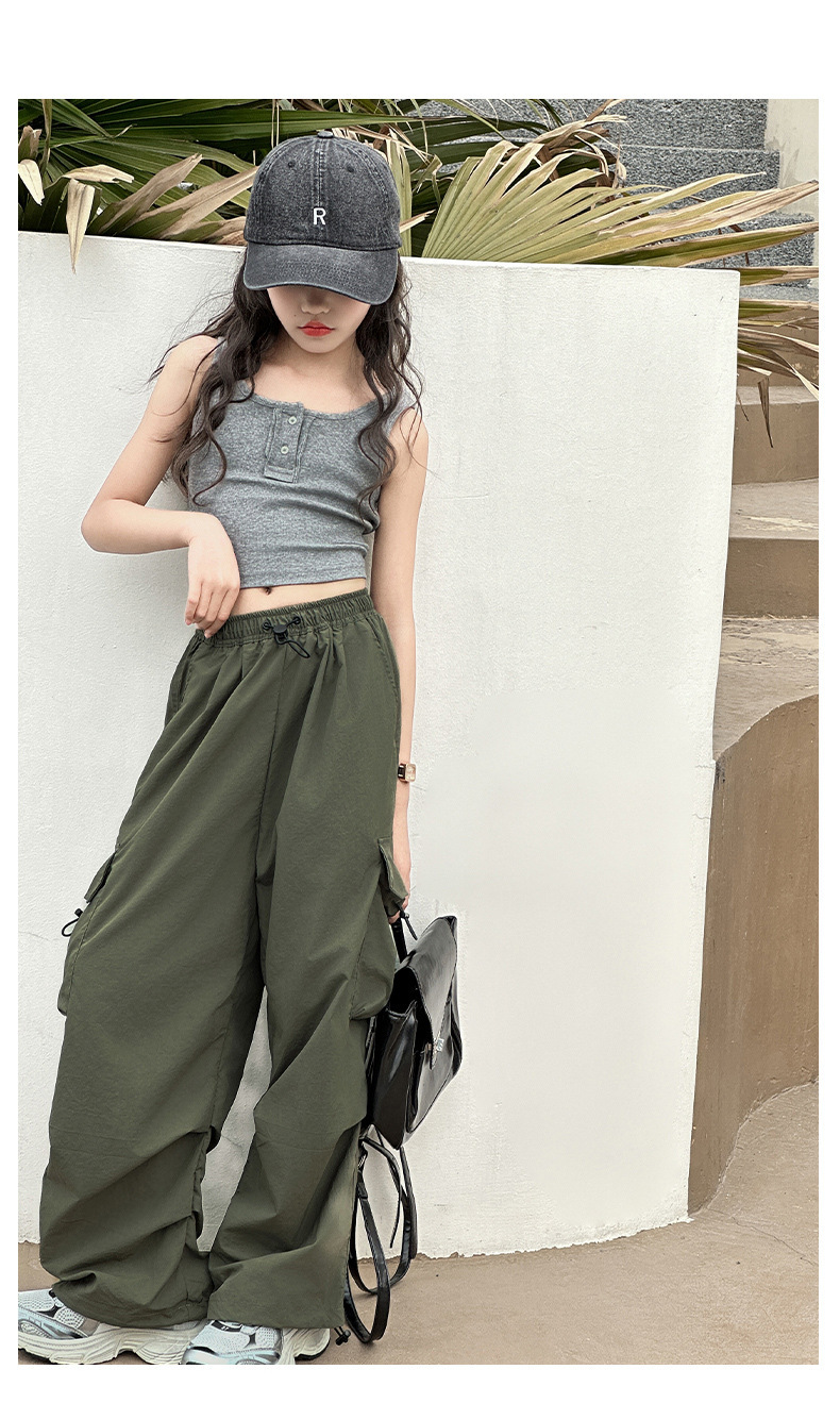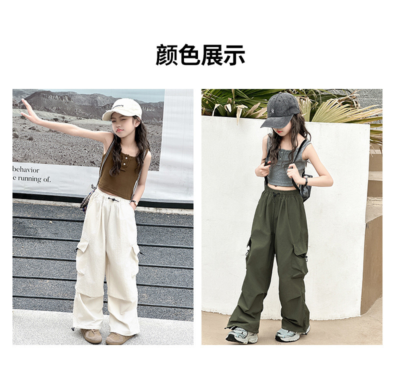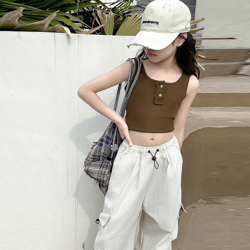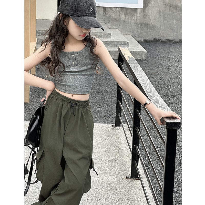 여자 크레인 바지 세트 새로운 2024 여름 어린이 캐주얼 조끼 티셔츠 안티 모기 와이드 레그 바지 투피스 세트 T스토어 가기