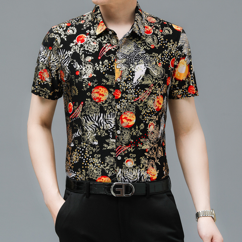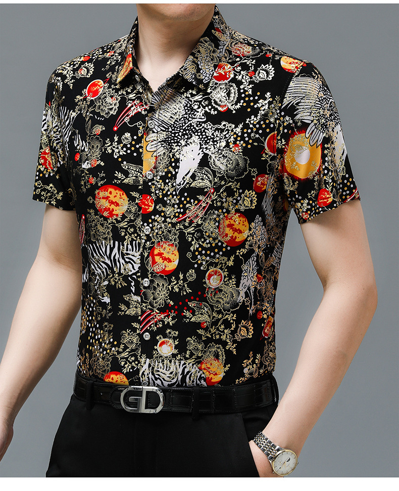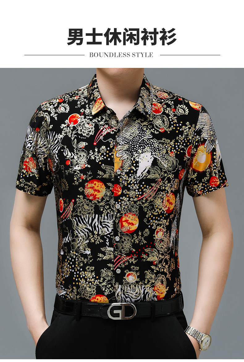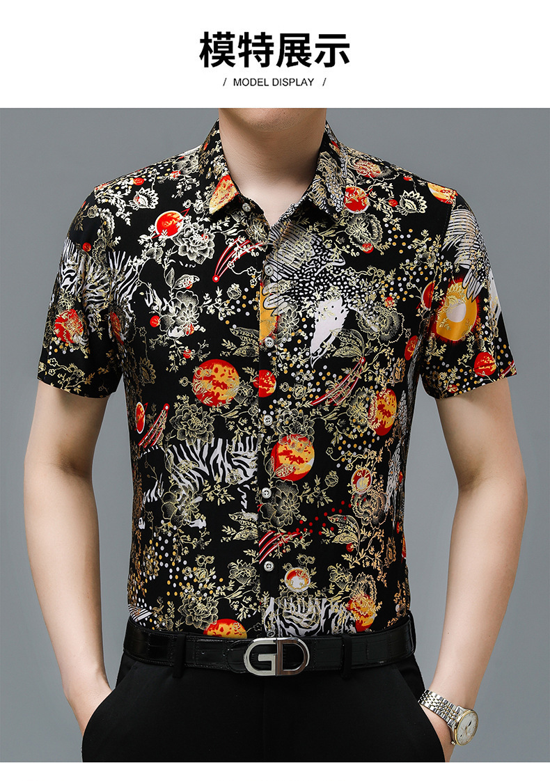 夏季潮流花色免烫休闲短袖百搭冰丝时髦防皱上衣中年男士翻领开衫