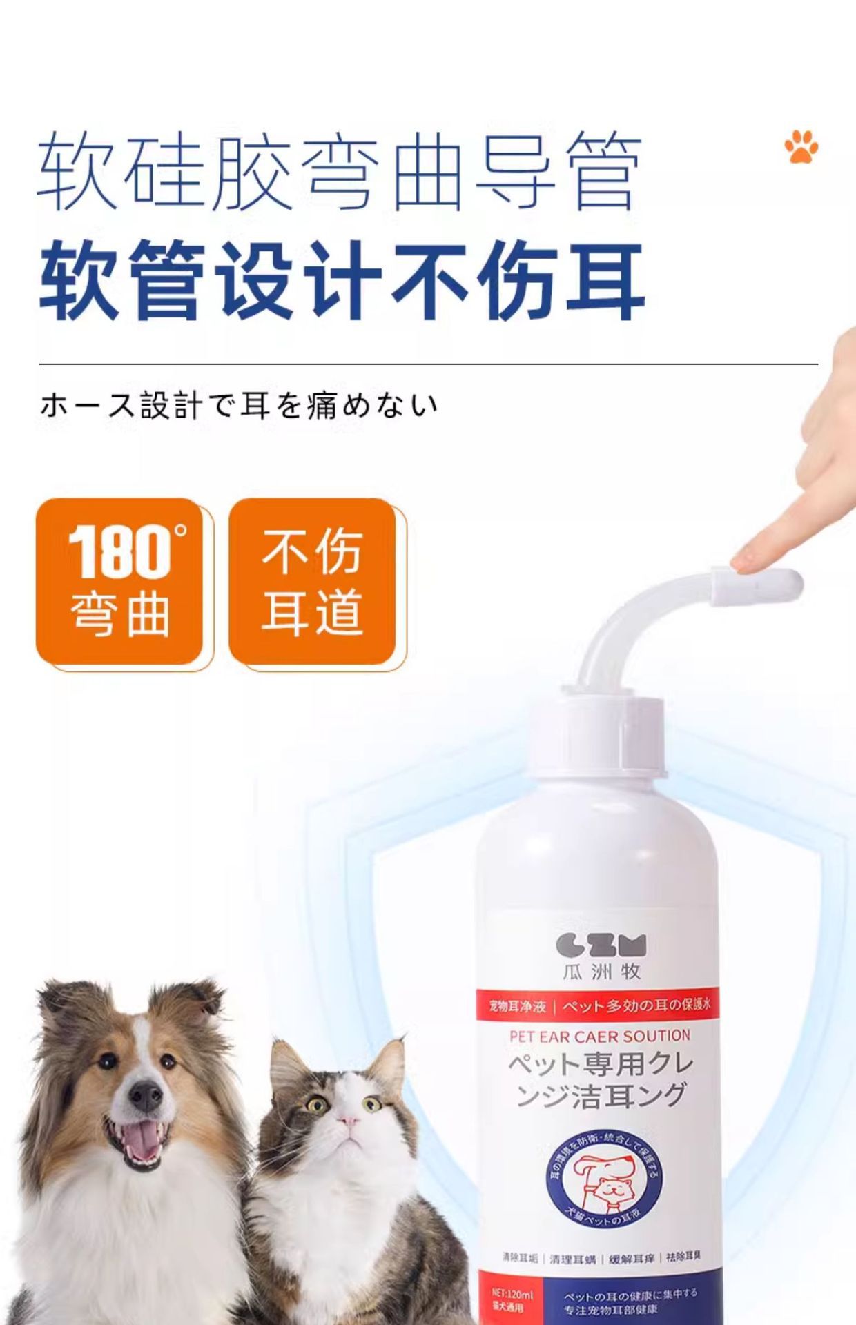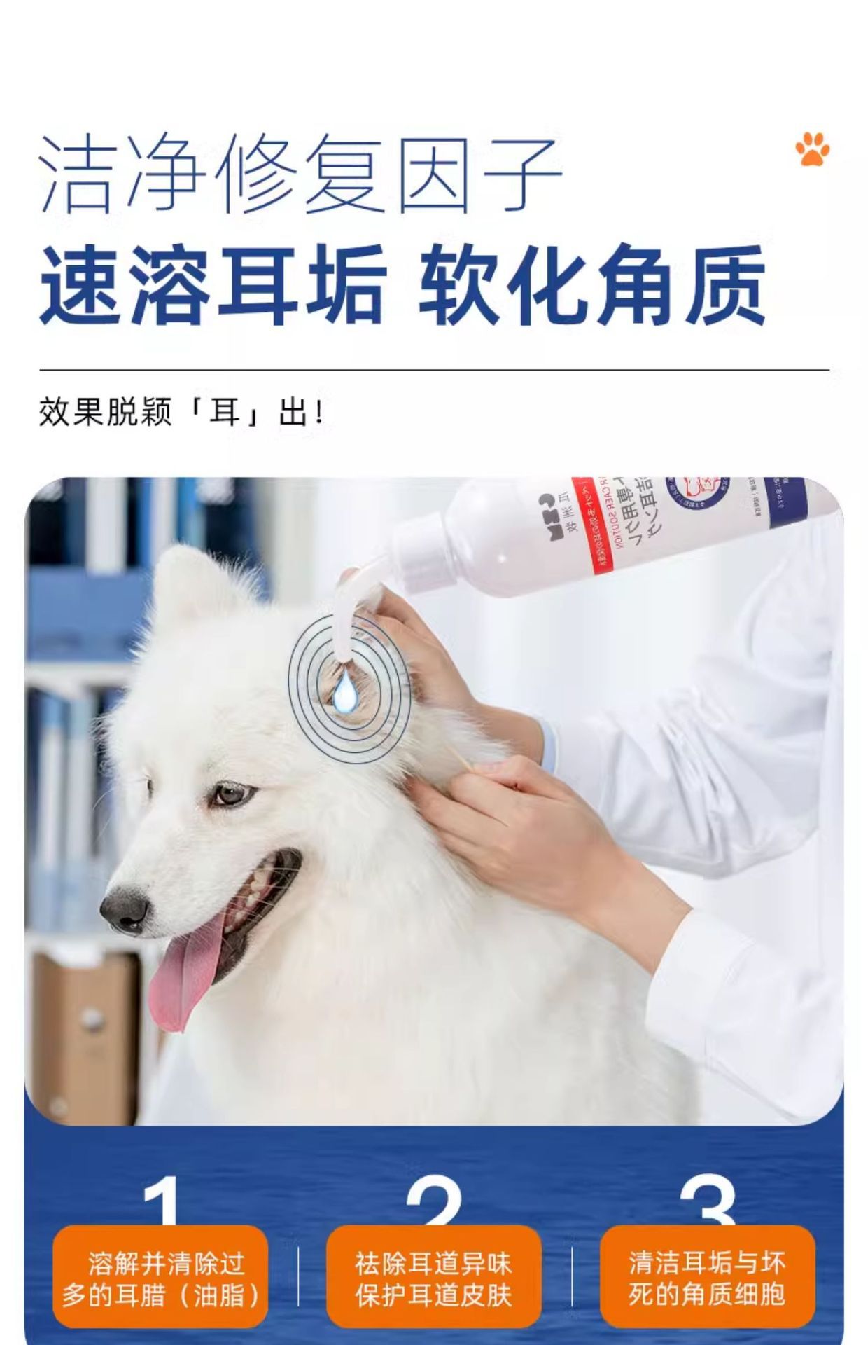 애완 동물 귀는 개를 위해 귀 청소 및 청소 액체를 떨어 뜨립니다. 개와 고양이를위한 귀 청소 액체