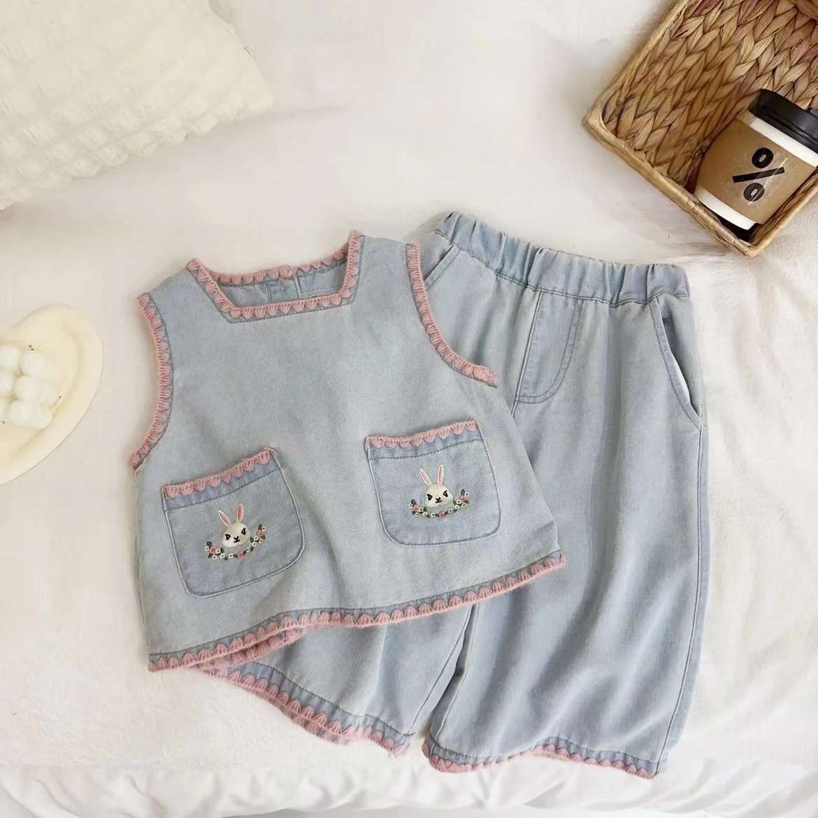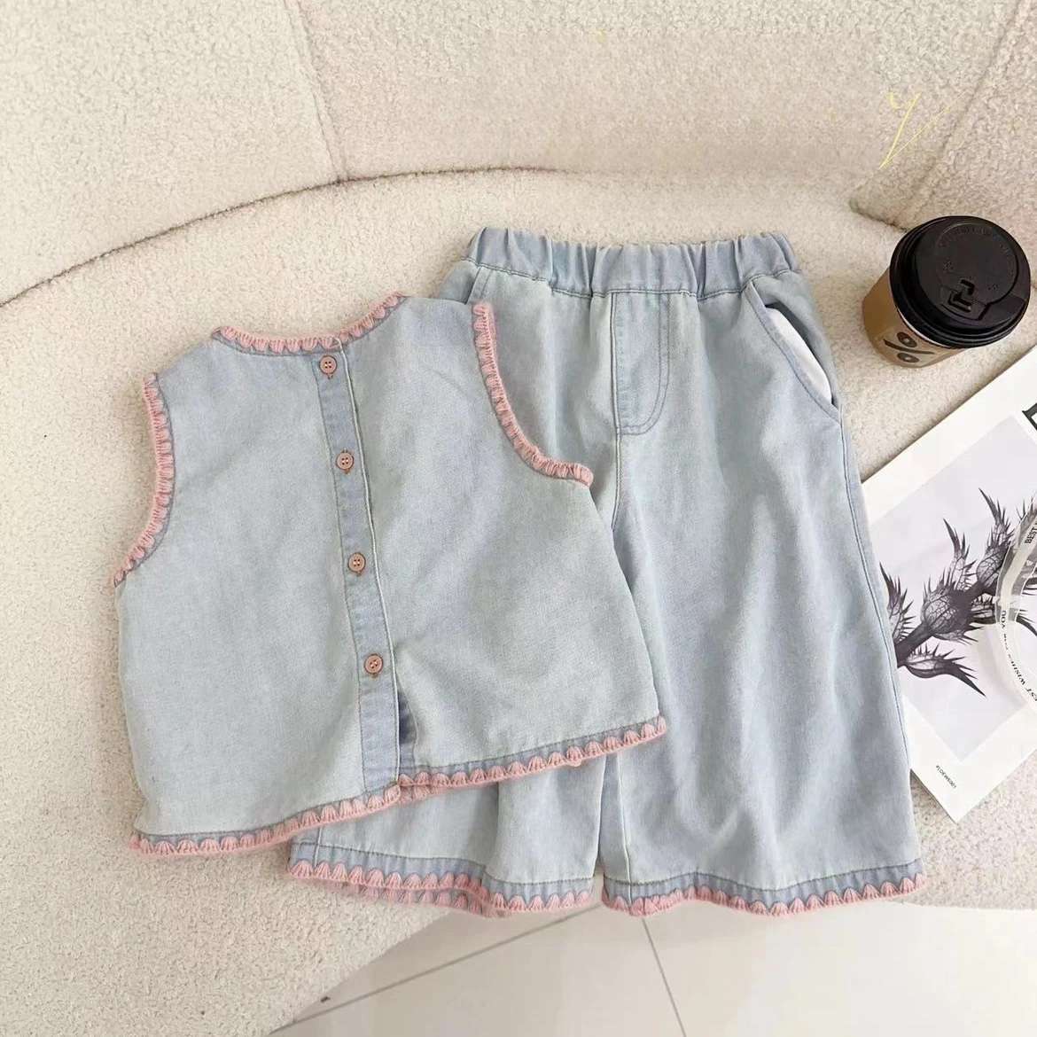 여름 서양식 세트 소녀의 한국 스타일 자수 라이트 블루 데님 투피스 자른 넓은 다리 바지 달콤한 스타일 여름 패션스토어 가기
