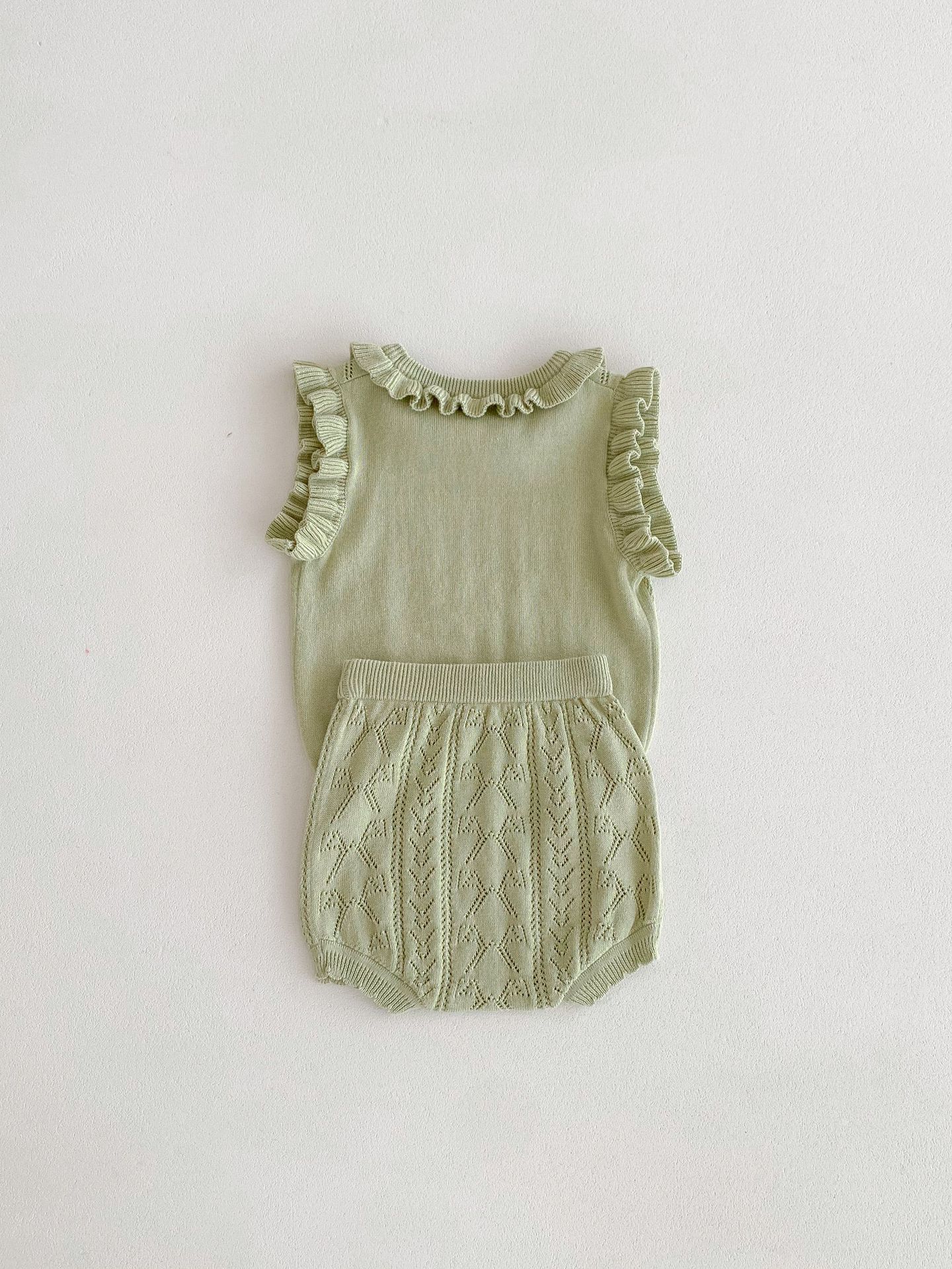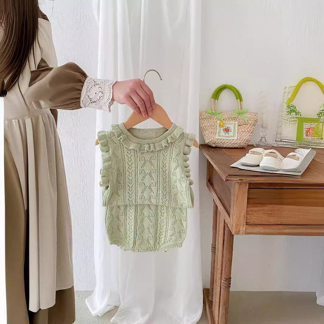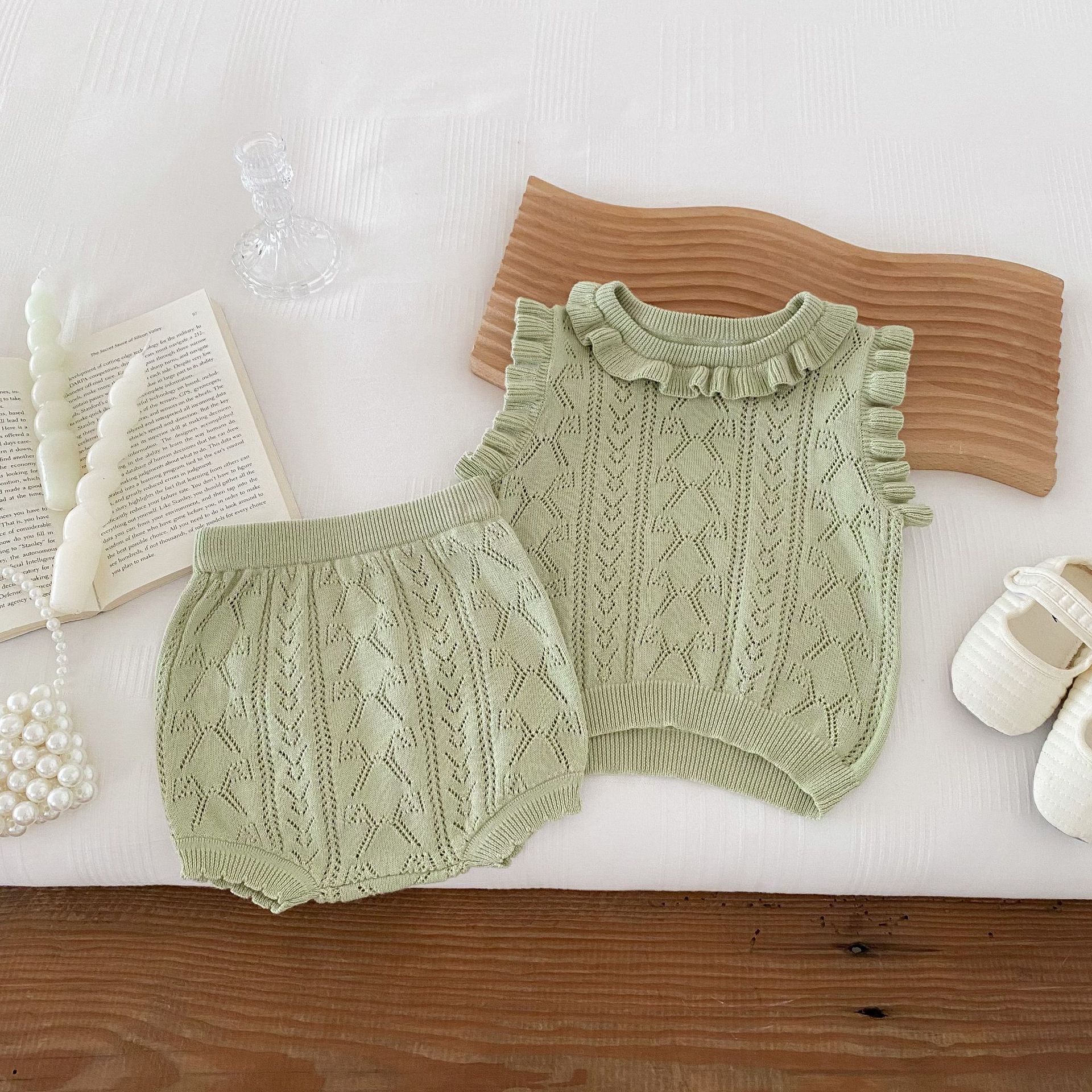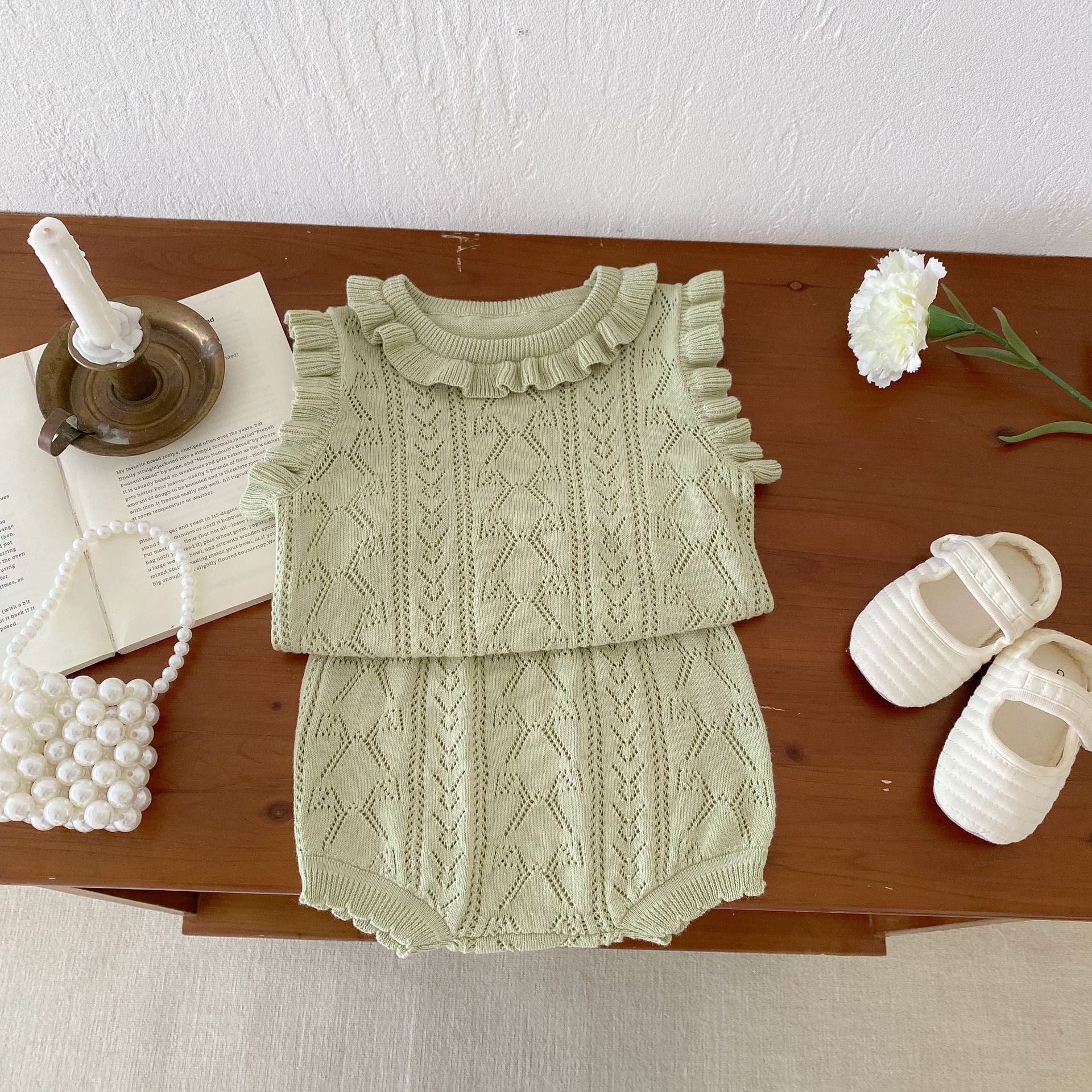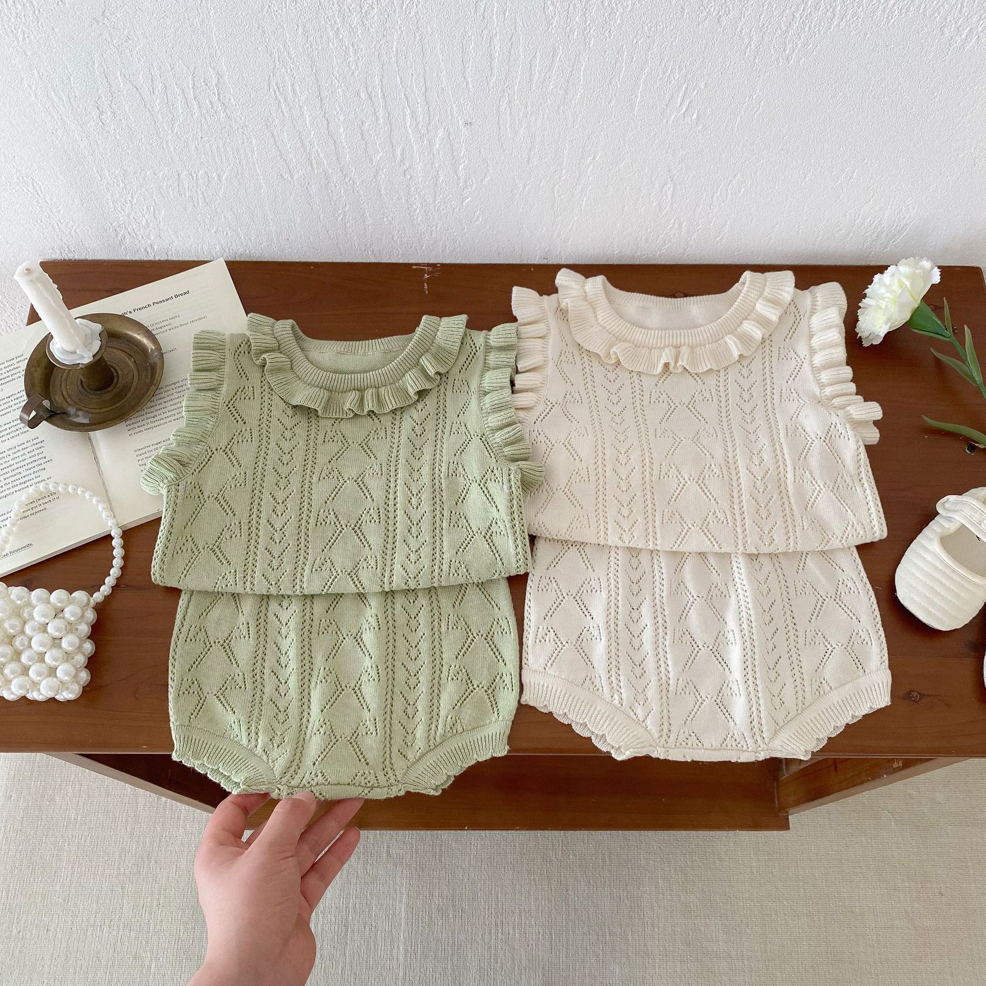 한국 스타일 아기 옷 여름 옷 아기 소녀의 니트 울 레이스 칼라 탑 반바지 공주 얇은 세트