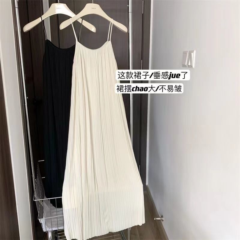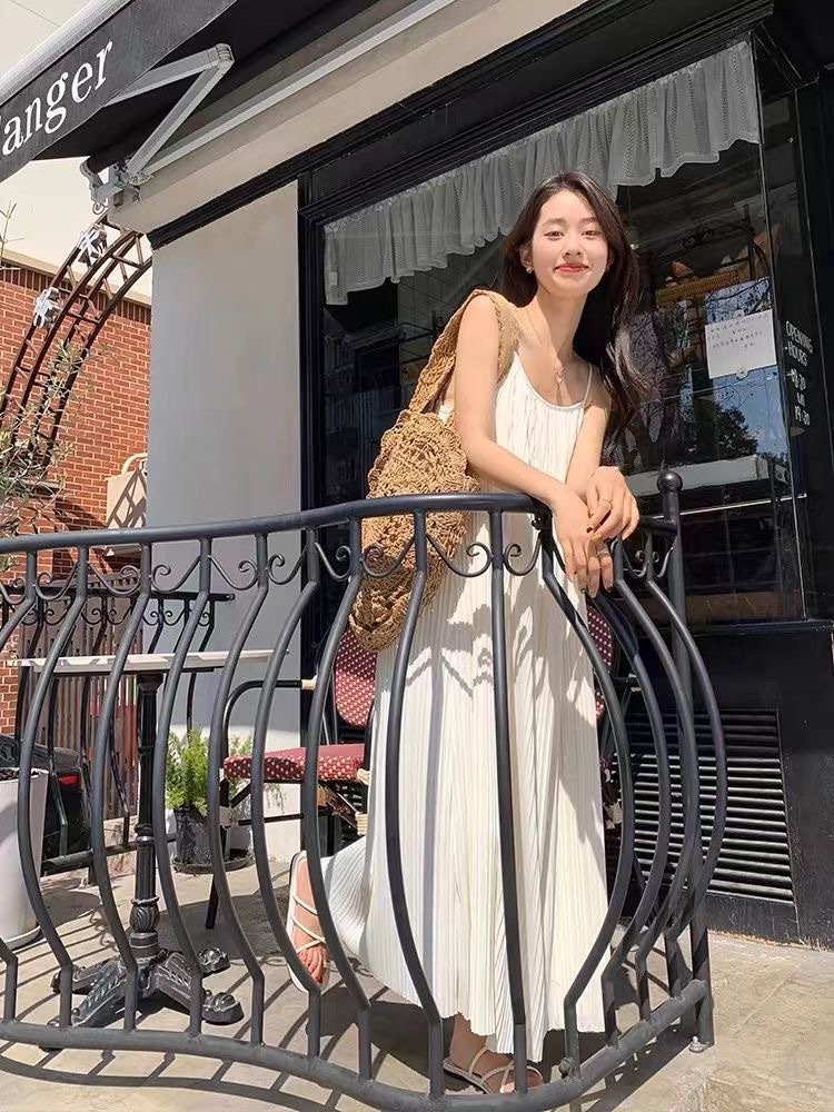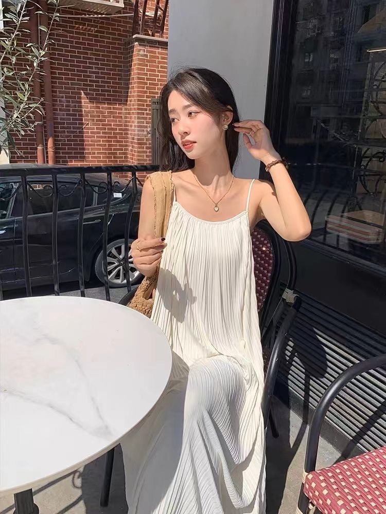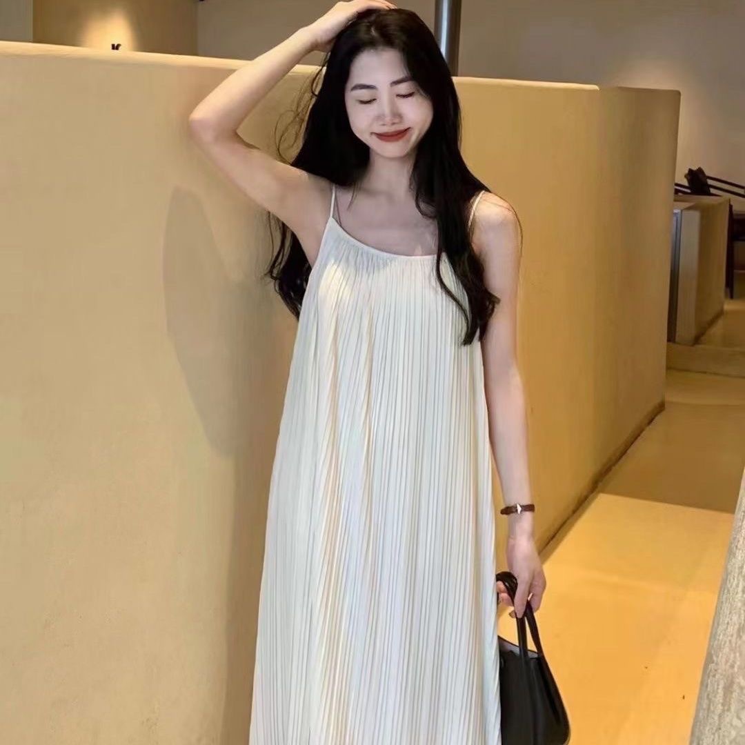 프랑스 스타일 달콤한 스타일 여름 큰 크기 여성의 주름 느슨한 슬링 원피스 게으른 스타일 단색 긴 하이 엔드 스타일스토어 가기
