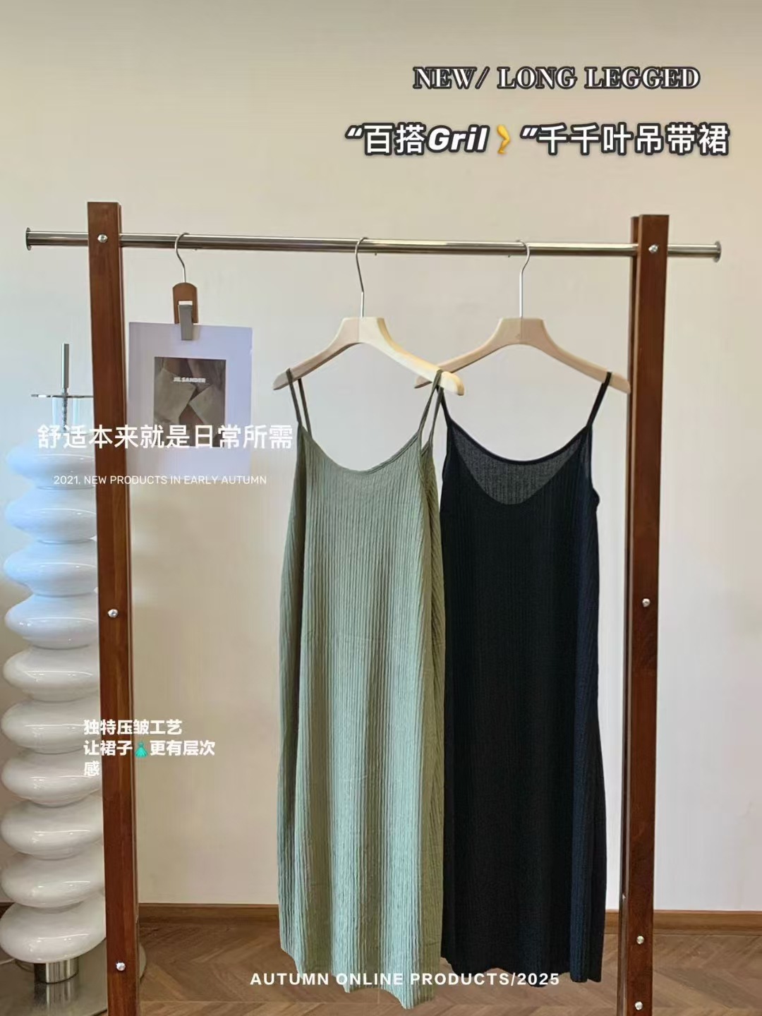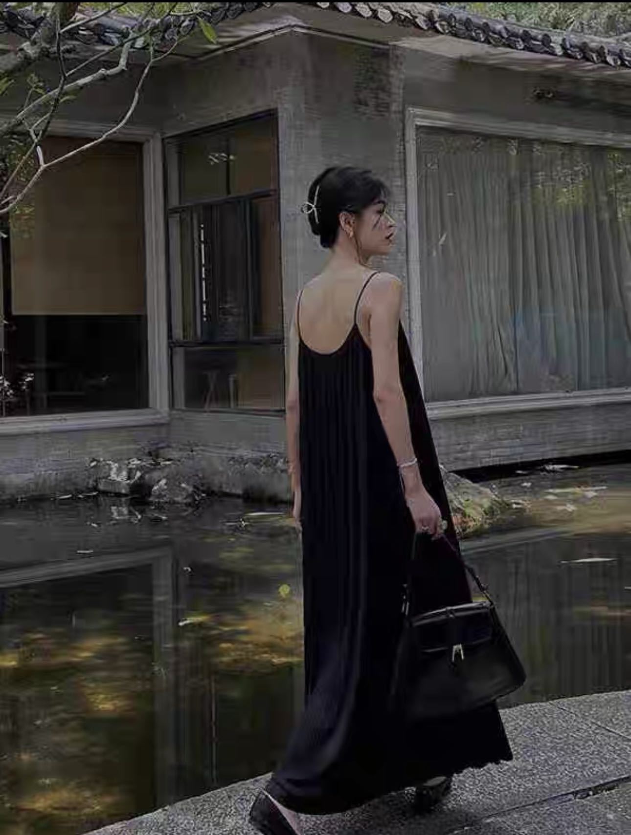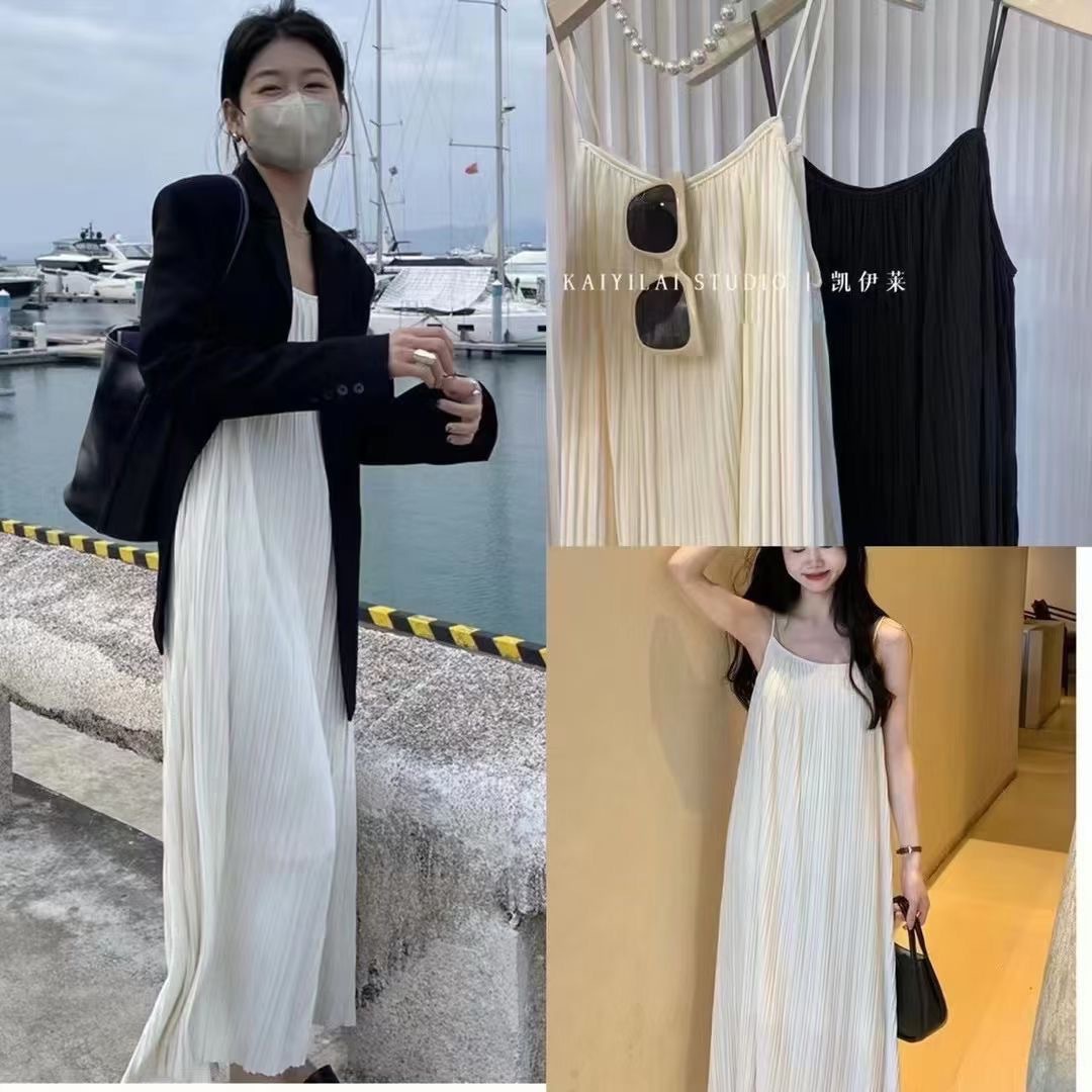 프랑스 스타일 달콤한 스타일 여름 큰 크기 여성의 주름 느슨한 슬링 원피스 게으른 스타일 단색 긴 하이 엔드 스타일스토어 가기