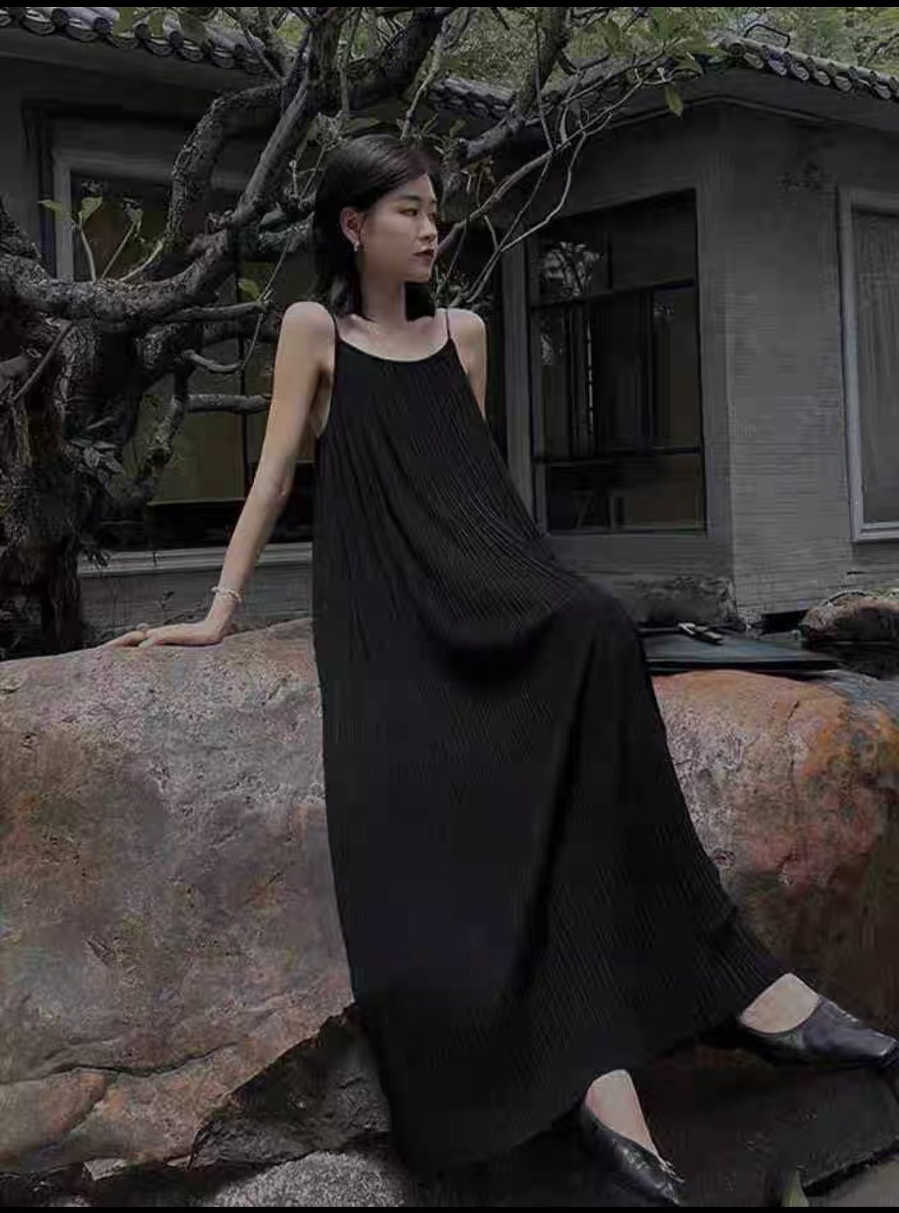 프랑스 스타일 달콤한 스타일 여름 큰 크기 여성의 주름 느슨한 슬링 원피스 게으른 스타일 단색 긴 하이 엔드 스타일