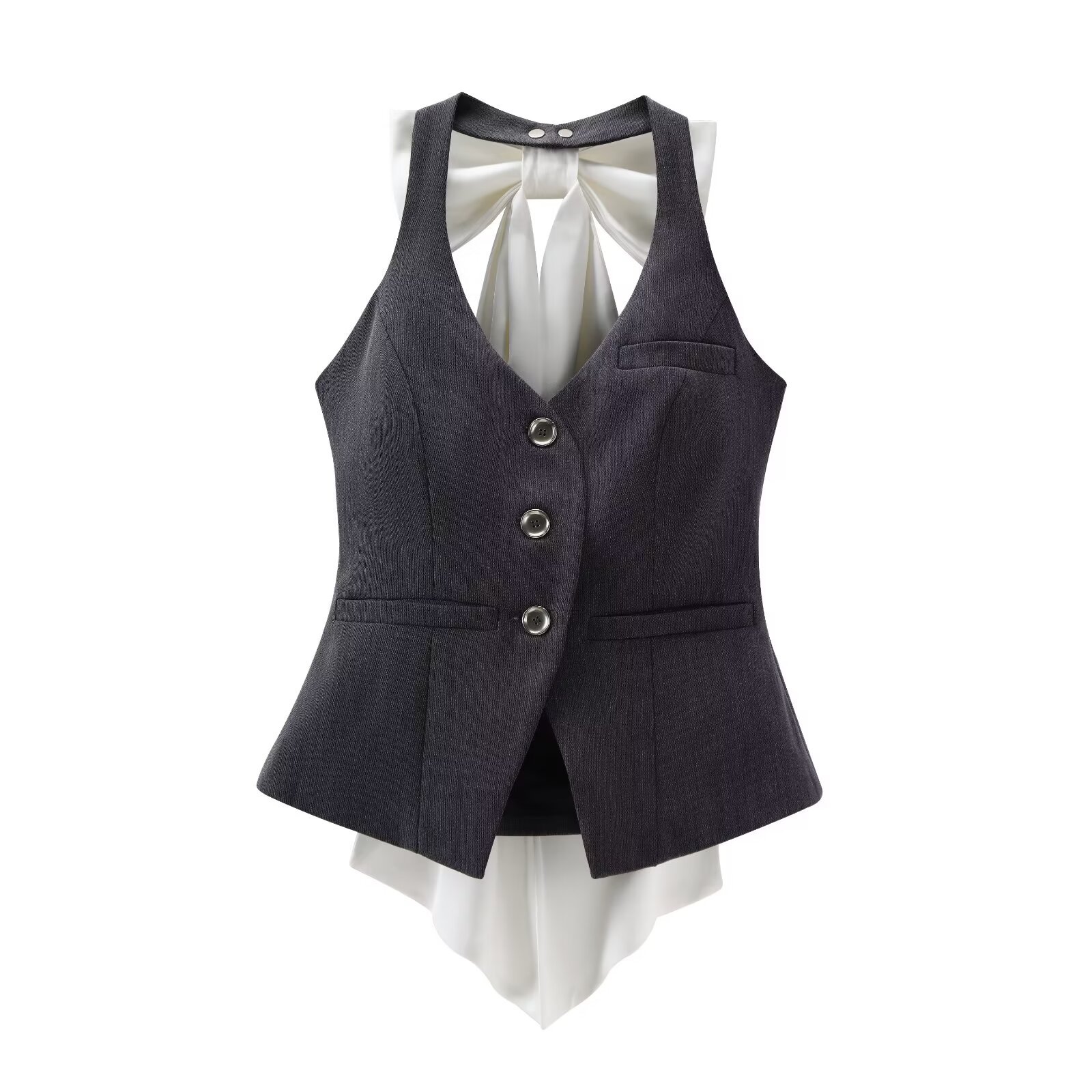 ZR 대외 무역 도매 유럽과 미국 스타일 여성 분리 가능한 활 백리스 넥 조끼 주름 치마 바지 세트