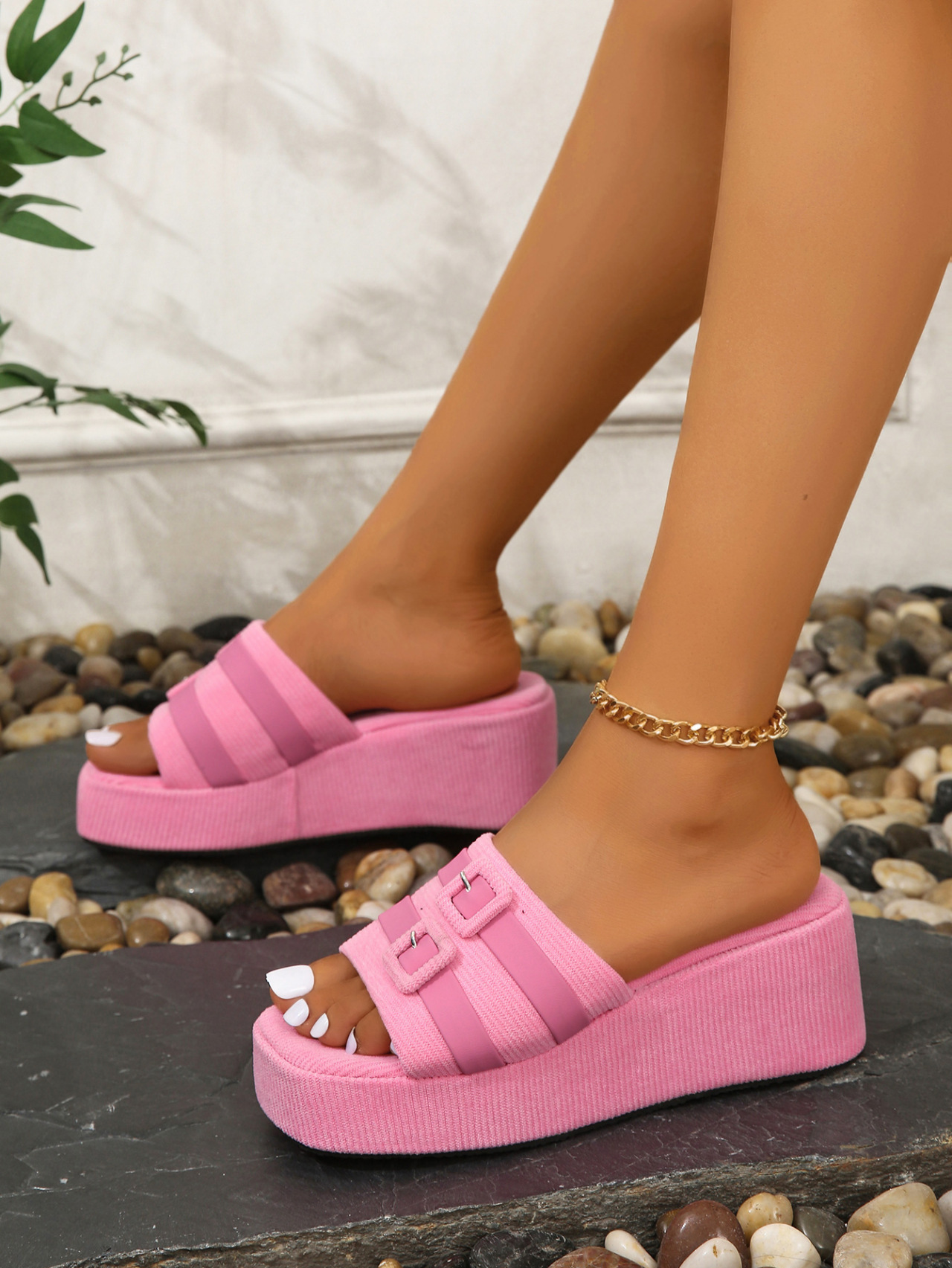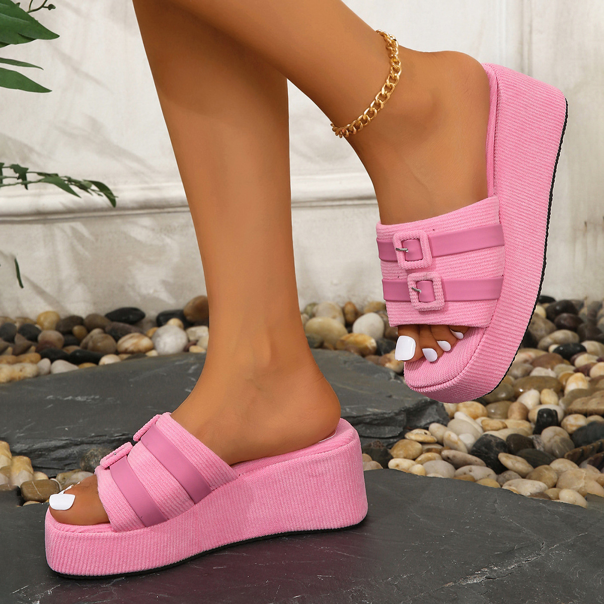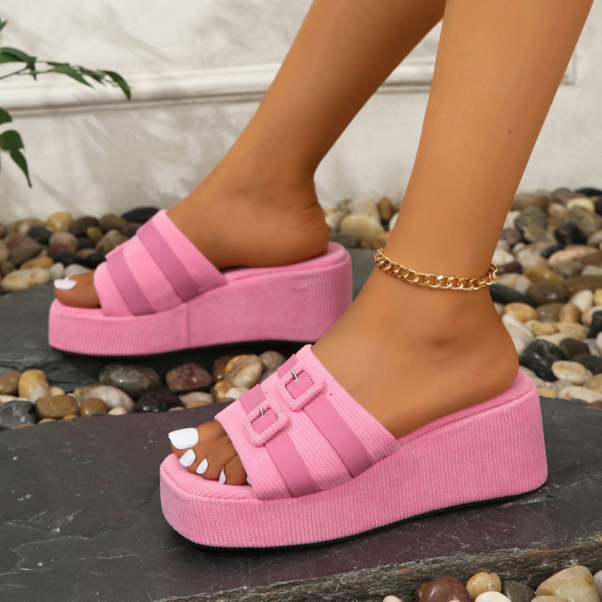 2024 새로운 여름 슬리퍼 여성 Ins Square 버클 두꺼운 바닥 캐주얼 홀리데이 비치 슬리퍼 두꺼운 바닥 강화 샌들 여성용