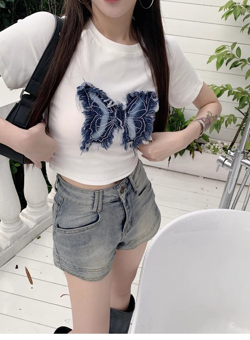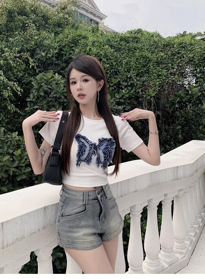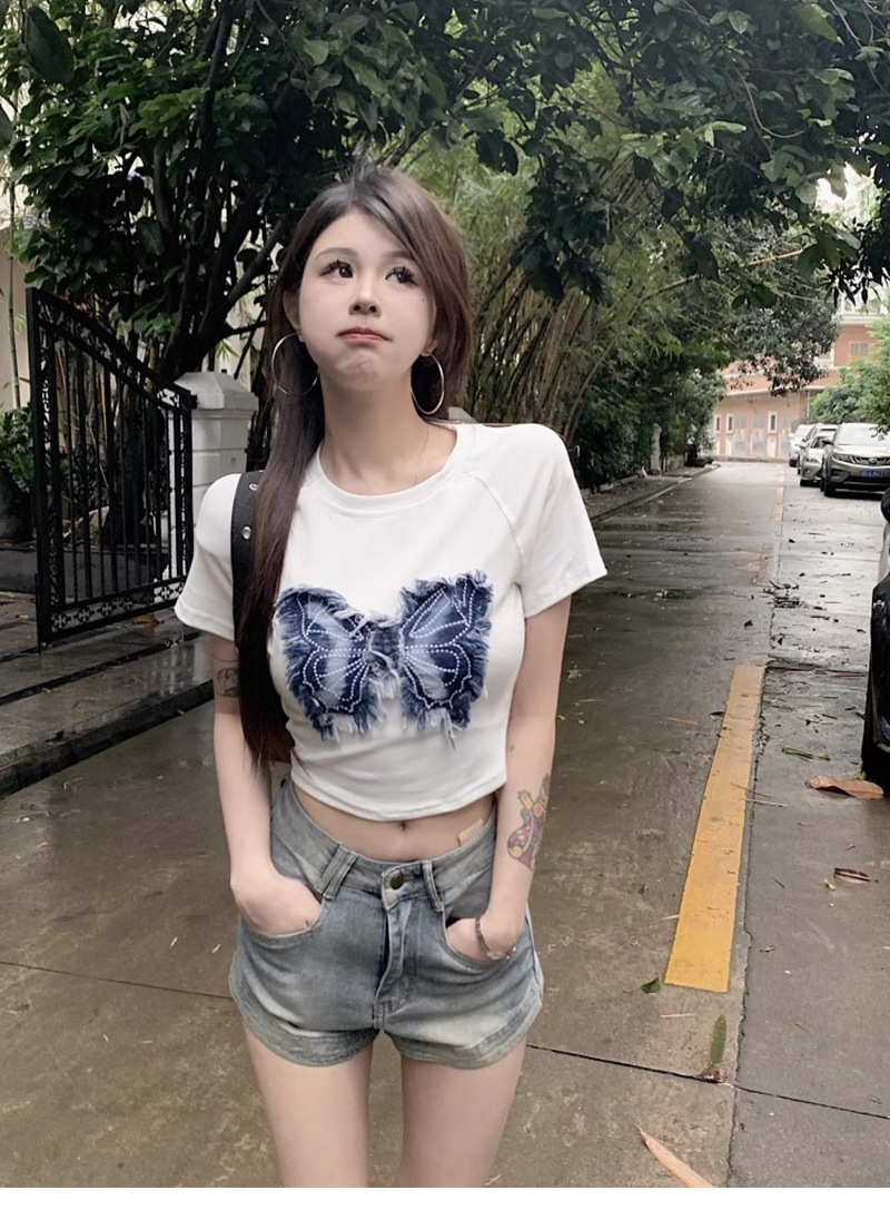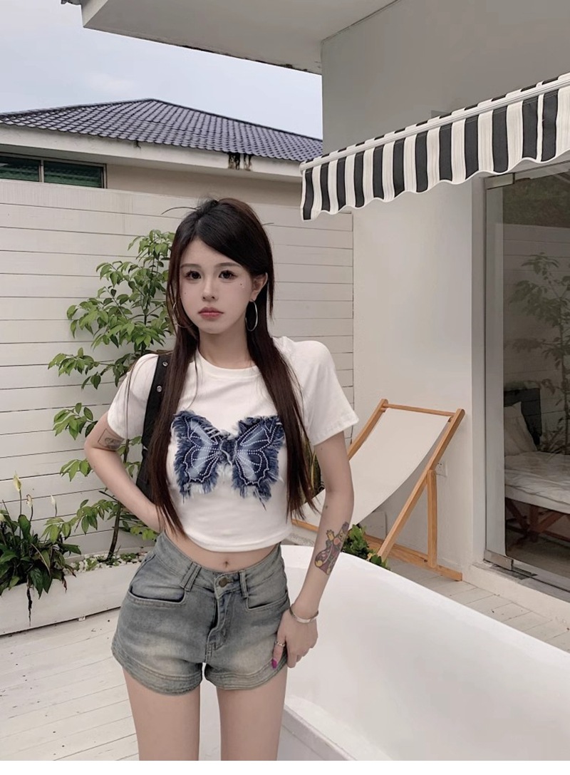 아메리칸 스타일 3 차원 나비 어깨 슬림 핏 짧은 티셔츠 여성용 여름 기능성 핫 걸 디자인 센스 반팔 탑 옷스토어 가기