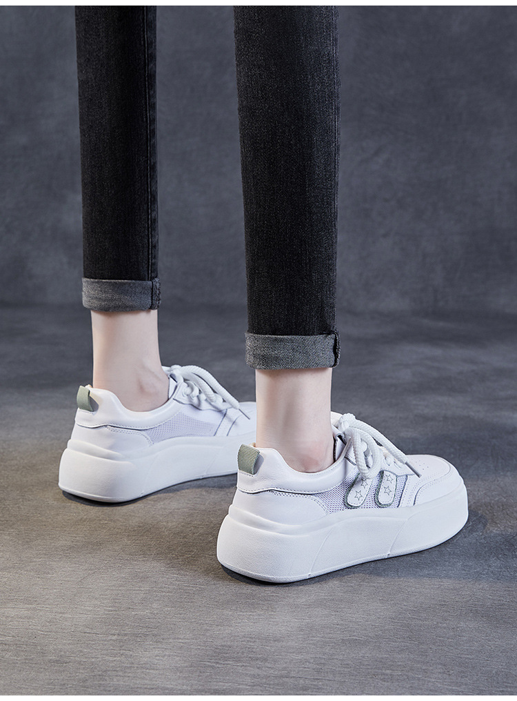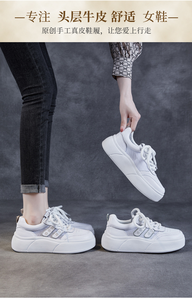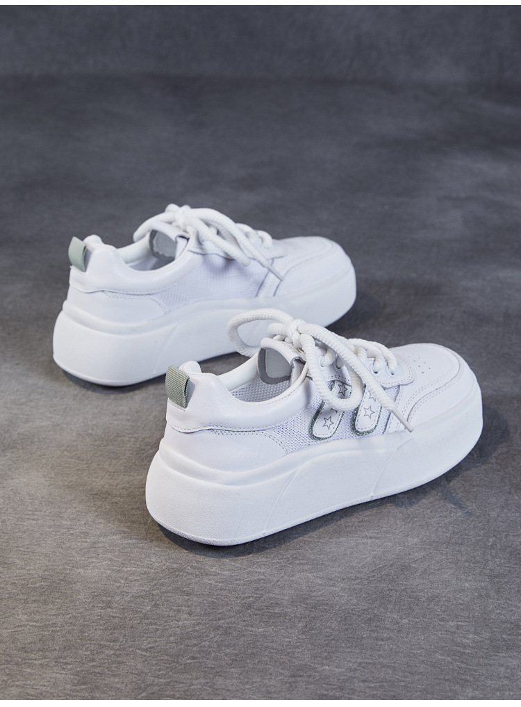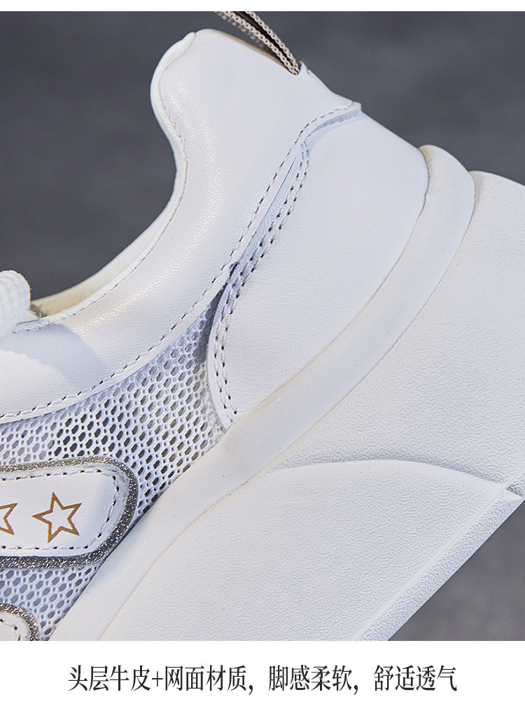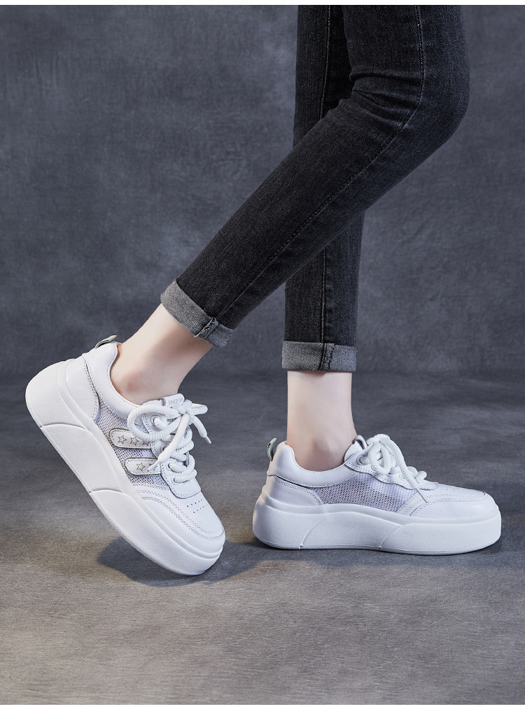 여름 정품 가죽 통기성 메시 화이트 신발 여성 두꺼운 밑창 상승 2024 새로운 한국식 올매치 스포츠 캐주얼 스니커즈