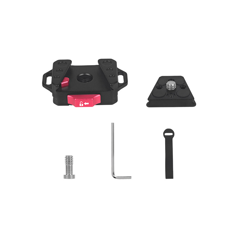 D. 快装座与快装板均有英制1/4阿莱定位孔,可安装带1/4螺杆的阿莱定位柱配件,亦可配合D3.0mm定位柱,用于1/4阿莱定位孔中,也可配合D5.0定位柱,用于孔距为9mm的两个1/4螺孔中安装,防止反转;中间1/4螺孔固定,配有1/4快装螺丝,适用带有1/4螺孔设备及相关配件;