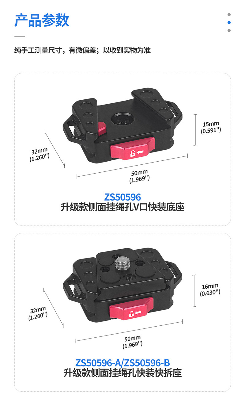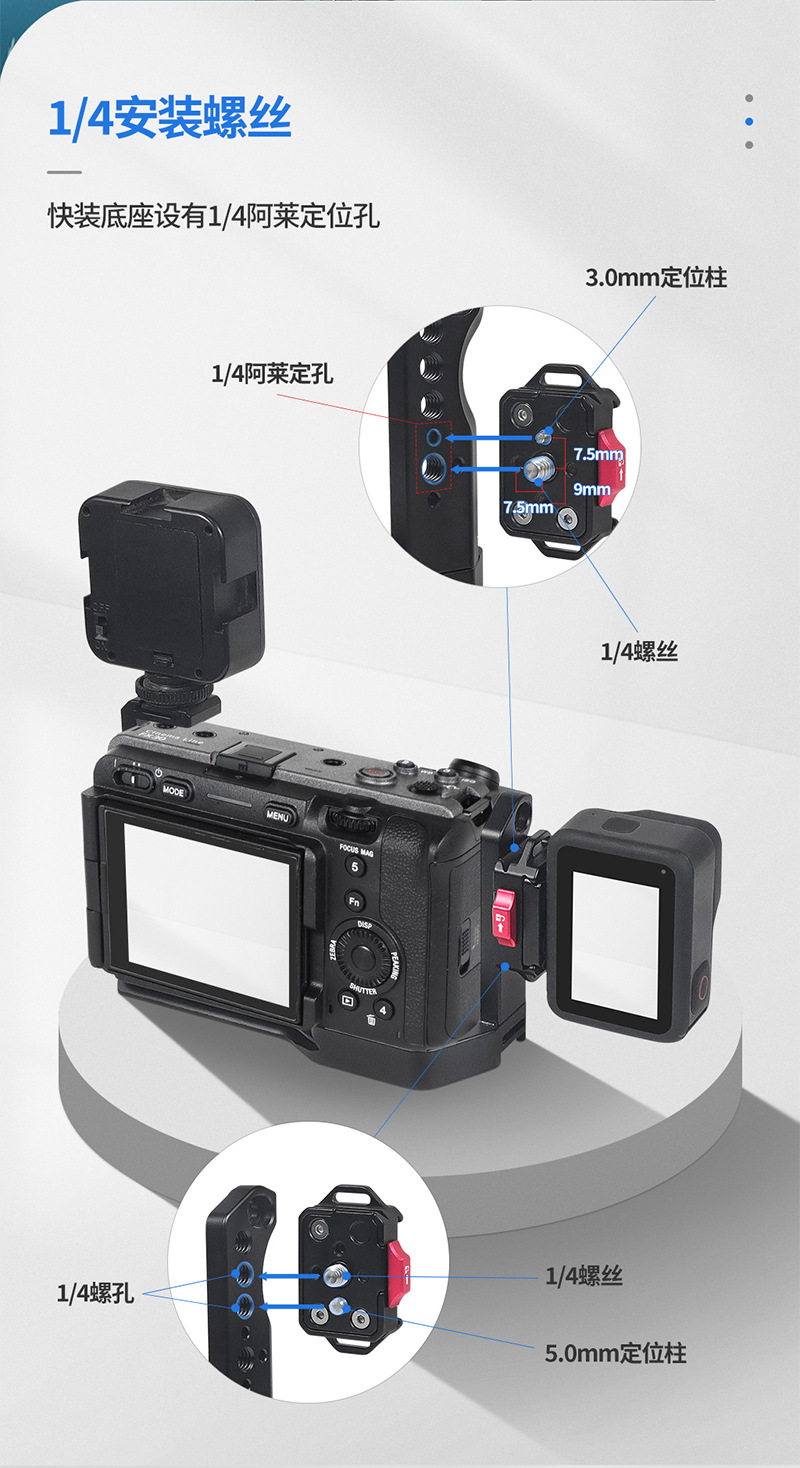 D、快装座与快装板均有英制1/4阿莱定位孔,可安装带1/4螺杆的阿莱定位柱配件,亦可配合D3.0mm定位柱,用于1/4阿莱定位孔中,也可配合D5.0定位柱,用于孔距为9mm的两个1/4螺孔中安装,防止反转;中间1/4螺孔固定,配有1/4快装螺丝,适用带有1/4螺孔设备及相关配件;