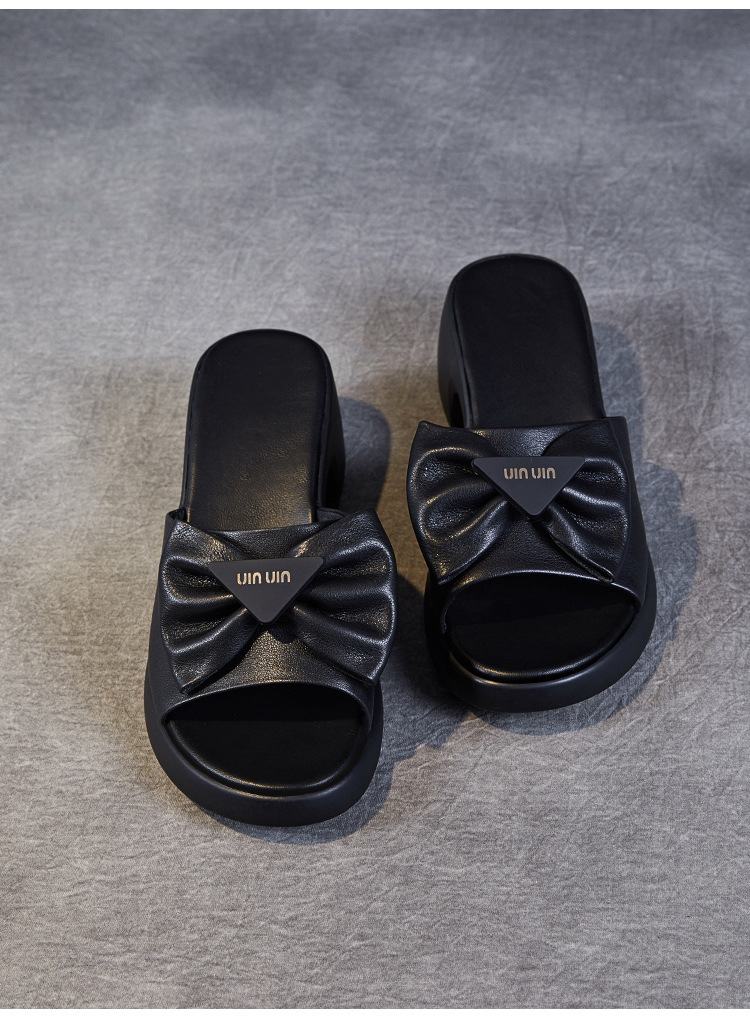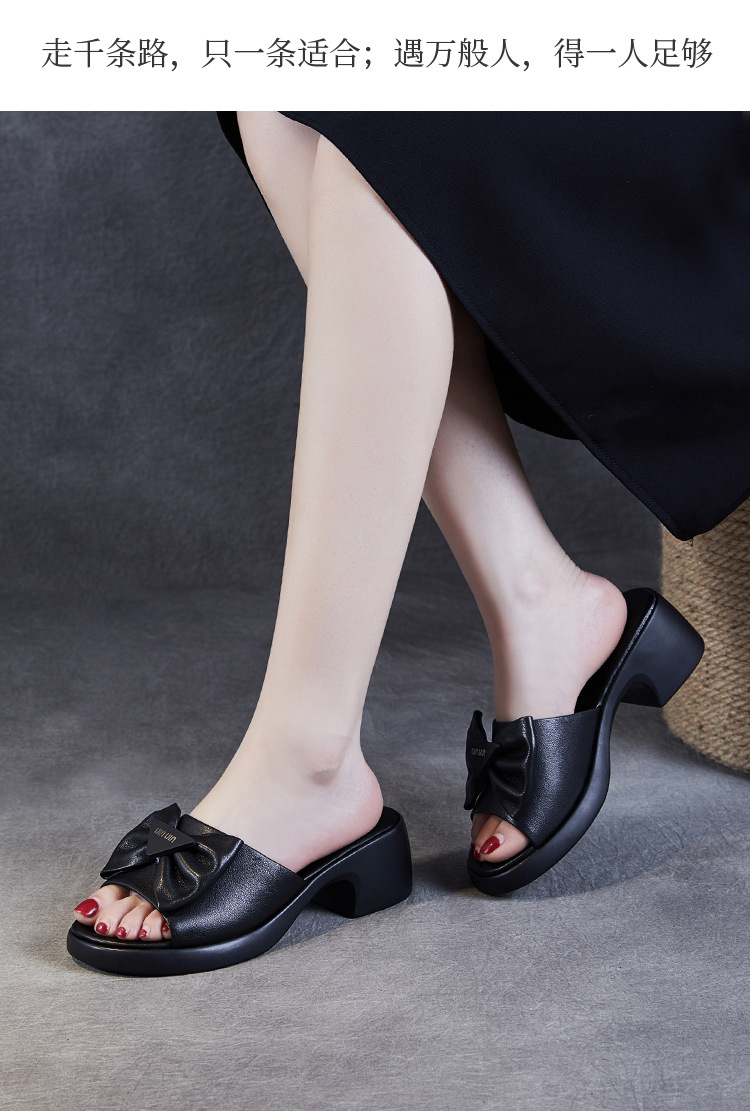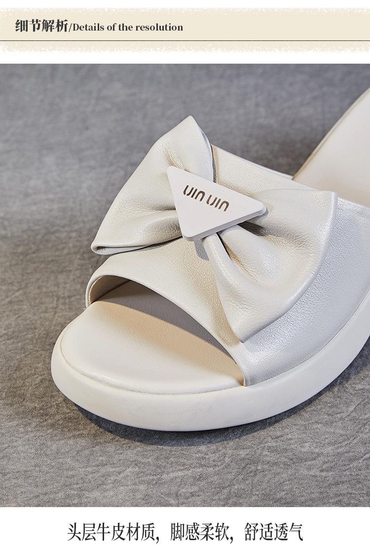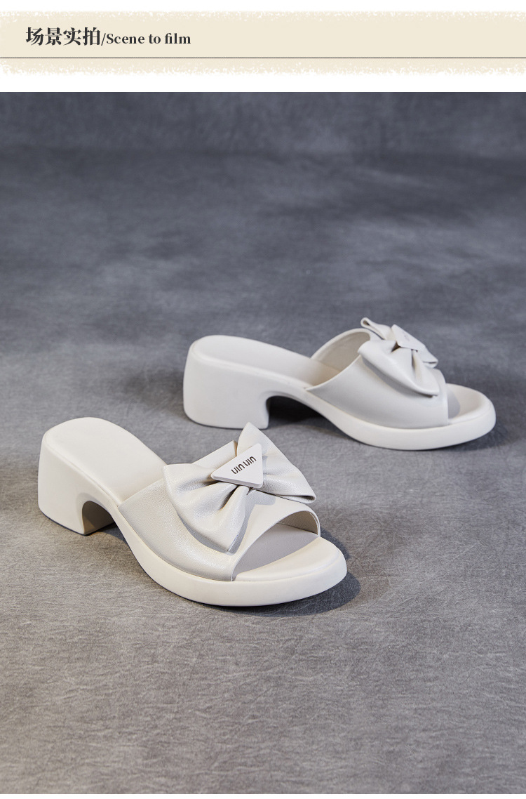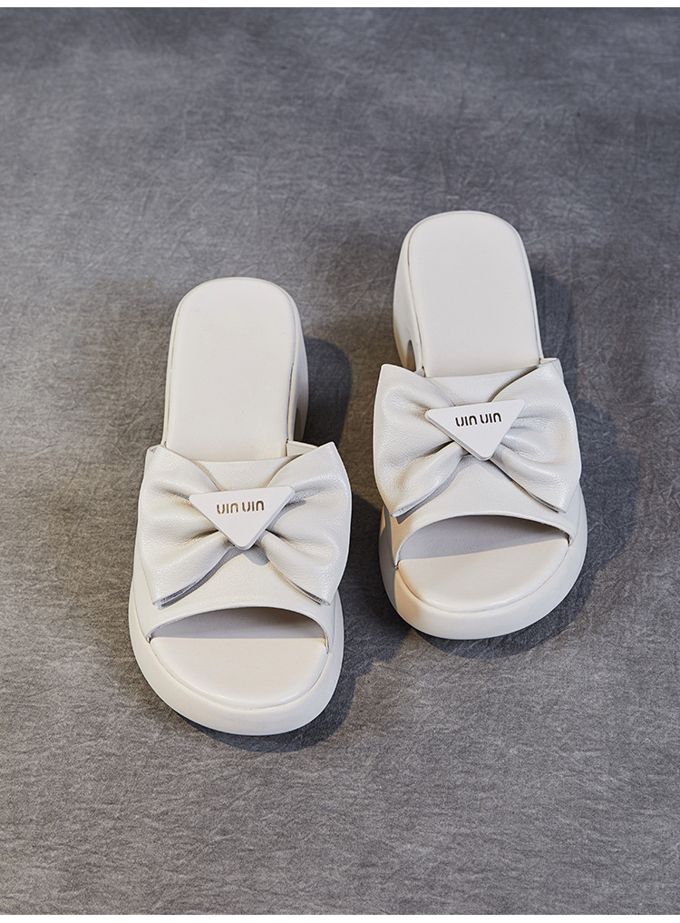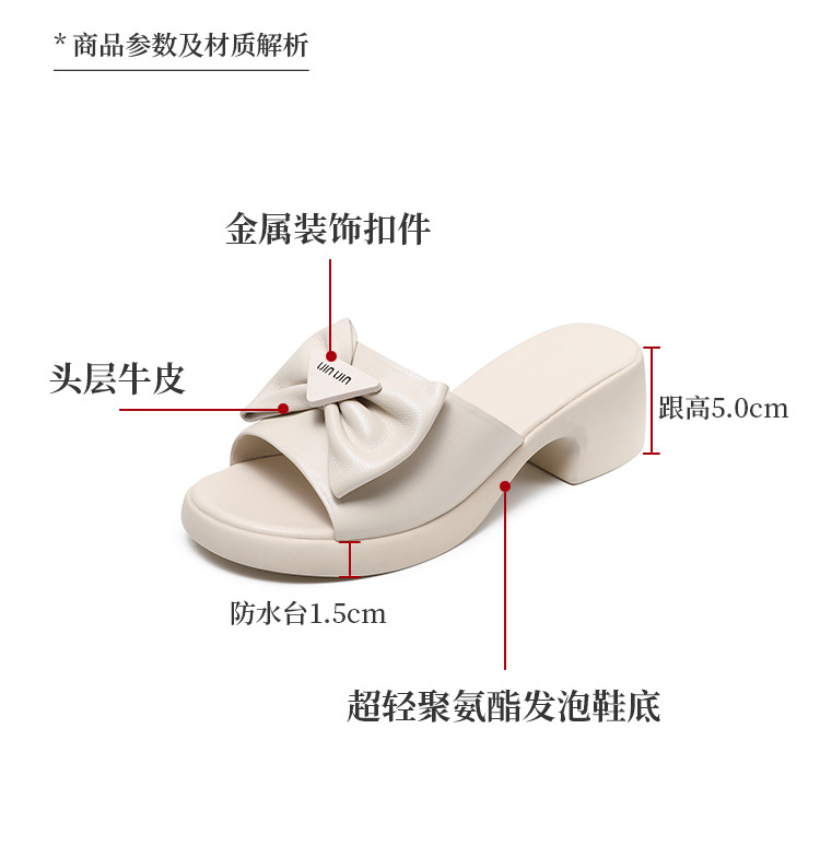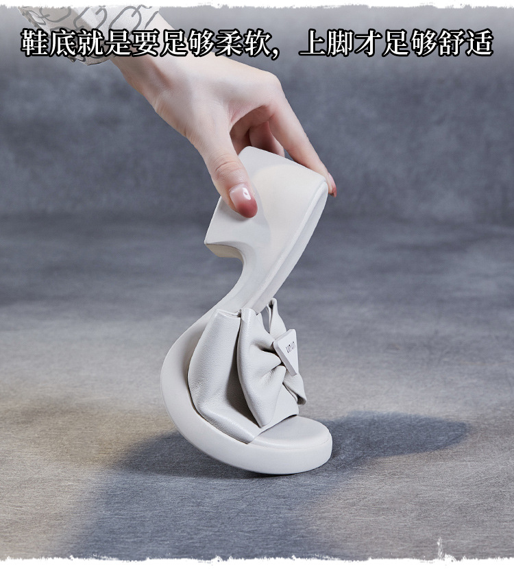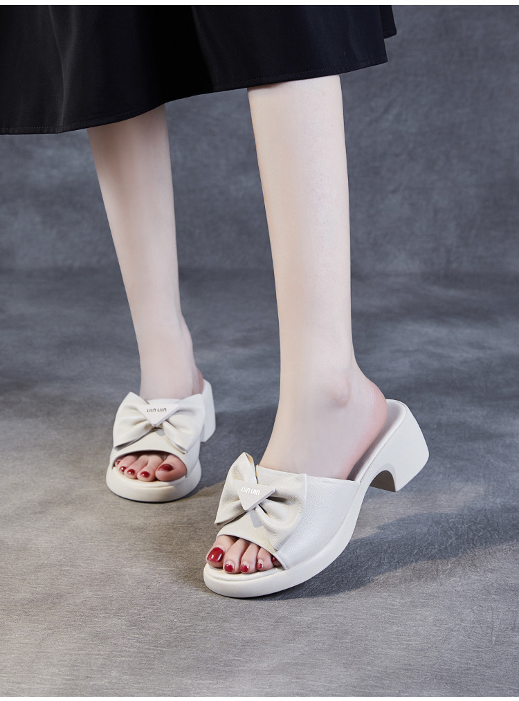 첫 번째 레이어 Cowhide Bow 슬리퍼 여성의 여름 외부 착용 하이힐 2024 새로운 스타일 정품 가죽 두꺼운 두꺼운 밑바닥 슬라이드 샌들