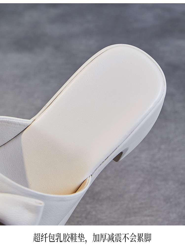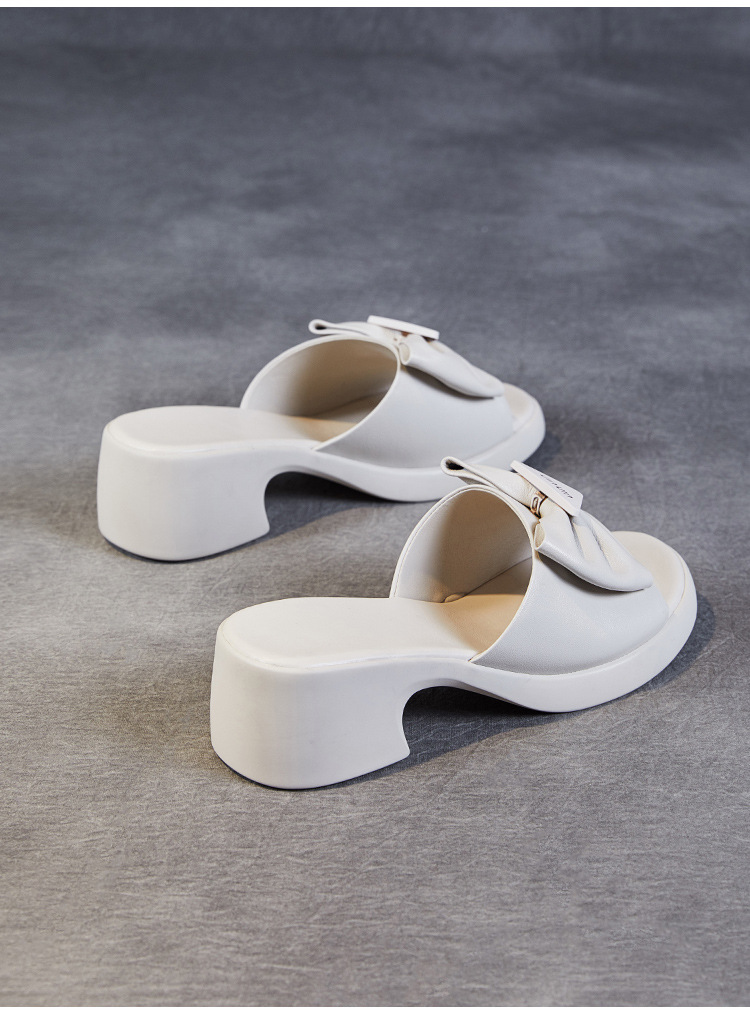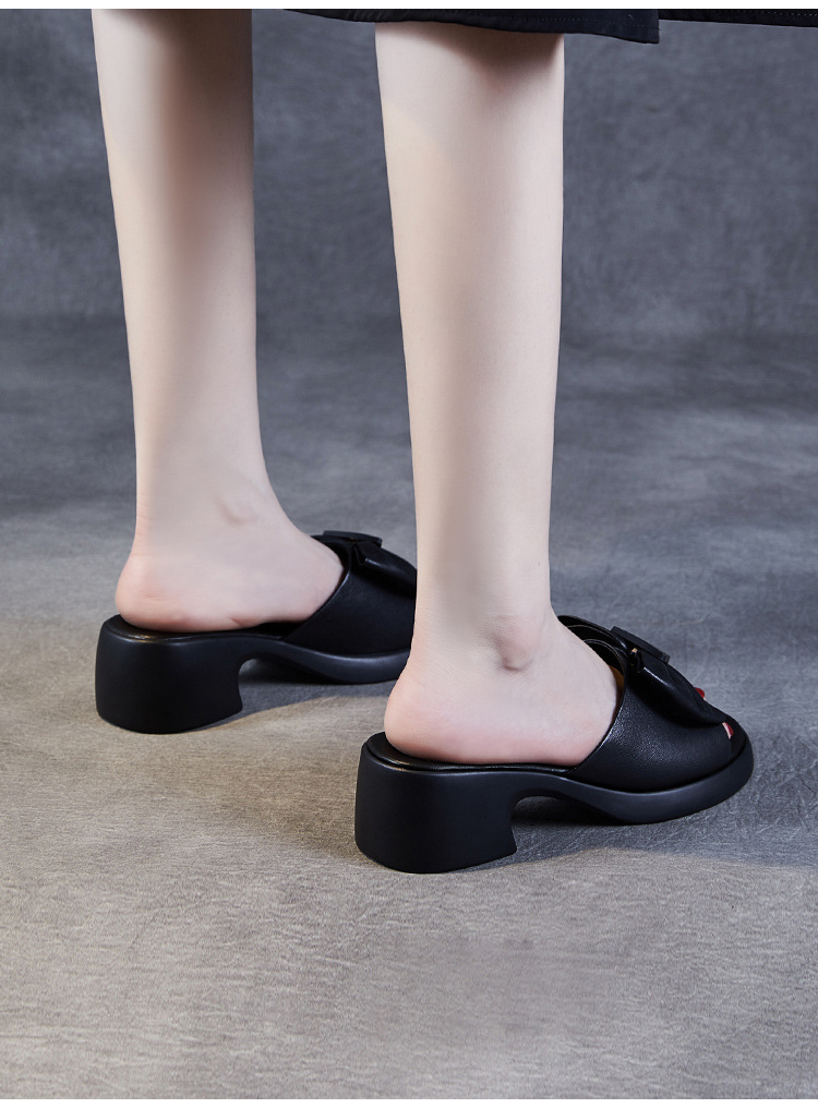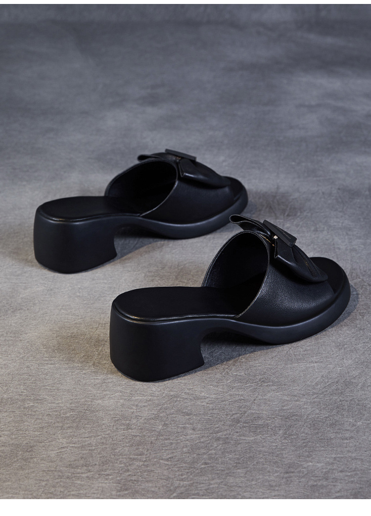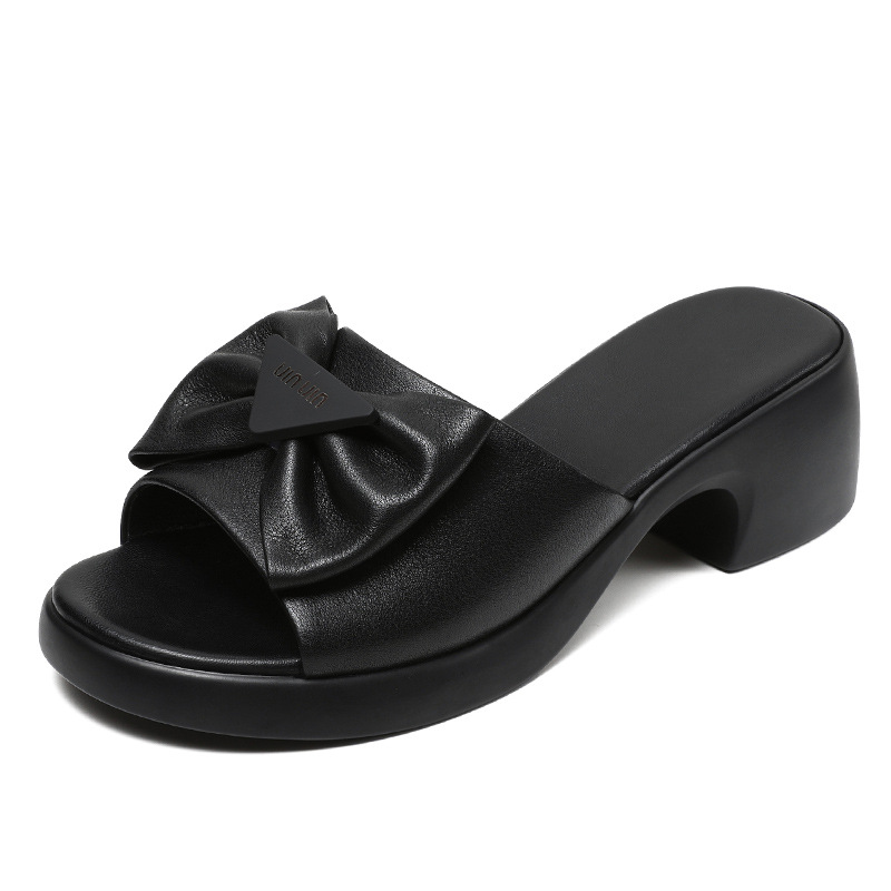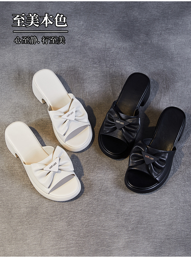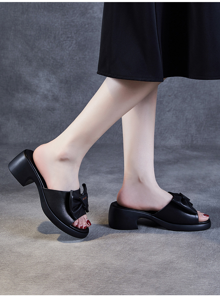 첫 번째 레이어 Cowhide Bow 슬리퍼 여성의 여름 외부 착용 하이힐 2024 새로운 스타일 정품 가죽 두꺼운 두꺼운 밑바닥 슬라이드 샌들
