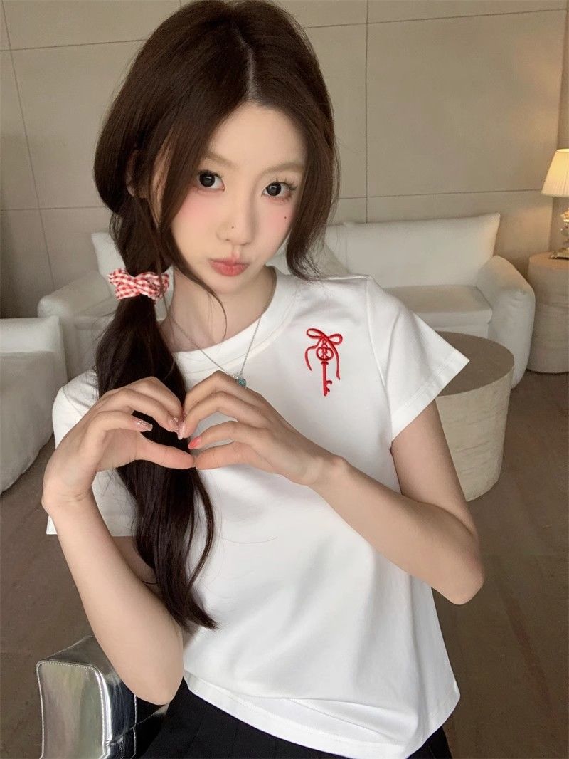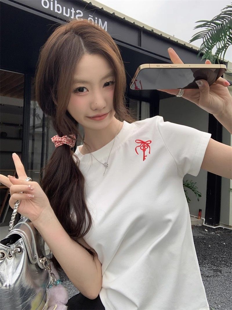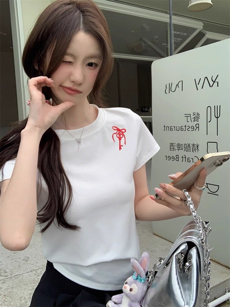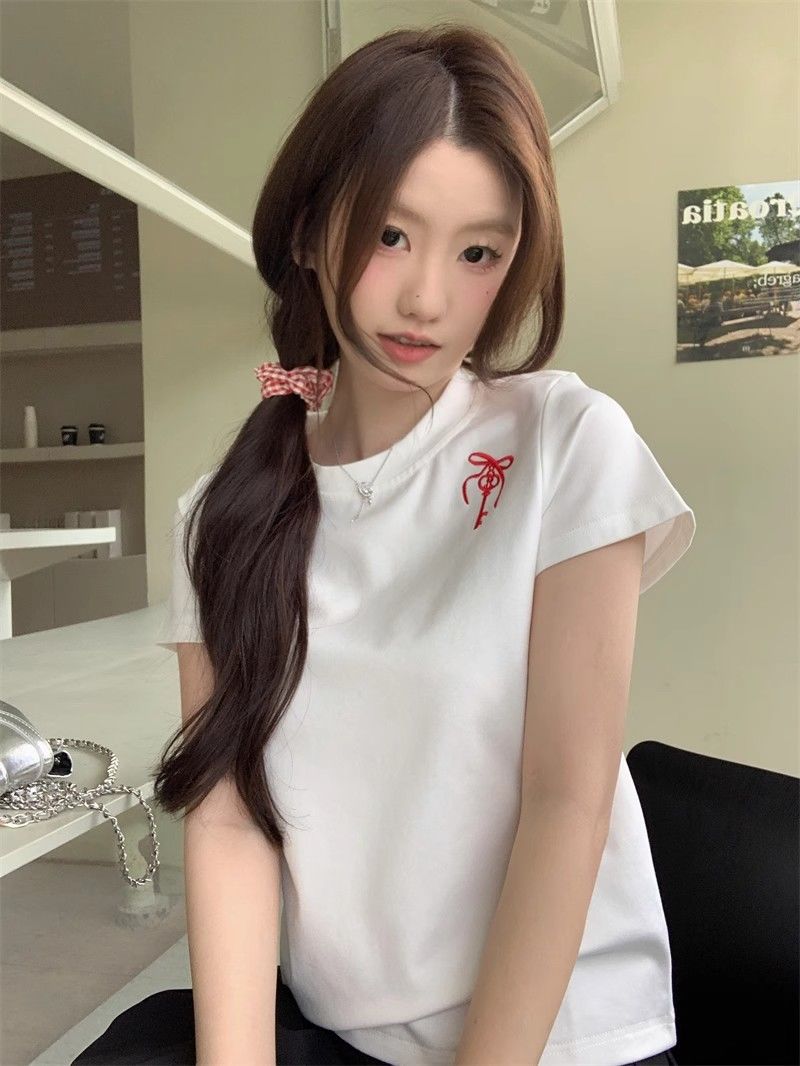 화이트 숄더 반팔 티셔츠 여성용 여름 새 도착 활 수 놓은 쇼트 탑 스파이스 걸스베이스 셔츠스토어 가기