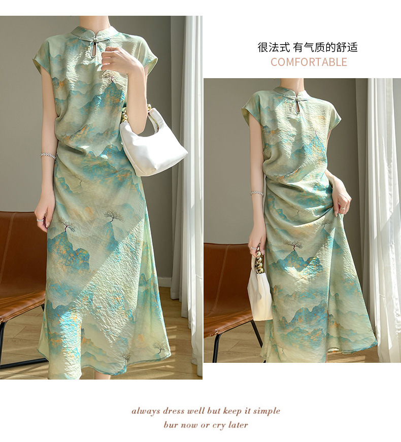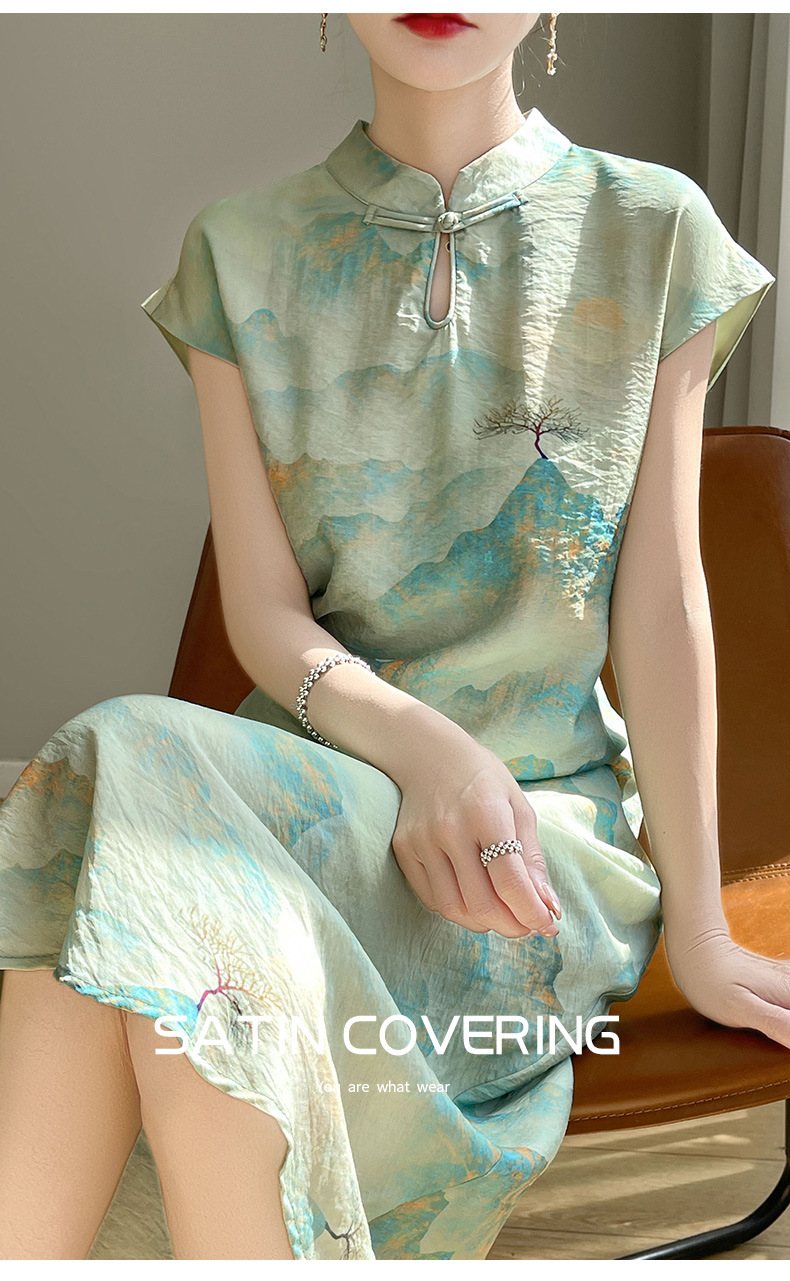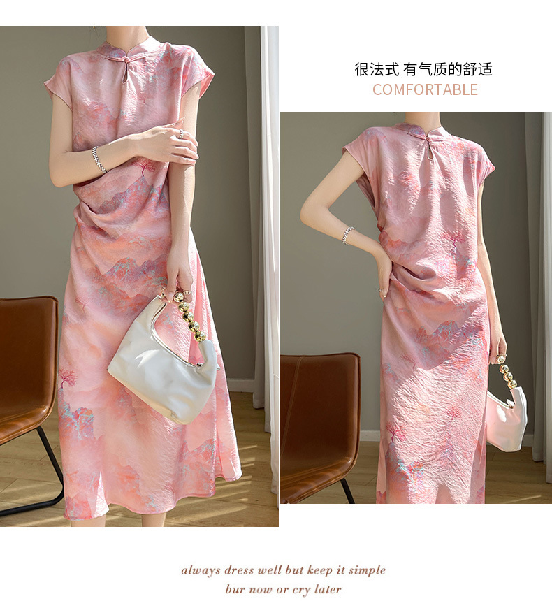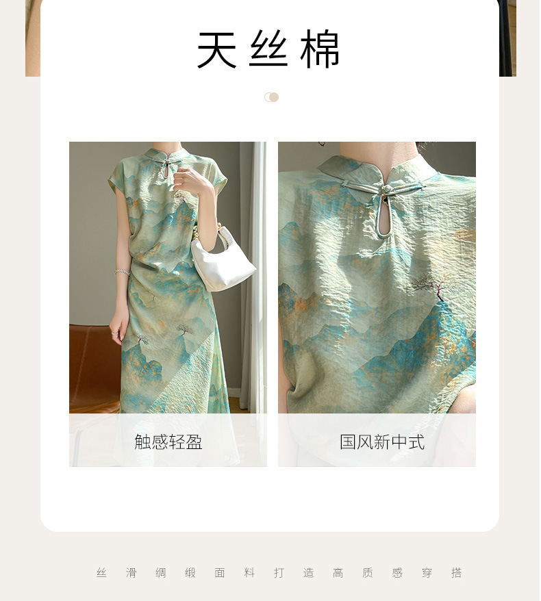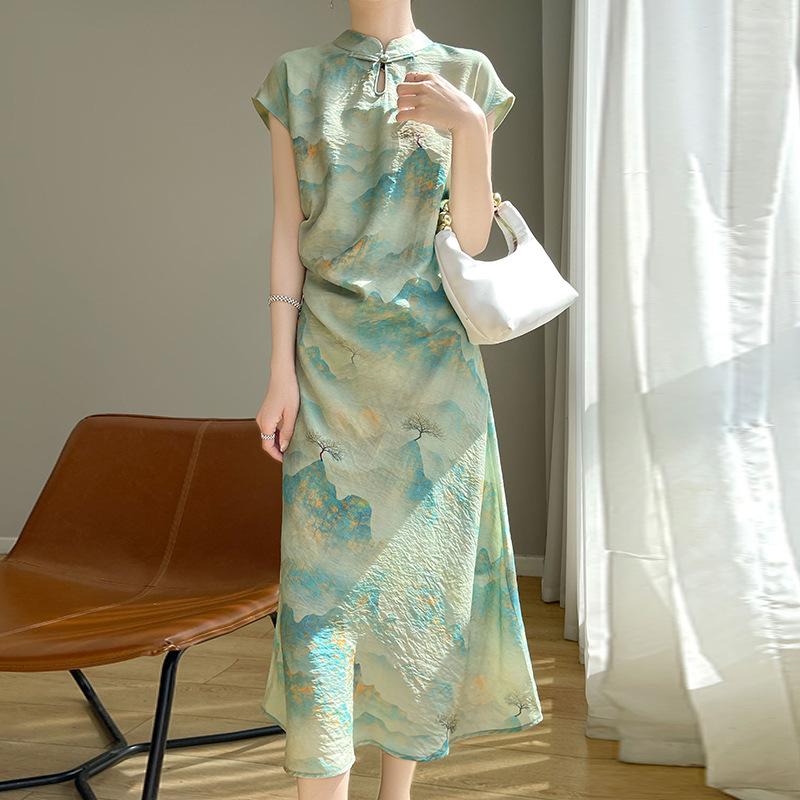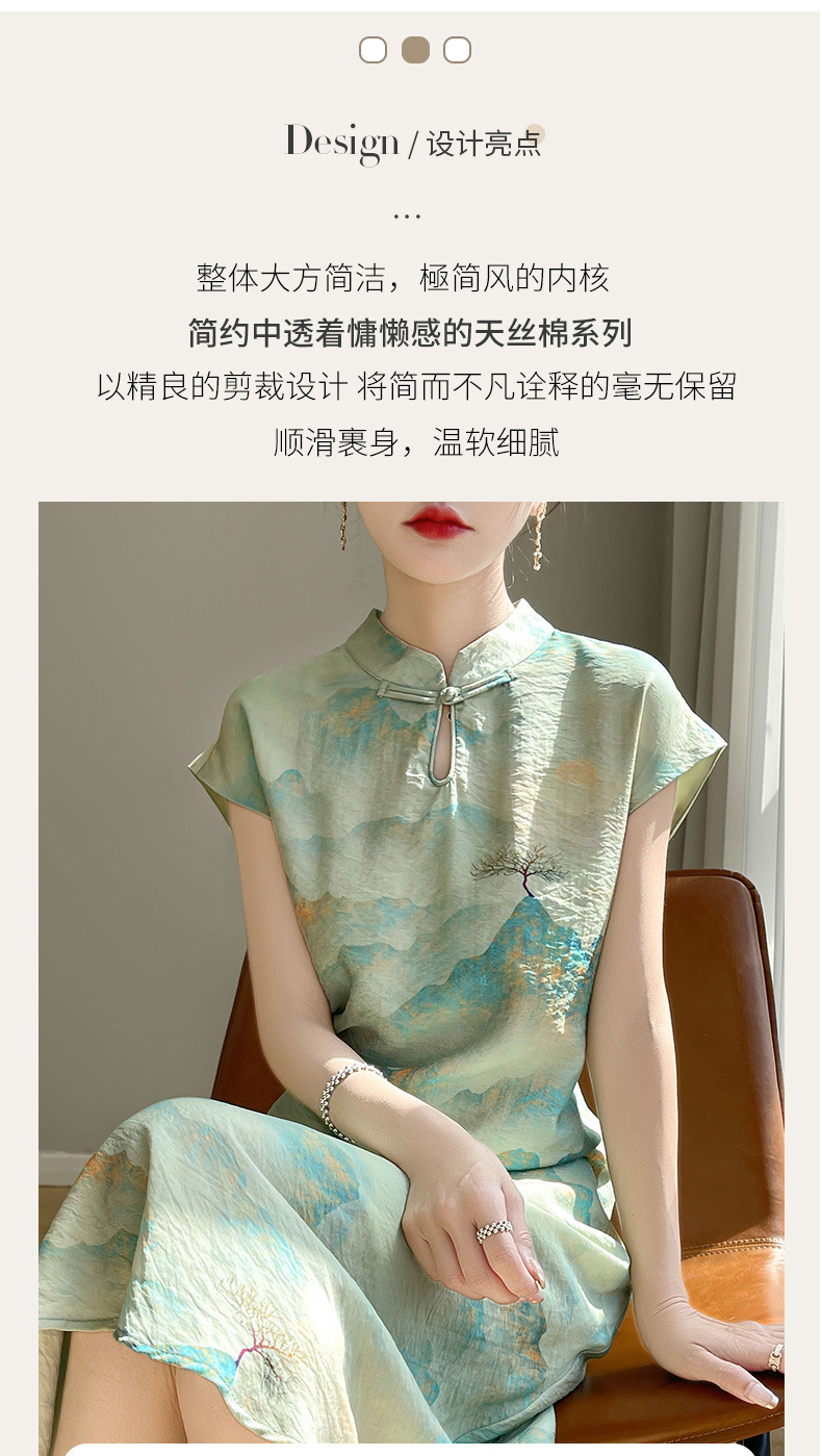빈티지 새로운 중국 스타일 Tancel 코튼 원피스 여성 하이 엔드 스타일 수직 칼라 버클 내셔널 스타일 인쇄 중간 길이베이스 원피스스토어 가기
