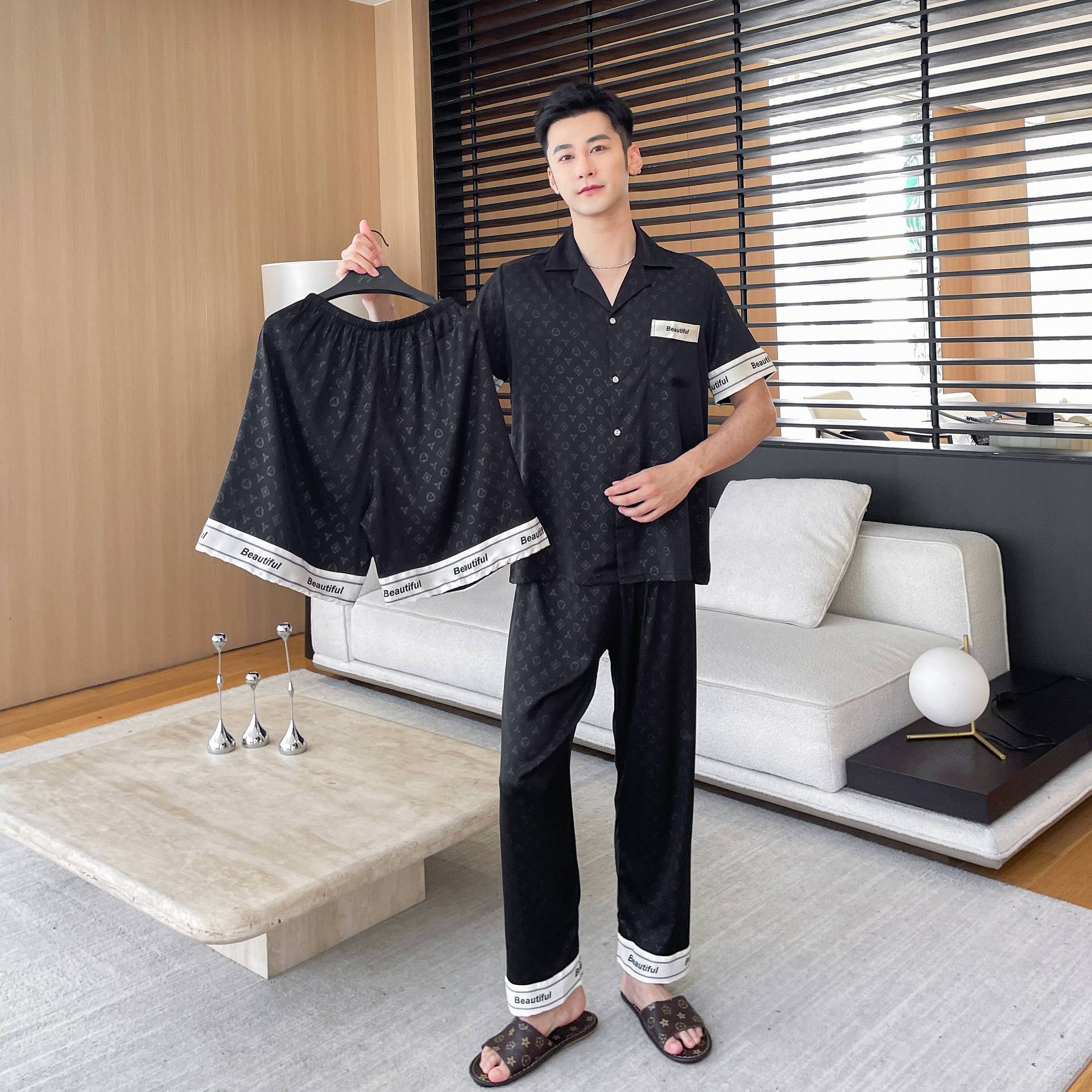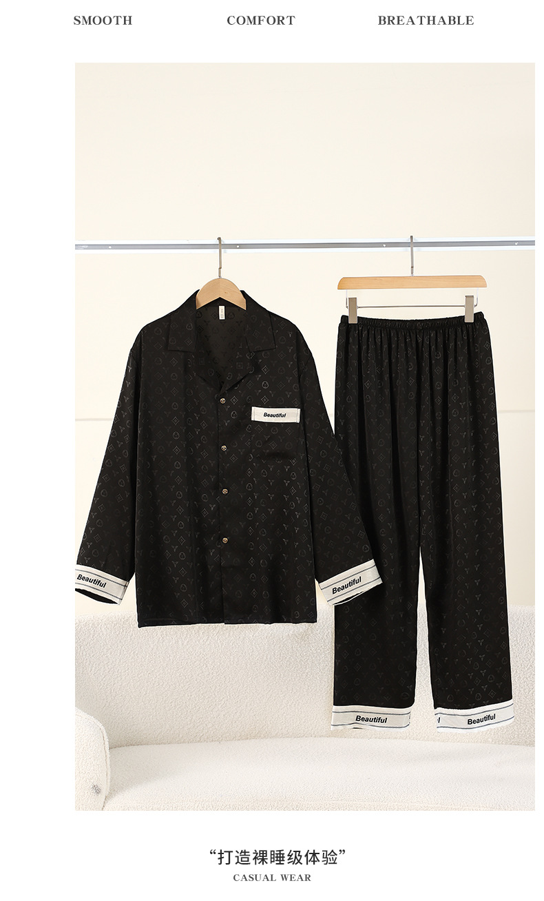 새로운 도착 블랙 커플 잠옷 여성의 봄과 가을 아이스 실크 긴팔 모방 실크 여름 홈 의류 빅 브랜드 스타일 남성 세트